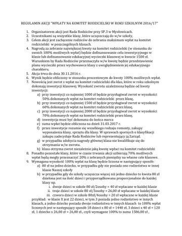 REGULAMIN AKCJI "WPŁATY NA KOMITET RODZICIELSKI W ROKU SZKOLNYM 2016/17" 1. Organizatorem akcji jest Rada Rodziców przy SP.3 w Mysłowicach. 2. Uczestnikami są wszystkie klasy, które uczęszczają do w/w szkoły, 3. Celem akcji jest zachęcenie rodziców do zebrania maksimum wpłat na komitet rodzicielski w poszczególnych klasach. 4. Nagrodą za zebranie największej kwoty na komitet rodzicielski (w stosunku do swoich 100% możliwych wpłat) będzie dofinansowanie celu inwestycyjnego w klasie lub dofinansowanie edukacyjnej wycieczki klasowej w kwocie 1500 zł. Warunkiem by Rada Rodziców przeznaczyła w/w kwotę będzie przedstawienie planu wycieczki przez wychowawce klasy z uwzględnieniem jej edukacyjnego charakteru. 5. Akcja trwa do dnia 30.11.2016 r. 6. Wynik będzie obliczony w stosunku procentowym do kwoty 100% możliwych wpłat. 7. Nowością jest zwrot z wpłat na komitet rodzicielski dla klas, które w roku szkolnym dokonają inwestycji klasowej. Wysokość zwrotu uzależniona będzie od kwoty inwestycji: a) przy inwestycji co najmniej 1000 zł będzie przysługiwał zwrot w wysokości 50% dokonanych wpłat na komitet rodzicielski przez klasę, b) przy inwestycji co najmniej 1500 zł będzie przysługiwał zwrot w wysokości 60% dokonanych wpłat na komitet rodzicielski przez klasę, c) przy inwestycji co najmniej 2000 zł będzie przysługiwał zwrot w wysokości 70% dokonanych wpłat na komitet rodzicielski przez klasę, d) inwestycja musi być dokonana do końca marca e) suma wpłat będzie obliczona na dzień 31.03.2017 r. f) przez inwestycje rozumie się wszelkiego rodzaju remonty, zakupy wyposażenia klasy, sprzętu dla klasy. W sprawach spornych o klasyfikacji zakupu zadecyduje Rada Rodziców lub reprezentujący ją Zarząd. g) w przypadku zdobycia nagrody głównej klasa nie kwalifikuje się do otrzymania w/w zwrotu. h) klasa otrzyma zwrot niezależnie jaką kwotę wpłaci na komitet rodzicielski 8. Ponadto pozostałe klasy, które w czasie trwania akcji uzbierają 70% możliwych wpłat będą mogły przeznaczyć 20% z zebranych pieniędzy na własne cele klasowe. 9. Wymagana wysokość 100% wpłat na klasę będzie liczona w następujący sposób: a) 80 zł na jedno dziecko, w przypadku gdy nie posiada ono rodzeństwa w innej klasie Naszej szkoły b) w przypadku gdy do szkoły uczęszcza więcej niż jedno dziecko to kwota 80 zł dzielona jest na ilość dzieci i przyporządkowana proporcjonalnie do każdej klasy np. i. dwoje dzieci w szkole 80 zł/2osoby = 40 zł wpłacane w każdej klasie ii. troje dzieci w szkole 80 zł/3osoby = 26,00 zł wpłacane w każdej klasie iii. czworo dzieci w szkole 80zł/4osoby = 20 zł wpłacane w każdej klasie przykład: w klasie X jest 22 dzieci, w tym 3 posiada jedno rodzeństwo w innych klasach, a jedno dziecko posiada dwoje rodzeństwa w innych klasach to 100% wpłat liczonych jest w następujący sposób 18 dzieci x 80 zł = 1440 zł, 3 dzieci x 40 zł = 120 zł, 1 dziecko x 26,00 zł = 26,00 zł., czyli wymagane 100% to suma 1586,00 zł , c) w przypadku wpłat wyższych niż obliczone 100% klasa otrzyma dofinansowanie również od nadwyżki wpłat. 10. Wyliczenie poprawnej kwoty wymaganej dla każdej klasy spoczywa na poszczególnych klasach i w przypadku wniosku o dofinansowanie zostanie zweryfikowana przez Radę Rodziców szkoły lub reprezentujący ją Zarząd. 11. W przypadku gdy klasa nie uzbiera wymaganych 70% wpłat do dnia 30.11.16 r. nie może uczestniczyć w akcji i nie kwalifikuje się do dofinansowania w wysokości określonej w punkcie 8. 12. Klasy, które zakwalifikowały się do akcji po weryfikacji poprawności wpłat mogą niezwłocznie ubiegać się o dofinansowanie na swoje cele klasowe. 13. Wnioski powinny być kierowane na skrzynkę pocztową sp3.radarodzicó[email protected] lub przekazywane przez przewodniczących klas na zebraniach Rady Rodziców. Po pozytywnym zaopiniowaniu przez Radę Rodziców lub reprezentujący ją Zarząd będą dofinansowane z puli środków przyznanych w w/w akcji. 14. W przypadku gdy cel dofinansowania jest sporny, organem rozstrzygającym jest Rada Rodziców, która podejmie decyzję podczas najbliższego spotkania. 15. Środki muszą być wykorzystane do końca roku szkolnego 2016/2017 czyli do ostatniego dnia szkoły przed wakacjami. Niewykorzystane środki przechodzą do ogólnej kasy Rady Rodziców, do dyspozycji w kolejnym roku szkolnym. 16. W sprawach spornych i nieuregulowanych ostateczną decyzję podejmuje Rada Rodziców lub reprezentujący ją Zarząd.