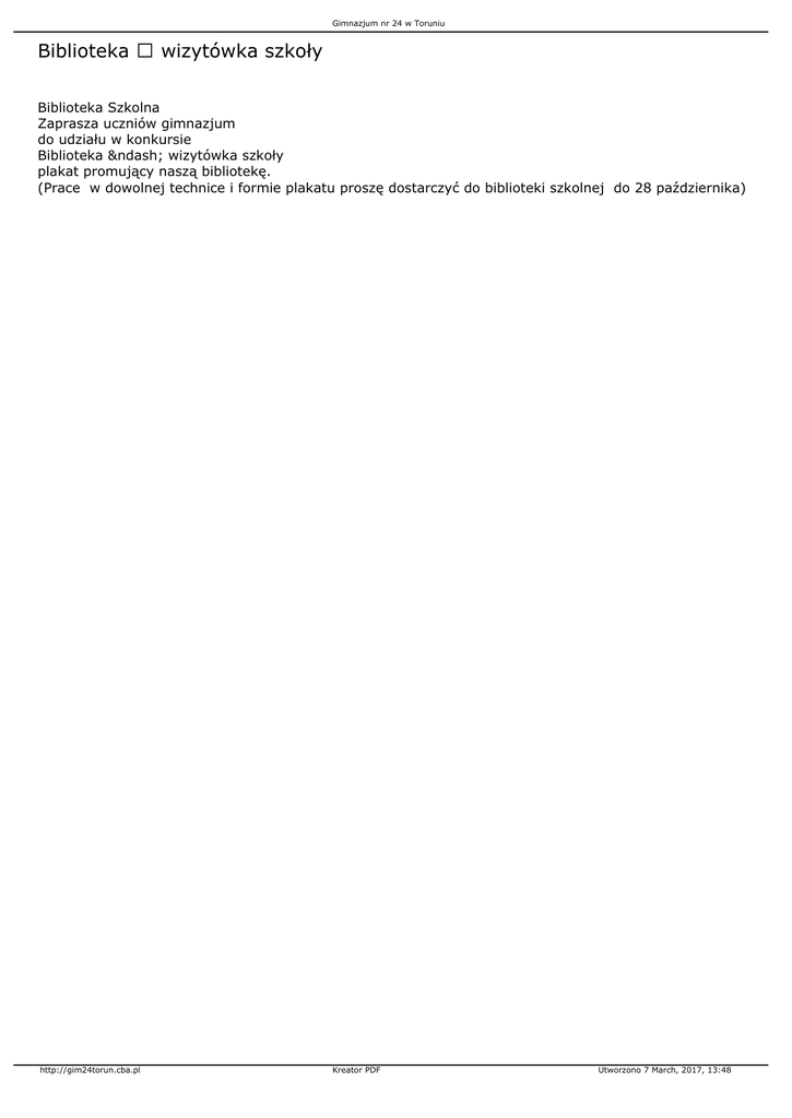 Gimnazjum nr 24 w Toruniu Biblioteka wizytówka szkoły Biblioteka Szkolna Zaprasza uczniów gimnazjum do udziału w konkursie Biblioteka – wizytówka szkoły plakat promujący naszą bibliotekę. (Prace w dowolnej technice i formie plakatu proszę dostarczyć do biblioteki szkolnej do 28 października) http://gim24torun.cba.pl Kreator PDF Utworzono 7 March, 2017, 13:48