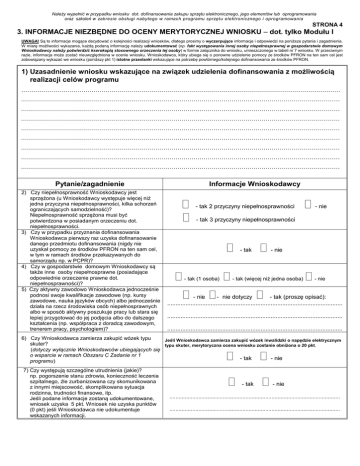 Należy wypełnić w przypadku wniosku dot. dofinansowania zakupu sprzętu elektronicznego, jego elementów lub oprogramowania oraz szkoleń w zakresie obsługi nabytego w ramach programu sprzętu elektronicznego i oprogramowania STRONA 4 3. INFORMACJE NIEZBĘDNE DO OCENY MERYTORYCZNEJ WNIOSKU – dot. tylko Modułu I UWAGA! Są to informacje mogące decydować o kolejności realizacji wniosków, dlatego prosimy o wyczerpujące informacje i odpowiedzi na poniższe pytania i zagadnienia. W miarę możliwości wykazania, każdą podaną informację należy udokumentować (np. fakt występowania innej osoby niepełnosprawnej w gospodarstwie domowym Wnioskodawcy należy potwierdzić kserokopią stosownego orzeczenia tej osoby) w formie załącznika do wniosku, umieszczonego w tabeli nr 7 wniosku. W przeciwnym razie, informacja może zostać nieuwzględniona w ocenie wniosku. Wnioskodawca, który ubiega się o ponowne udzielenie pomocy ze środków PFRON na ten sam cel jest zobowiązany wykazać we wniosku (poniższy pkt 1) istotne przesłanki wskazujące na potrzebę powtórnego/kolejnego dofinansowania ze środków PFRON. 1) Uzasadnienie wniosku wskazujące na związek udzielenia dofinansowania z możliwością realizacji celów programu …………………………………………………………………………………………………………………………………………… …………………………………………………………………………………………………………………………………………… …………………………………………………………………………………………………………………………………………… …………………………………………………………………………………………………………………………………………… …………………………………………………………………………………………………………………………………………… …………………………………………………………………………………………………………………………………………… …………………………………………………………………………………………………………………………………………… …………………………………………………………………………………………………………………………………………… …………………………………………………………………………………………………………………………………………… Pytanie/zagadnienie 2) Czy niepełnosprawność Wnioskodawcy jest sprzężona (u Wnioskodawcy występuje więcej niż jedna przyczyna niepełnosprawności, kilka schorzeń ograniczających samodzielność)? Niepełnosprawność sprzężona musi być potwierdzona w posiadanym orzeczeniu dot. niepełnosprawności. 3) Czy w przypadku przyznania dofinansowania Wnioskodawca pierwszy raz uzyska dofinansowanie danego przedmiotu dofinansowania (nigdy nie uzyskał pomocy ze środków PFRON na ten sam cel, w tym w ramach środków przekazywanych do samorządu np. w PCPR)? 4) Czy w gospodarstwie domowym Wnioskodawcy są także inne osoby niepełnosprawne (posiadające odpowiednie orzeczenie prawne dot. niepełnosprawności)? 5) Czy aktywny zawodowo Wnioskodawca jednocześnie podnosi swoje kwalifikacje zawodowe (np. kursy zawodowe, nauka języków obcych) albo jednocześnie działa na rzecz środowiska osób niepełnosprawnych albo w sposób aktywny poszukuje pracy lub stara się lepiej przygotować do jej podjęcia albo do dalszego kształcenia (np. współpraca z doradcą zawodowym, trenerem pracy, psychologiem)? Informacje Wnioskodawcy - tak 2 przyczyny niepełnosprawności - nie - tak 3 przyczyny niepełnosprawności - tak - nie - tak (1 osoba) - tak (więcej niż jedna osoba) - nie - nie - nie dotyczy - tak (proszę opisać): ......................................................................................................... ......................................................................................................... ......................................................................................................... 6) Czy Wnioskodawca zamierza zakupić wózek typu Jeśli Wnioskodawca zamierza zakupić wózek inwalidzki o napędzie elektrycznym skuter? typu skuter, merytoryczna ocena wniosku zostanie obniżona o 20 pkt. (dotyczy wyłącznie Wnioskodawców ubiegających się o wsparcie w ramach Obszaru C Zadanie nr 1 - tak - nie programu) 7) Czy występują szczególne utrudnienia (jakie)? np. pogorszenie stanu zdrowia, konieczność leczenia szpitalnego, źle zurbanizowana czy skomunikowana z innymi miejscowość, skomplikowana sytuacja rodzinna, trudności finansowe, itp. Jeśli podane informacje zostaną udokumentowane, wniosek uzyska 5 pkt. Wniosek nie uzyska punktów (0 pkt) jeśli Wnioskodawca nie udokumentuje wskazanych informacji. - tak - nie ................................................................................................................ ................................................................................................................ 4. Specyfikacja przedmiotu dofinansowania - Moduł I/Obszar B/Zadanie nr 1 oraz nr 2 Zadanie nr 1 - specyf ikacja z akupu - p roszę wymienić sprzęt elektroniczny, o dofinansowanie którego Wnioskodawca ubiega się w ramach niniejszego wniosku – nazwy sprzętu specjalistycznego/urządzeń/ oprogramowania: STRONA 5 ORIENTACYJNA CENA brutto (kwota w zł) Sprzęt elektroniczny: Elementy sprzętu elektronicznego: Oprogramowanie: R AZ E M Zadanie nr 2 - specyf ikacja - p roszę wymienić zakres tematyczny i liczbę godzin wnioskowanego szkolenia komputerowego, o dofinansowanie którego Wnioskodawca ubiega się w ramach niniejszego wniosku, nazwę podmiotu prowadzą