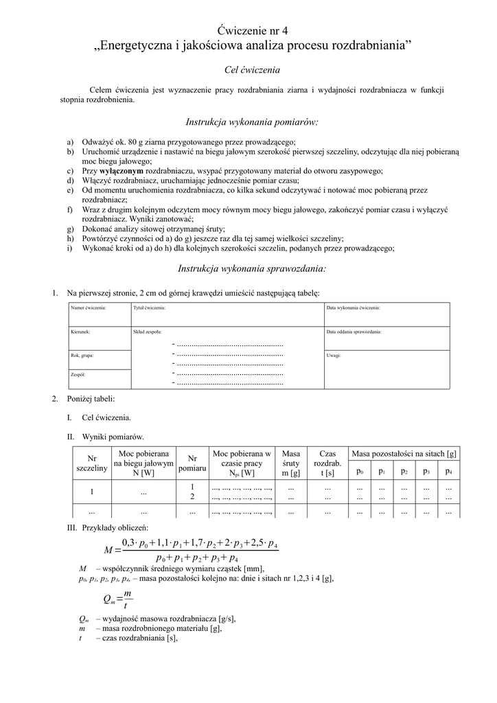 Ćwiczenie nr 4 „Energetyczna i jakościowa analiza procesu rozdrabniania” Cel ćwiczenia Celem ćwiczenia jest wyznaczenie pracy rozdrabniania ziarna i wydajności rozdrabniacza w funkcji stopnia rozdrobnienia. Instrukcja wykonania pomiarów: a) Odważyć ok. 80 g ziarna przygotowanego przez prowadzącego; b) Uruchomić urządzenie i nastawić na biegu jałowym szerokość pierwszej szczeliny, odczytując dla niej pobieraną moc biegu jałowego; c) Przy wyłączonym rozdrabniaczu, wsypać przygotowany materiał do otworu zasypowego; d) Włączyć rozdrabniacz, uruchamiając jednocześnie pomiar czasu; e) Od momentu uruchomienia rozdrabniacza, co kilka sekund odczytywać i notować moc pobieraną przez rozdrabniacz; f) Wraz z drugim kolejnym odczytem mocy równym mocy biegu jałowego, zakończyć pomiar czasu i wyłączyć rozdrabniacz. Wyniki zanotować; g) Dokonać analizy sitowej otrzymanej śruty; h) Powtórzyć czynności od a) do g) jeszcze raz dla tej samej wielkości szczeliny; i) Wykonać kroki od a) do h) dla kolejnych szerokości szczelin, podanych przez prowadzącego; Instrukcja wykonania sprawozdania: 1. Na pierwszej stronie, 2 cm od górnej krawędzi umieścić następującą tabelę: Numer ćwiczenia: Tytuł ćwiczenia: Data wykonania ćwiczenia: Kierunek: Skład zespołu: Data oddania sprawozdania: - ................................................... - ................................................... - ................................................... - ................................................... - ................................................... Rok, grupa: Zespół: 2. Uwagi: Poniżej tabeli: I. Cel ćwiczenia. II. Wyniki pomiarów. Moc pobierana Moc pobierana w Nr Nr na biegu jałowym czasie pracy szczeliny pomiaru N [W] Npi [W] Masa śruty m [g] Czas rozdrab. t [s] Masa pozostałości na sitach [g] p0 p1 p2 p3 p4 1 ... 1 2 ..., ..., ..., ..., ..., ..., ..., ..., ..., ..., ..., ..., ... ... ... ... ... ... ... ... ... ... ... ... ... ... ... ... ... ..., ..., ..., ..., ..., ..., ... ... ... ... ... ... ... III. Przykłady obliczeń: M= 0,3⋅p0 1,1⋅p 11,7⋅p 22⋅p 32,5⋅p 4 p 0 p 1 p 2 p3 p4 M – współczynnik średniego wymiaru cząstek [mm], p0, p1, p2, p3, p4, – masa pozostałości kolejno na: dnie i sitach nr 1,2,3 i 4 [g], Qm = m t Qm – wydajność masowa rozdrabniacza [g/s], m – masa rozdrobnionego materiału [g], t – czas rozdrabniania [s], L= N śr −N 0 ⋅t L – praca rozdrabniania [J], Nśr – średnia moc pobierana w czasie rozdrabniania [kg], N0 – moc pobierana na biegu jałowym [W], IV. Wyniki obliczeń: Nr Nr szczeliny pomiaru Średni wymiar Średnia moc pobierana Wydajność cząstek w czasie pracy Q [kg/h] M [mm] Nśr [W] Praca rozdrabniania L [J] 1 1 2 ... ... ... ... ... ... ... ... ... ... ... ... ... ... V. Wnioski. VI. Załączniki: ◦ wykresy ( Q=f(M), L=f(M) ), ◦ brudnopis,