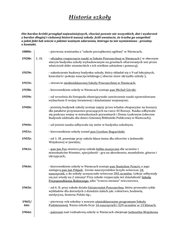 Historia szkoły Oto bardzo krótki przegląd najważniejszych, chociaż pewnie nie wszystkich, dat i wydarzeń z bardzo długiej i ciekawej historii naszej szkoły. Jeśli uważacie, że trzeba go uzupełnić o jakiś fakt lub wiecie o jakimś ważnym zdarzeniu, którego tu nie wymieniono - prosimy o kontakt. - pierwsza wzmianka o "szkole początkowej ogólnej" w Niemcach; 1880r. 1928r. 1. IX. - oficjalne rozpoczęcie nauki w Szkole Powszechnej w Niemcach ( w obecnym starym budynku szkoły wybudowanym na gruntach ofiarowanych wsi przez właścicieli dóbr niemieckich z ich wielkim udziałem i pomocą); 1929r. - zakończenie budowy budynku szkoły, który składał się z 9 sal lekcyjnych, kancelarii i pokoju nauczycielskiego ( obecne stare skrzydło szkoły ); 1933r. - otwarcie siedmioklasowej Szkoły Powszechnej w Niemcach; 1938r. - kierownikiem szkoły w Niemcach zostaje pan Michał Górski; 1939r. - od września do listopada obowiązywało zawieszenie nauki spowodowane wybuchem II wojny światowej i działaniami wojennymi; 1940r. - jesienią budynek szkoły zostaje zajęty przez władze okupacyjne na koszary dla junaków przymusowo pracujących na rzecz III Rzeszy. Nauka odbywała się podczas wojny w mieszkaniach prywatnych i Domu Ludowym (obecnie budynek oddziału dla dzieci Gminnej Biblioteki Publicznej w Niemcach); 1944r. - od jesieni nauka odbywała się znów w budynku szkolnym; 1951r. - kierownikiem szkoły został pan Czesław Boguciński; 1955r. - od 1. IX. powstaje przy szkole klasa ósma dla oficerów z Jednostki Wojskowej w Jawidzu; 1961r. - pan Jan Fus otwiera przy szkole kółko muzyczne dla uczniów i mieszkańców Niemiec, specjalność - gra na akordeonie, mandolinie, gitarze i skrzypcach; 1964r. - kierownikiem szkoły w Niemcach zostaje pan Stanisław Fenert, a jego zastępcą pan Jan Filipek . Grono nauczycielskie liczyło wówczas 18. nauczycieli, a do szkoły uczęszczało wówczas 595 uczniów. Lekcje odbywały się już wtedy na 2 zmiany! Przy szkole rozpoczęła też działalność Szkoła Przysposobienia Rolniczego, jako "trzecia zmiana" wieczorowa. 1965r. - od 6. II. przy szkole działa Uniwersytet Powszechny, który prowadzi cykle wykładów dla dorosłych z dziedzin takich jak: rolnictwo, hodowla, medycyna, historia Polski itp.; 1965/ 66r. - pierwszy rok szkolny z nowym ośmioklasowym programem Szkoły Podstawowej. Nasza szkoła liczy 16 nauczycieli i 529 uczniów w 15 klasach; 1966r. - patronat nad rozbudową szkoły w Niemcach obejmuje Jednostka Wojskowa w Jawidzu . Początek rozbudowy naszej szkoły. Prace budowlane wykonuje Przedsiębiorstwo Budownictwa Rolniczego w Leonowie. Koszt rozbudowy wynosił 5 mln 300 tys. zł. 1968r. 13. X. - uroczyste oddanie do użytku nowego skrzydła szkoły i sali gimnastycznej. Tego dnia również Szkole Podstawowej w Niemcach nadano imię gen. Karola Świerczewskiego. 1970r. 1. IX. - przy SP. w Niemcach powstaje dwuklasowa Zasadnicza Szkoła Rolnicza. 1971r. 1. I. - powstaje Międzyszkolna Przychodnia Dentystyczna w Szkole Podstawowej w Niemcach, która obejmuje swym działaniem również uczniów ze szkół w Rudce Kozłowieckiej, Nasutowie i Nowym Stawie. 1. IX. - pracę w naszej szkole rozpoczyna pani Alicja Gruda. 1973r. - dyrektorem szkoły zostaje pan Marian Skóra, który pełni także obowiązki gminnego dyrektora szkół. Nasza szkoła przygotowuje się do roli szkoły zbiorczej ( zgodnie z wymogami ówcześnie wprowadzanej reformy oświaty), staje się też ośrodkiem samokształceniowym dla nauczycieli z innych szkół naszej gminy. 1974r. - szkoła w Niemcach otrzymuje miano Zbiorczej Szkoły Gminnej . 1975r. - dyrektorem gminnym zostaje pan Kazimierz Cimek . 1976r. 12. X. - w dniu Święta Ludowego Wojska Polskiego, Komitet Rodzicielski przy Zbiorczej Szkole Gminnej w Niemcach przekazał szkole ufundowany przez siebie sztandar. 1979r. 6. X. - dyrektorem ZSG w Niemcach zostaje pani Alina Topyła. Szkoła liczy 32 nauczycieli i 628 uczniów. 1980r. 1. I. - powstaje harcerski zespół artystyczny "Anutki" pod patronatem Jednostki Wojskowej w Jawidzu i kierownictwem pani (druhny) Anny Rzeczyckiej . 6. X. - klasy VI, VII i VIII uczyły się obowiązkowo języka niemieckiego pod kierunkiem pana Andrzeja Góreckiego. 1. IX. - znów byliśmy normalną Szkołą Podstawową w Niemcach. Dyrektorem była nadal pani A. Topyła, a v-ce dyrektorem pani Janina Zarębska . 1984r. 1985r. - stanowisko dyrektora szkoły obejmuje na krótko pan Tadeusz Wytrzyszczewski . 1986r. - dyrektorem szkoły zostaje pani Alicja Gruda a v-ce dyrektorem pani Halina Adamczyk . 1990r. - od września do szkół wróciła katecheza. W naszym gronie nauczycielskim powitaliśmy księży: ks. proboszcza Romana Bolesławskiego i ks. wikariusza Michała Walkowskiego . 1991r. 1. IX. - na skutek ujawnienia faktów mówiących o zbrodniach i niechlubnej roli gen. K. Świerczewskiego szkoła rezygnuje z patrona . Od tej pory byliśmy po prostu Szkołą Podstawową w Niemcach. 26. X. - w marcu gościliśmy w naszych murach grupę nauczycieli - Polaków z Wileńszczyzny. 1992r. 1993r. - podczas wizytacji parafii Niemce, odwiedził naszą szkołę ks. biskup Jan Śrutwa 1. IX. - szkoła w Rudce Kozłowieckiej staje się filią naszej szkoły, a nauczyciele powiększają nasze grono pedagogiczne. Pani Małgorzata Nowak zostaje v-ce dyrektorem SP. w Niemcach. III. - odbył się z inicjatywy p. v-ce dyrektor Małgorzaty Nowak I Szkolny Przegląd Teatralny 22. X. - bardzo uroczyste i udane obchody 65-lecia Szkoły Podstawowej w Niemcach i 25 rocznicy jej rozbudowy . 1994r. - w maju, w wyniku konkursu przeprowadzonego przez Kuratorium Oświaty z udziałem przedstawicieli Rady Gminy Niemce, nauczycieli i Komitetu Rodzicielskiego, na stanowisko dyrektora szkoły została wybrana jednogłośnie pani Alicja Gruda . 1996r. - w lutym obchodziliśmy bardzo hucznie 15 urodziny "Anutek”. Był wywiad i reportaż w Radiu Lublin, jubileuszowy koncert w Studenckim Centru