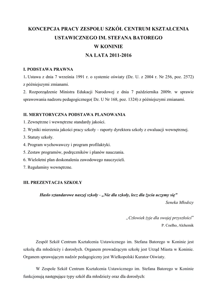 KONCEPCJA PRACY ZESPOŁU SZKÓŁ CENTRUM KSZTAŁCENIA USTAWICZNEGO IM. STEFANA BATOREGO W KONINIE NA LATA 2011-2016 I. PODSTAWA PRAWNA 1. Ustawa z dnia 7 września 1991 r. o systemie oświaty (Dz. U. z 2004 r. Nr 256, poz. 2572) z późniejszymi zmianami. 2. Rozporządzenie Ministra Edukacji Narodowej z dnia 7 października 2009r. w sprawie sprawowania nadzoru pedagogicznego( Dz. U Nr 168, poz. 1324) z późniejszymi zmianami. II. MERYTORYCZNA PODSTAWA PLANOWANIA 1. Zewnętrzne i wewnętrzne standardy jakości. 2. Wyniki mierzenia jakości pracy szkoły – raporty dyrektora szkoły z ewaluacji wewnętrznej. 3. Statuty szkoły. 4. Program wychowawczy i program profilaktyki. 5. Zestaw programów, podręczników i planów nauczania. 6. Wieloletni plan doskonalenia zawodowego nauczycieli. 7. Regulaminy wewnętrzne. III. PREZENTACJA SZKOŁY Hasło sztandarowe naszej szkoły - „Nie dla szkoły, lecz dla życia uczymy się” Seneka Młodszy „Człowiek żyje dla swojej przyszłości” P. Coelho, Alchemik Zespół Szkół Centrum Kształcenia Ustawicznego im. Stefana Batorego w Koninie jest szkolą dla młodzieży i dorosłych. Organem prowadzącym szkołę jest Urząd Miasta w Koninie. Organem sprawującym nadzór pedagogiczny jest Wielkopolski Kurator Oświaty. W Zespole Szkół Centrum Kształcenia Ustawicznego im. Stefana Batorego w Koninie funkcjonują następujące typy szkół dla młodzieży oraz dla dorosłych: Zespół Szkół Centrum Kształcenia Ustawicznego im. Stefana Batorego w Koninie Kształcenie młodzieżowe Liceum Ogólnokształcące: - Klasa Akademicka - Bezpieczeństwo Wewnętrzne/Klasa Strażacka (klasa mundurowa, współpraca z Wydziałem Społeczno-Humanistycznym Państwowej Wyższej Szkoły Zawodowej w Koninie) - Klasa Policyjna (klasa mundurowa, patronat Wielkopolskiego Komendanta Wojewódzkiego Policji w Poznaniu) Technikum - technik ekonomista - technik handlowiec - technik logistyk - technik obsługi turystycznej - technik informatyk Zasadnicza Szkoła Zawodowa - sprzedawca - wielozawodowa Kształcenie dorosłych Szkoły Policealne: - technik administracji - technik archiwista - technik informatyk - technik rachunkowości - technik organizacji reklamy - technik transportu drogowego - technik bezpieczeństwa i higieny pracy - technik ochrony fizycznej mienia i osób - technik turystyki wiejskiej Liceum Ogólnokształcące Gimnazjum dla Dorosłych Kursy: - komputerowe Koncepcja Pracy Szkoły na lata 2011-2016 Opracowanie: 01.09.2011 r. Ostatnia aktualizacja – 29.08.2014 r. Strona 2 z 15 Zespół Szkół Centrum Kształcenia Ustawicznego im. Stefana Batorego w Koninie - maturalne - językowe - kwalifikacyjne kursy zawodowe (sprzedawca, technik ekonomista, technik rachunkowości) - zawodowe (wózki widłowe, operator wózków jezdniowych, obsługa kasy fiskalnej, kasjer-sprzedawca, pilot wycieczek, przewodnik turystyczny, kierownik wycieczek szkolnych, wychowawca placówek wypoczynku, kierownik placówek wypoczynku) - pedagogiczne (dla instruktorów praktycznej nauki zawodu) - administracyjno - biurowe (księgowość i rachunkowość, specjalista ds. kadr i płac, sekretarka) - kurs kroju i szycia, wizażu i stylizacji paznokci - hobbystyczne (bukieciarstwo, autoprezentacja) - bhp Szkoła zatrudnia pedagogów szkolnych i andragoga. Dyżury w szkole pełni pielęgniarka. Nowoczesne i efektywne nauczanie możliwe jest dzięki odpowiedniej bazie lokalowej oraz bazie techniczno-dydaktycznej, która stale jest rozwijana i unowocześniana. Szkoła posiada: 4 budynki, w których znajduje się 37 sal dydaktycznych w tym w pełni skomputeryzowane i wyposażone w zawodowe pomoce dydaktyczne pracownie: - ekonomiczna, - pracownia handlowo-sprzedażowa, - pracownia sprzedażowa, - logistyczna, - turystyczna, - 2 pracownie informatyczne, - nowoczesną pracownię symulacyjną z 2 skomputeryzowanymi pracowniami oraz wyposażonym zapleczem socjalnym, bardzo dobrze wyposażoną i skomputeryzowaną bibliotekę szkolną z czytelnią i centrum multimedialnym, dobrze wyposażoną świetlicę szkolną, obiekt sportowy - Orlik, wykwalifikowaną kadrę pedagogiczną. Koncepcja Pracy Szkoły na lata 2011-2016 Opracowanie: 01.09.2011 r. Ostatnia aktualizacja – 29.08.2014 r. Strona 3 z 15 Zespół Szkół Centrum Kształcenia Ustawicznego im. Stefana Batorego w Koninie Środowisko, z którego pochodzą uczniowie i słuchacze, jest zróżnicowane. Ponad połowa pochodzi ze środowiska wiejskiego. Sytuacja materialna tych rodzin w wielu przypadkach jest bardzo trudna. Dodatkowym obciążeniem finansowym dla rodziców uczniów jest konieczność dojazdów do szkoły. Szkoła umożliwia swoim uczniom i słuchaczom wszechstronny rozwój. Założeniem placówki jest realizacja zadań statutowych nie tylko w sferze dydaktyki i wychowania, ale również kreowanie i wyzwalanie twórczych zainteresowań. W tym celu szkoła ma szeroką ofertę zajęć pozalekcyjnych. Główną formą takich zajęć są fakultety i zajęcia przygotowujące do zewnętrznych egzaminów zarówno maturalnych jak i zawodowych, zajęcia wyrównawcze, koła przedmiotowe i koła zainteresowań. Oferta edukacyjna Zespołu Szkół Centrum Kształcenia Ustawicznego im. Stefana Batorego w Koninie cieszy się w dużym zainteresowaniem. Jest to wynikiem następujących działań: monitorowania zainteresowań gimnazjalistów i absolwentów szkół średnich; badaniem zapotrzebowania rynku pracy; współpracy z Powiatowym Urzędem Pracy; stworzenie odpowiednich warunków, klimatu i atmosfery zachęcającej gimnazjalistów do przyjścia do naszej szkoły; kontaktów z rodzicami; kontaktów z instytucjami i pracodawcami; efektywnej promocji szkoły w środowisku lokalnym; ofertą kierunków kształcenia, dostosowaną do potrzeb rynku pracy oraz zainteresowań potencjalnych uczniów i słuchaczy; gruntownym przygotowaniu zaplecza dydaktycznego wspartego kompetentnymi i dobrze przygotowanymi do pracy nauczycielami; profesjonalnej prakt