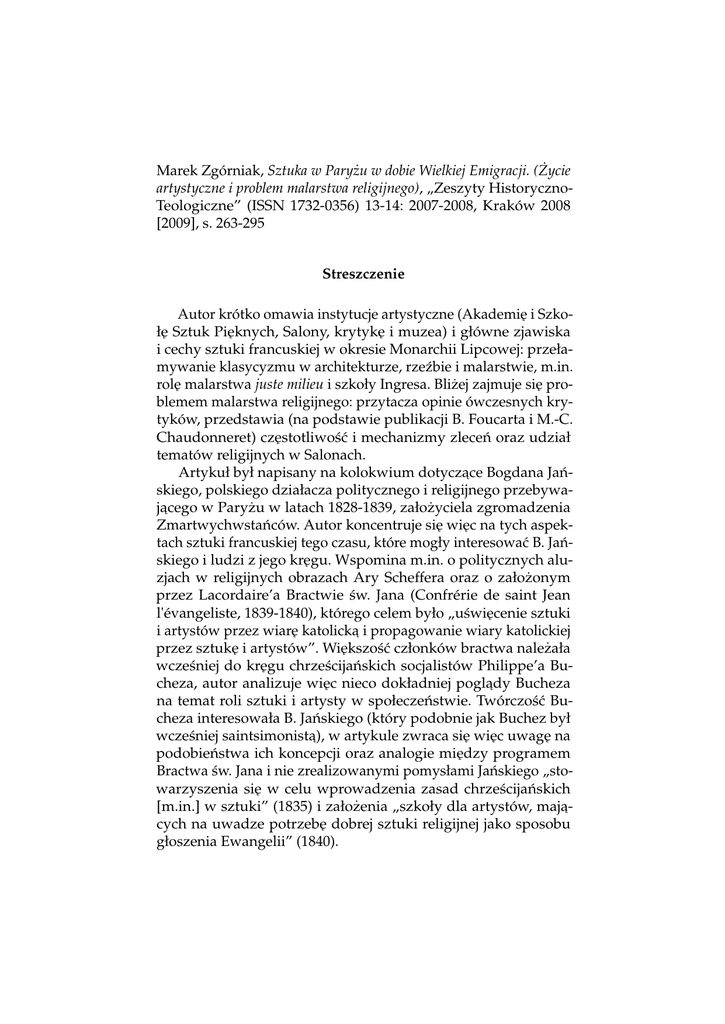 Marek Zgórniak, Sztuka w Paryżu w dobie Wielkiej Emigracji. (Życie artystyczne i problem malarstwa religijnego), „Zeszyty HistorycznoTeologiczne” (ISSN 1732-0356) 13-14: 2007-2008, Kraków 2008 [2009], s. 263-295 Streszczenie Autor krótko omawia instytucje artystyczne (Akademi˛e i Szkoł˛e Sztuk Pi˛eknych, Salony, krytyk˛e i muzea) i główne zjawiska i cechy sztuki francuskiej w okresie Monarchii Lipcowej: przełamywanie klasycyzmu w architekturze, rzeźbie i malarstwie, m.in. rol˛e malarstwa juste milieu i szkoły Ingresa. Bliżej zajmuje si˛e problemem malarstwa religijnego: przytacza opinie ówczesnych krytyków, przedstawia (na podstawie publikacji B. Foucarta i M.-C. Chaudonneret) cz˛estotliwość i mechanizmy zleceń oraz udział tematów religijnych w Salonach. Artykuł był napisany na kolokwium dotyczace ˛ Bogdana Jańskiego, polskiego działacza politycznego i religijnego przebywajacego ˛ w Paryżu w latach 1828-1839, założyciela zgromadzenia Zmartwychwstańców. Autor koncentruje si˛e wi˛ec na tych aspektach sztuki francuskiej tego czasu, które mogły interesować B. Jańskiego i ludzi z jego kr˛egu. Wspomina m.in. o politycznych aluzjach w religijnych obrazach Ary Scheffera oraz o założonym przez Lacordaire’a Bractwie św. Jana (Confrérie de saint Jean l'évangeliste, 1839-1840), którego celem było „uświ˛ecenie sztuki i artystów przez wiar˛e katolicka˛ i propagowanie wiary katolickiej przez sztuk˛e i artystów”. Wi˛ekszość członków bractwa należała wcześniej do kr˛egu chrześcijańskich socjalistów Philippe’a Bucheza, autor analizuje wi˛ec nieco dokładniej poglady ˛ Bucheza na temat roli sztuki i artysty w społeczeństwie. Twórczość Bucheza interesowała B. Jańskiego (który podobnie jak Buchez był wcześniej saintsimonista), ˛ w artykule zwraca si˛e wi˛ec uwag˛e na podobieństwa ich koncepcji oraz analogie mi˛edzy programem Bractwa św. Jana i nie zrealizowanymi pomysłami Jańskiego „stowarzyszenia si˛e w celu wprowadzenia zasad chrześcijańskich [m.in.] w sztuki” (1835) i założenia „szkoły dla artystów, maja˛ cych na uwadze potrzeb˛e dobrej sztuki religijnej jako sposobu głoszenia Ewangelii” (1840).