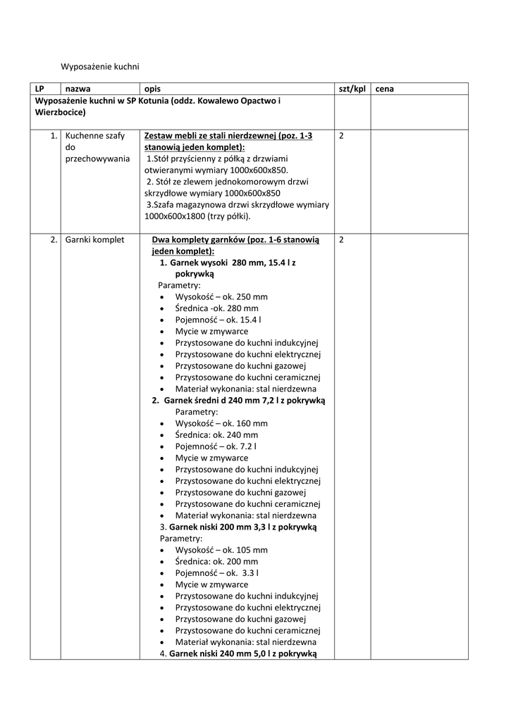 Wyposażenie kuchni LP nazwa opis Wyposażenie kuchni w SP Kotunia (oddz. Kowalewo Opactwo i Wierzbocice) szt/kpl 1. Kuchenne szafy do przechowywania Zestaw mebli ze stali nierdzewnej (poz. 1-3 stanowią jeden komplet): 1.Stół przyścienny z półką z drzwiami otwieranymi wymiary 1000x600x850. 2. Stół ze zlewem jednokomorowym drzwi skrzydłowe wymiary 1000x600x850 3.Szafa magazynowa drzwi skrzydłowe wymiary 1000x600x1800 (trzy półki). 2 2. Garnki komplet Dwa komplety garnków (poz. 1-6 stanowią jeden komplet): 1. Garnek wysoki 280 mm, 15.4 l z pokrywką Parametry: Wysokość – ok. 250 mm Średnica -ok. 280 mm Pojemność – ok. 15.4 l Mycie w zmywarce Przystosowane do kuchni indukcyjnej Przystosowane do kuchni elektrycznej Przystosowane do kuchni gazowej Przystosowane do kuchni ceramicznej Materiał wykonania: stal nierdzewna 2. Garnek średni d 240 mm 7,2 l z pokrywką Parametry: Wysokość – ok. 160 mm Średnica: ok. 240 mm Pojemność – ok. 7.2 l Mycie w zmywarce Przystosowane do kuchni indukcyjnej Przystosowane do kuchni elektrycznej Przystosowane do kuchni gazowej Przystosowane do kuchni ceramicznej Materiał wykonania: stal nierdzewna 3. Garnek niski 200 mm 3,3 l z pokrywką Parametry: Wysokość – ok. 105 mm Średnica: ok. 200 mm Pojemność – ok. 3.3 l Mycie w zmywarce Przystosowane do kuchni indukcyjnej Przystosowane do kuchni elektrycznej Przystosowane do kuchni gazowej Przystosowane do kuchni ceramicznej Materiał wykonania: stal nierdzewna 4. Garnek niski 240 mm 5,0 l z pokrywką 2 cena Parametry: Wysokość – ok.110 mm Średnica: ok. 240 mm Pojemność –ok. 5 l Mycie w zmywarce Przystosowane do kuchni indukcyjnej Przystosowane do kuchni elektrycznej Przystosowane do kuchni gazowej Przystosowane do kuchni ceramicznej Materiał wykonania: stal nierdzewna 5. Patelnia nieprzywierająca teflonowa Parametry: Wysokość – ok.48 mm Średnica: ok. 280 mm Mycie w zmywarce Przystosowane do kuchni indukcyjnej Przystosowane do kuchni elektrycznej Przystosowane do kuchni gazowej Przystosowane do kuchni ceramicznej Materiał wykonania: stal nierdzewna 6. Rondel d 240 mm 5 l z pokrywką Parametry: Wysokość – ok. 110 mm Średnica: ok. 240 mm Pojemność – ok. 5 l Mycie w zmywarce Przystosowane do kuchni indukcyjnej Przystosowane do kuchni elektrycznej Przystosowane do kuchni gazowej Przystosowane do kuchni ceramicznej Materiał wykonania: stal nierdzewna 3. Łyżki i sztućce Komplety sztućców (każda pozycja - 1, 2, 3, 4 – stanowi odrębny komplety) 1. Łyżka stołowa (25 szt. zestaw przedszkolny) Parametry: Długość – ok. 152 mm Materiał wykonania: stal nierdzewna Opis: zalecane dla alergików uczulonych na nikiel (wykonane ze stali) zaprojektowane specjalnie dla dzieci grubość ok. 2,50 mm 2. Widelczyk stołowy (25 szt. zestaw przedszkolny) Parametry: Długość – ok. 149 mm Materiał wykonania: stal nierdzewna Opis: zalecane dla alergików uczulonych na 4 nikiel (wykonane ze stali) zaprojektowane specjalnie dla dzieci ząbki zaokrąglone grubość ok. 2,50 mm 3. Nóż stołowy (25 szt. zestaw przedszkolny) Parametry: Długość – ok. 172 mm Materiał wykonania: stal nierdzewna Opis: zalecane dla alergików uczulonych na nikiel (wykonane ze stali) zaprojektowane specjalnie dla dzieci nóż bez ostrza do rozdzielania potraw grubość ok.5,00 mm 4. Łyżeczka do deserków (25 szt. zestaw przedszkolny) Parametry: Długość – ok. 135 mm Materiał wykonania: stal nierdzewna Opis: zalecane dla alergików uczulonych na nikiel (wykonane ze stali) zaprojektowane specjalnie dla dzieci grubość ok. 2,00 mm 4. Talerze 4 komplety zestawów talerzy (Poz.1-3 stanowią jeden komplet): 1. Talerz płytki 235 mm (24 szt.) Parametry: Średnica: ok. 235 mm Mycie w zmywarce Opis: wykonany z hartowanego białego szkła o wytrzymałej powłoce gładkie powierzchnie oraz ranty 2. Talerz deserowy 195 mm (24 szt.) Parametry: Wysokość – ok. 17 mm Średnica: 190 mm Mycie w zmywarce Opis: wykonany z hartowanego białego szkła o wytrzymałej powłoce gładkie powierzchnie oraz ranty 3. Talerz głęboki 215 mm (24 szt.) Parametry: Wysokość – ok. 29 mm Średnica: ok. 215 mm Mycie w zmywarce Opis: wykonany z hartowanego białego szkła 4 5. Kubki o wytrzymałej powłoce gładkie powierzchnie oraz ranty Kubek 0,48 l Parametry: Wysokość – ok. 107 mm Głębokość – ok.137 mm Szerokość – ok. 96 mm Pojemność – ok. 0.48 l Mycie w zmywarce Opis: wzmocnione brzegi wytrzymała powłoka szklana przystosowany do użytkowania w kuchence mikrofalowej 50