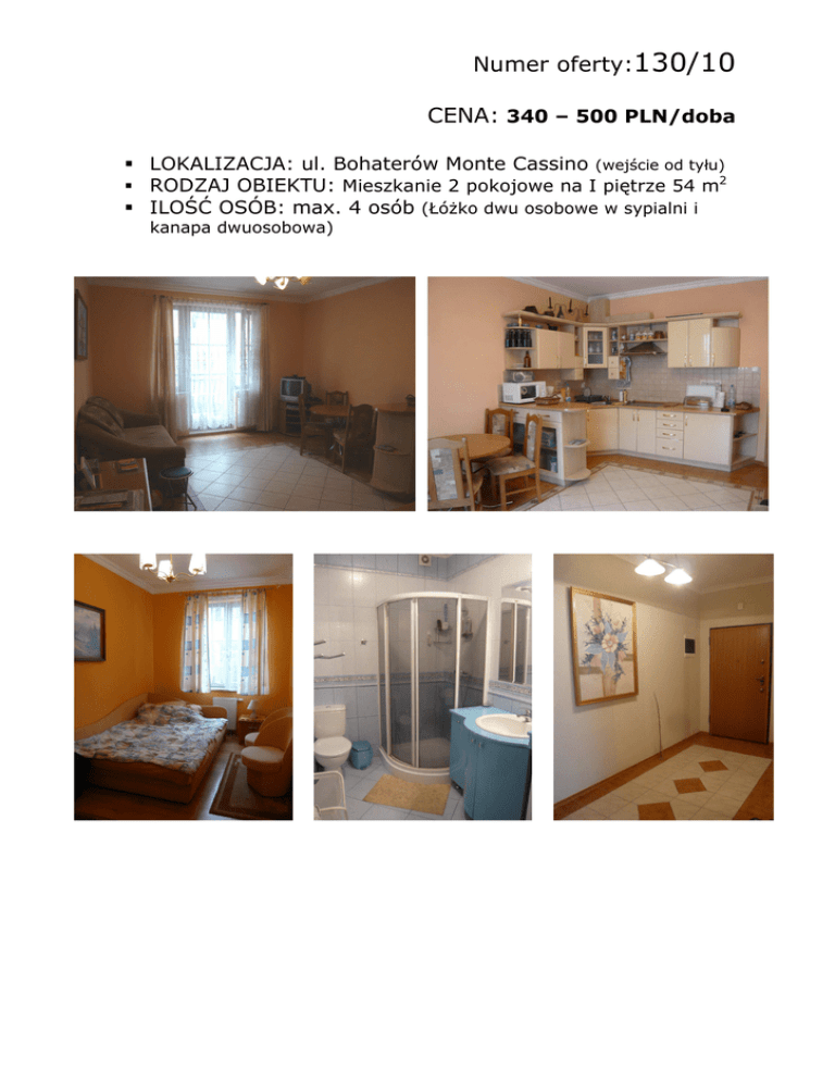 Numer oferty:130/10 CENA: 340 – 500 PLN/doba LOKALIZACJA: ul. Bohaterów Monte Cassino (wejście od tyłu) RODZAJ OBIEKTU: Mieszkanie 2 pokojowe na I piętrze 54 m2 ILOŚĆ OSÓB: max. 4 osób (ŁóŜko dwu osobowe w sypialni i kanapa dwuosobowa) Numer oferty: 130/10 LOKALIZACJA: ul. Bohaterów Monte Cassino Lp. PRZEDMIOT OCENY UWAGI 1. Nowe/stare budownictwo Nowe ładne budownictwo 2. Nowe/stare meble Nowe meble 3. Parking na posesji/GaraŜ Parking podziemny 4. Balkon / taras / ogródek Balkon 5. Telewizor (Kablówka, TV Sat), Radio TV kablowa 6. Dostęp do telefonu Nie 7. Dostęp do internetu Przewodowy 8. Kuchnia Kuchnia otwarta łączona z pokojem dziennym w pełni wyposaŜona w: kuchenka elektryczna, mikrofalówka, lodówka, zmywarka, sztućce, zastawa i garnki 9. Łazienka Łazienka z kabiną prysznicową oraz WC. Pralka 10. Pościel, ręczniki Pościel i ręczniki 11. Dostęp do szafy / półek Tak 12. Pobyt ze zwierzątkiem Do uzgodnienia 14. Niepełnosprawni (winda, podjazd) Obiekt nie przystosowany 15. Plac zabaw dla dzieci Nie 16. 17. Lokalizacja • Centrum – Dworzec PKP • PlaŜa, park • Dzielnica • Komunikacja miejska Osoby palące Na balkonie moŜna palić 18. Piwnica/schowek Nie 19. Faktura VAT lub Rachunek 20. Inne Centrum miasta, główny deptak, 400 m do molo i plaŜy, 500 m do Dworca PKP, 500 m do kortów tenisowych i krytej pływalni