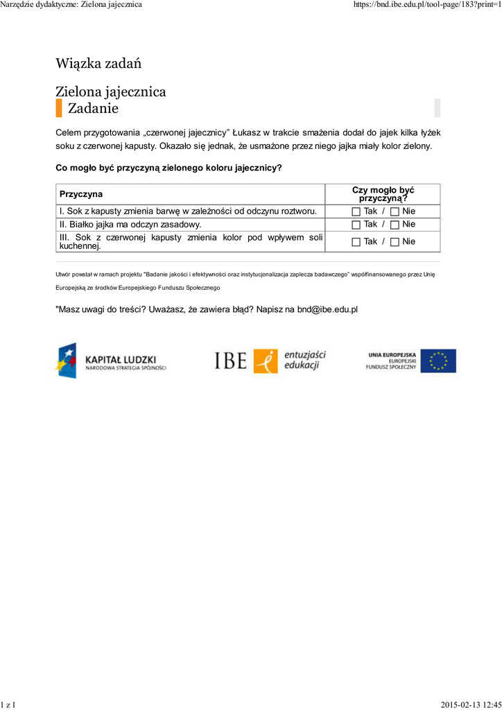 Narzędzie dydaktyczne: Zielona jajecznica 1z1 https://bnd.ibe.edu.pl/tool-page/183?print=1 Wiązka zadań Zielona jajecznica Zadanie Celem przygotowania „czerwonej jajecznicy” Łukasz w trakcie smażenia dodał do jajek kilka łyżek soku z czerwonej kapusty. Okazało się jednak, że usmażone przez niego jajka miały kolor zielony. Co mogło być przyczyną zielonego koloru jajecznicy? Przyczyna I. Sok z kapusty zmienia barwę w zależności od odczynu roztworu. II. Białko jajka ma odczyn zasadowy. III. Sok z czerwonej kapusty zmienia kolor pod wpływem soli kuchennej. Czy mogło być przyczyną? Tak / Nie Tak / Nie Tak / Nie Utwór powstał w ramach projektu "Badanie jakości i efektywności oraz instytucjonalizacja zaplecza badawczego” współfinansowanego przez Unię Europejską ze środków Europejskiego Funduszu Społecznego "Masz uwagi do treści? Uważasz, że zawiera błąd? Napisz na [email protected] 2015-02-13 12:45