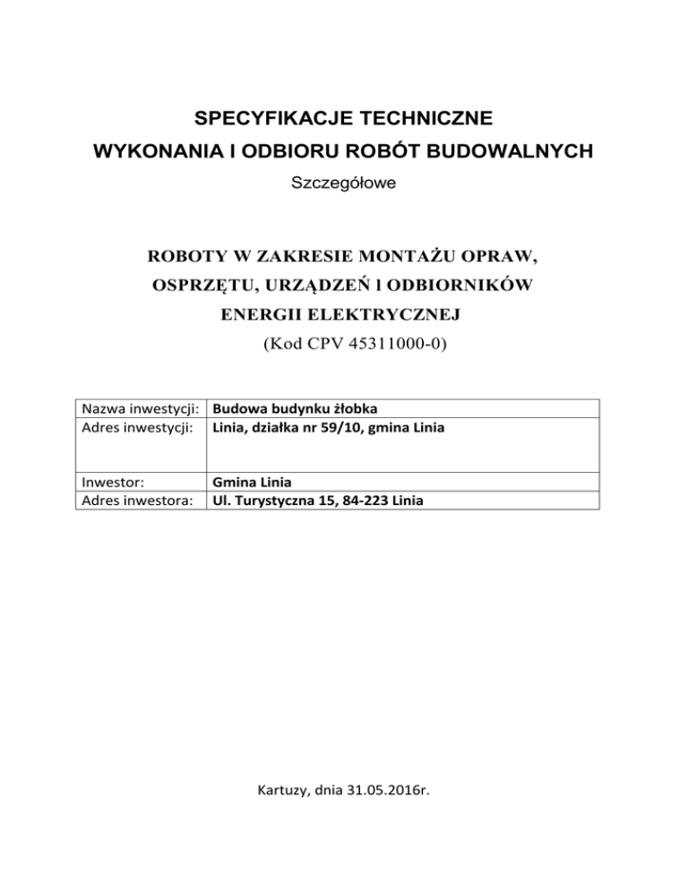 SPECYFIKACJE TECHNICZNE WYKONANIA I ODBIORU ROBÓT BUDOWALNYCH Szczegółowe ROBOTY W ZAKRESIE MONTAŻU OPRAW, OSPRZĘTU, URZĄDZEŃ l ODBIORNIKÓW ENERGII ELEKTRYCZNEJ (Kod CPV 45311000-0) Nazwa inwestycji: Budowa budynku żłobka Adres inwestycji: Linia, działka nr 59/10, gmina Linia Inwestor: Adres inwestora: Gmina Linia Ul. Turystyczna 15, 84-223 Linia Kartuzy, dnia 31.05.2016r. 1. Wstęp 1.1. Przedmiot SST Przedmiotem niniejszej specyfikacji technicznej (SST) są wymagania dotyczące wykonania i odbioru robót związanych z układaniem i montażem elementów instalacji elektrycznej (układanie kabli i przewodów, montaż osprzętu i opraw. 1.2. Zakres stosowania ST Specyfikacja techniczna stanowi dokument przetargowy i kontraktowy przy zlecaniu i realizacji robót wymienionych w pkt. 1.2. 1.3. Przedmiot i zakres robót objętych ST Ustalenia zawarte w niniejszej specyfikacji technicznej (SST) dotyczą zasad wykonywania i odbioru robót związanych z: układaniem kabli i przewodów elektrycznych poza rozdzielnicami, montażem opraw, osprzętu, urządzeń i odbiorników energii elektrycznej, wraz z przygotowaniem podłoża i robotami towarzyszącymi, Zakres instalacji do wykonania: 1.1. Układ zasilania - charakterystyka ogólna. Układ zasilania instalacji elektrycznych wykonany będzie zgodnie z Warunkami Przyłączenia wydanymi przez ENERGA OPERATOR S.A. W niniejszym projekcie przewidziano wykonanie Wewnętrznej Linii Zasilającej WLZ od złącza kablowego do rozdzielni TE w budynku. 1.2. Linia kablowa nn - Wewnętrzna Linia Zasilająca WLZ. Przewiduje się wykonanie Wewnętrznej Linii Zasilającej WLZ kablem YKYżo 5x25mm2 od złącza kablowego do rozdzielnicy TE w budynku (rys. E-1). Przyłącze energetyczne wraz ze złączem kablowym nie jest przedmiotem niniejszego opracowania, realizacja w gestii Energa-Operator S.A. Kabel należy układać na głębokości 0.7 m, na warstwie piasku 10 cm a następnie zasypać warstwą piasku o grubości minimum 10 cm i przysypać warstwą rodzimego gruntu o grubości ok. 15 cm po czym przykryć folią z tworzywa koloru niebieskiego i zasypać ziemią. Pod powierzchnią utwardzoną (wjazd, parking itp.) kabel układać w rurze ochronnej DVK 75. W budynku kabel układać pod tynkiem w rurze osłonowej PCV. Zabezpieczenie w Załączu zintegrowanym IBN = 40A. Jednocześnie od złącza do budynku należy prowadzić bednarkę PFeZN 25x4, następnie przyłączyć ją do uziomu otokowego i zacisku PE w złączu, i do GSW przy rozdzielni w budynku. Do złącza kablowego i do budynku kabel wprowadzać w przepuście. Miejsce wprowadzenia kabla do rur i przepustów powinny być uszczelnione. Całość robót związanych z ułożeniem kabla należy wykonać zgodnie z normą PN-76/E - 05125. Bilans mocy przedstawiono w punkcie Bilans mocy 3.1 Rozdział energii elektrycznej w budynku W celu rozdziału energii projektuje się w wyznaczonych na schemacie miejscach rozdzielnie wnękowe o pojemnościach 4x18 modułów każda np.: EKINOXE TX firmy Legrand. Stosować rozdzielnice o stopniu ochrony min. IP 40 wykonane w II klasie ochronności. W wyposażeniu rozdzielnic R zastosowano: - wyłącznik główny - ochronnik przeciwprzepięciowy - wyłączniki ochronne różnicowo-prądowe dla poszczególnych grup odbiorów - wyłączniki instalacyjne nadmiarowo-prądowe dla zabezpieczenia poszczególnych obwodów Parametry aparatów oraz sposób połączenia podano na schemacie instalacji elektrycznej, rys. nr E-5 . 1.3. Instalacje elektryczne. W budynku przewidziano wykonanie następujących instalacji elektrycznych: - oświetleniowej - gniazd wtyczkowych ogólnego przeznaczenia - gniazd wtyczkowych w łazienkach (wydzielone obwody) - gniazda 400V (wydzielony obwody) - wydzielony obwód do zasilania urządzeń el-nych kotła dla instalacji c.o. i cwu - zasilania kuchenki elektrycznej (wydzielone obwody) - wyrównawczej Każdy obwód odbiorczy zabezpieczyć należy wyłącznikiem instalacyjnym nadmiarowoprądowym. Całość instalacji w rozdzielnicach winna być zabezpieczona wyłącznikami różnicowoprądowymi i ochronnikami przepięciowymi (rozdzielnie główne). 1.4. Instalacje oświetlenia ogólnego. Rozprowadzenie przewodów wykonać pod tynkiem znormalizowanymi trasami opisanymi w punkcie 2.12. Zastosować przewody YDY i YDYp 0,75 kV 3x1,5 :4x1,5. Plan instalacji oświetleniowej przedstawiono na rys. E-3, E-4 . Łączniki należy instalować na wysokości 1,2 m od właściwej posadzki. Zastosować typowy osprzęt podtynkowy a pomieszczeniach sanitarnych, pom. technicznym (z kotłem c.o.) oraz kuchni stosować osprzęt szczelny IP 44 w obudowie izolacyjnej. Projektuje się zasilanie wentylatorów w sanitariatach kuchniach i miejscach wyznaczonych z obwodów oświetlenia ogólnego. 1.5. Oświetlenie awaryjne. W miejscach oznaczonych na schemacie przewidziano zainstalowanie opraw wyposażonych w układy akumulatorowe zasilania awaryjnego, z co najmniej godzinnym czasem podtrzymania. Oprawy te zostały oznaczone na rys. E-3, E-4. Przy budowie należy pamiętać że oprawy z własnym. źr. Zasilania wymagają dodatkowej żyły przewodu monitorującej stan zasilania. Przed oddaniem obiektu do użytkowania należy dokonać sprawdzenia działania oświetlenia w ciągach komunikacyjnych ( ≥ 1 lx). W trakcie eksploatacji, takiego sprawdzania należy dokonywać co najmniej raz w roku. 1.6. Instalacja gniazd wtyczkowych ogólnego przeznaczenia. Instalację gniazd wtyczkowych 230V wykonać przewodami YDYp 0,75 kV 3x2,5. Przewody zasilające gniazd prowadzić w ścianie, pod tynkiem znormalizowanymi trasami opisanymi w punkcie 2.11. oraz w posadzce w rurach ochronnych PCV. Gniazda montować na wysokości od gotowej posadzki: - 0,3 m w pokojach mieszkań oraz w korytarzach - 1,3 m w pomieszczeniach sanitarnych, socjalnych i w kotłowni Zastosować typowy osprzęt podtynkowy a pomieszczeniach sanitarnych, pom. technicznym (z kotłem c.o.) oraz kuchni stosować osprzęt szcze