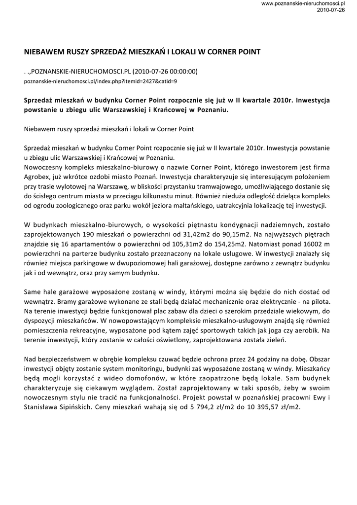www.poznanskie-nieruchomosci.pl 2010-07-26 NIEBAWEM RUSZY SPRZEDAŻ MIESZKAŃ I LOKALI W CORNER POINT . .,POZNANSKIE-NIERUCHOMOSCI.PL (2010-07-26 00:00:00) poznanskie-nieruchomosci.pl/index.php?itemid=2427&catid=9 Sprzedaż mieszkań w budynku Corner Point rozpocznie się już w II kwartale 2010r. Inwestycja powstanie u zbiegu ulic Warszawskiej i Krańcowej w Poznaniu. Niebawem ruszy sprzedaż mieszkań i lokali w Corner Point Sprzedaż mieszkań w budynku Corner Point rozpocznie się już w II kwartale 2010r. Inwestycja powstanie u zbiegu ulic Warszawskiej i Krańcowej w Poznaniu. Nowoczesny kompleks mieszkalno-biurowy o nazwie Corner Point, którego inwestorem jest firma Agrobex, już wkrótce ozdobi miasto Poznań. Inwestycja charakteryzuje się interesującym położeniem przy trasie wylotowej na Warszawę, w bliskości przystanku tramwajowego, umożliwiającego dostanie się do ścisłego centrum miasta w przeciągu kilkunastu minut. Również nieduża odległość dzieląca kompleks od ogrodu zoologicznego oraz parku wokół jeziora maltańskiego, uatrakcyjnia lokalizację tej inwestycji. W budynkach mieszkalno-biurowych, o wysokości piętnastu kondygnacji nadziemnych, zostało zaprojektowanych 190 mieszkań o powierzchni od 31,42m2 do 90,15m2. Na najwyższych piętrach znajdzie się 16 apartamentów o powierzchni od 105,31m2 do 154,25m2. Natomiast ponad 16002 m powierzchni na parterze budynku zostało przeznaczony na lokale usługowe. W inwestycji znalazły się również miejsca parkingowe w dwupoziomowej hali garażowej, dostępne zarówno z zewnątrz budynku jak i od wewnątrz, oraz przy samym budynku. Same hale garażowe wyposażone zostaną w windy, którymi można się będzie do nich dostać od wewnątrz. Bramy garażowe wykonane ze stali będą działać mechanicznie oraz elektrycznie - na pilota. Na terenie inwestycji będzie funkcjonował plac zabaw dla dzieci o szerokim przedziale wiekowym, do dyspozycji mieszkańców. W nowopowstającym kompleksie mieszkalno-usługowym znajdą się również pomieszczenia rekreacyjne, wyposażone pod kątem zajęć sportowych takich jak joga czy aerobik. Na terenie inwestycji, który zostanie w całości oświetlony, zaprojektowana została zieleń. Nad bezpieczeństwem w obrębie kompleksu czuwać będzie ochrona przez 24 godziny na dobę. Obszar inwestycji objęty zostanie system monitoringu, budynki zaś wyposażone zostaną w windy. Mieszkańcy będą mogli korzystać z wideo domofonów, w które zaopatrzone będą lokale. Sam budynek charakteryzuje się ciekawym wyglądem. Został zaprojektowany w taki sposób, żeby w swoim nowoczesnym stylu nie tracić na funkcjonalności. Projekt powstał w poznańskiej pracowni Ewy i Stanisława Sipińskich. Ceny mieszkań wahają się od 5 794,2 zł/m2 do 10 395,57 zł/m2.
