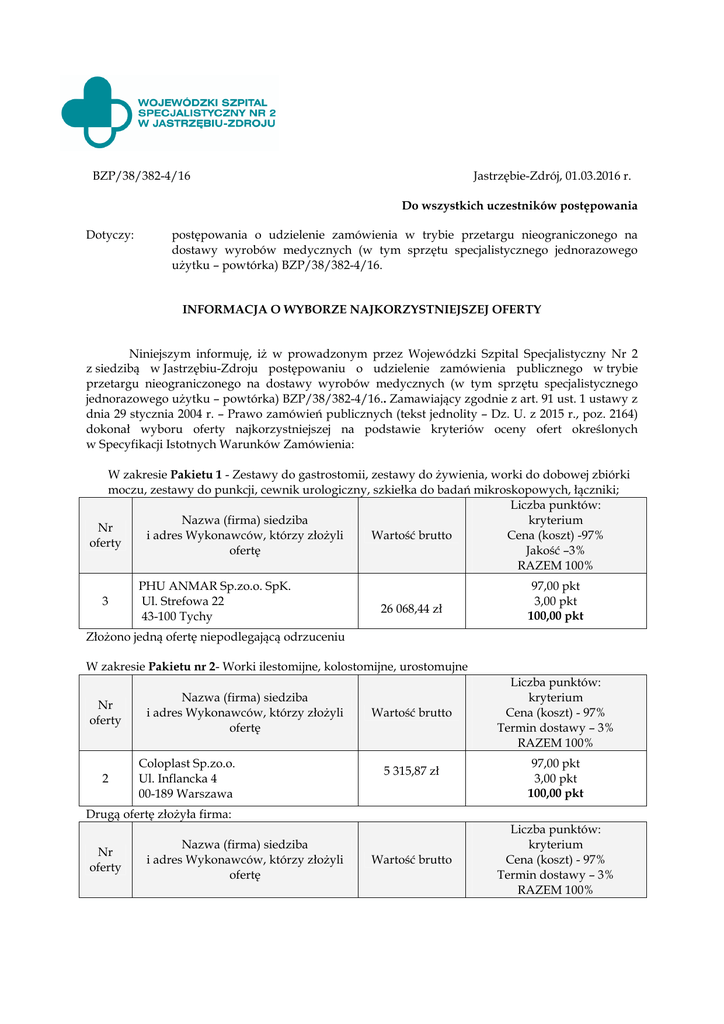 BZP/38/382-4/16 Jastrzębie-Zdrój, 01.03.2016 r. Do wszystkich uczestników postępowania Dotyczy: postępowania o udzielenie zamówienia w trybie przetargu nieograniczonego na dostawy wyrobów medycznych (w tym sprzętu specjalistycznego jednorazowego użytku – powtórka) BZP/38/382-4/16. INFORMACJA O WYBORZE NAJKORZYSTNIEJSZEJ OFERTY Niniejszym informuję, iż w prowadzonym przez Wojewódzki Szpital Specjalistyczny Nr 2 z siedzibą w Jastrzębiu-Zdroju postępowaniu o udzielenie zamówienia publicznego w trybie przetargu nieograniczonego na dostawy wyrobów medycznych (w tym sprzętu specjalistycznego jednorazowego użytku – powtórka) BZP/38/382-4/16.. Zamawiający zgodnie z art. 91 ust. 1 ustawy z dnia 29 stycznia 2004 r. – Prawo zamówień publicznych (tekst jednolity – Dz. U. z 2015 r., poz. 2164) dokonał wyboru oferty najkorzystniejszej na podstawie kryteriów oceny ofert określonych w Specyfikacji Istotnych Warunków Zamówienia: W zakresie Pakietu 1 - Zestawy do gastrostomii, zestawy do żywienia, worki do dobowej zbiórki moczu, zestawy do punkcji, cewnik urologiczny, szkiełka do badań mikroskopowych, łączniki; Liczba punktów: Nazwa (firma) siedziba kryterium Nr i adres Wykonawców, którzy złożyli Wartość brutto Cena (koszt) -97% oferty ofertę Jakość –3% RAZEM 100% 3 PHU ANMAR Sp.zo.o. SpK. Ul. Strefowa 22 43-100 Tychy 26 068,44 zł 97,00 pkt 3,00 pkt 100,00 pkt Złożono jedną ofertę niepodlegającą odrzuceniu W zakresie Pakietu nr 2- Worki ilestomijne, kolostomijne, urostomujne Nr oferty 2 Nazwa (firma) siedziba i adres Wykonawców, którzy złożyli ofertę Coloplast Sp.zo.o. Ul. Inflancka 4 00-189 Warszawa Wartość brutto 5 315,87 zł Liczba punktów: kryterium Cena (koszt) - 97% Termin dostawy – 3% RAZEM 100% 97,00 pkt 3,00 pkt 100,00 pkt Drugą ofertę złożyła firma: Nr oferty Nazwa (firma) siedziba i adres Wykonawców, którzy złożyli ofertę Wartość brutto Liczba punktów: kryterium Cena (koszt) - 97% Termin dostawy – 3% RAZEM 100% 3 PHU ANMAR Sp.zo.o. SpK. Ul. Strefowa 22 43-100 Tychy 6 426,00zł 80,24 pkt 3,00 pkt 83,24 pkt W zakresie Pakietu nr 3- Zestawy do niskociśnieniowego drenażu ran - Zamawiający jako najkorzystniejszą wybrał ofertę złożoną przez: Liczba punktów: Nazwa (firma) siedziba kryterium Nr i adres Wykonawców, którzy złożyli Wartość brutto Cena (koszt) - 97% oferty ofertę Termin dostawy –3% RAZEM 100% PHU ANMAR Sp.zo.o. SpK. 97,00 pkt Ul. Strefowa 22 16 200,00 zł 3 3,00 pkt 43-100 Tychy 100,00 pkt Kajetany, 05-830 Nadarzyn Złożono jedną ofertę niepodlegającą odrzuceniu W zakresie Pakietu nr 4 - Introduktory, igły do przekłuwań, cewniki do aniografii, prowadnikiZamawiający jako najkorzystniejszą wybrał ofertę złożoną przez: Liczba punktów: Nazwa (firma) siedziba kryterium Nr i adres Wykonawców, którzy złożyli Wartość brutto Cena (koszt) - 97% oferty ofertę Termin dostawy – 3% RAZEM 100% PHU ANMAR Sp.zo.o. SpK. 97,00 pkt Ul. Strefowa 22 3 24 769,80 zł 3,00 pkt 43-100 Tychy 100,00 pkt Kajetany, 05-830 Nadarzyn Złożono jedną ofertę niepodlegającą odrzuceniu. W zakresie Pakietu nr 5 - Cewniki typu: Foley`a/urologiczny/pezzer/zewnętrzne, Dren Kehra;- Zamawiający jako najkorzystniejszą wybrał ofertę złożoną przez: Liczba punktów: Nazwa (firma) siedziba kryterium Nr i adres Wykonawców, którzy złożyli Wartość brutto Cena (koszt) - 97% oferty ofertę Termin dostawy – 3% RAZEM 100% 11 ZARYS International Group Sp.zo.o. Sp.K ul. Pod Borem 18 41-808 Zabrze 7 984,17 zł 97,00 pkt 3,00 pkt 100,00 pkt Wartość brutto Liczba punktów: kryterium Cena (koszt) - 97% Termin dostawy – 3% RAZEM 100% 17 106,12 zł 45,27 pkt 3,00 pkt 48,27 pkt Drugą ofertę złożyła firma: Nr oferty 1 Nazwa (firma) siedziba i adres Wykonawców, którzy złożyli ofertę SKAMEX Sp.zo.o. Sp.K ul. Czestochowska 38/52 93-121 Łódź Złożono dwie oferty niepodlegające odrzuceniu. W zakresie Pakietu nr 6 -Cewnik Pezzer, Foley`a pooperacyjny; - Zamawiający jako najkorzystniejszą wybrał ofertę złożoną przez: Liczba punktów: Nazwa (firma) siedziba kryterium Nr i adres Wykonawców, którzy złożyli Wartość brutto Cena (koszt) – 97 % oferty ofertę Termin dostawy – 3% RAZEM 100% ZARYS International Group 97,00 pkt Sp.zo.o. Sp.K 11 5 689,98 zł 3,00 pkt ul. Pod Borem 18 100,00 pkt 41-808 Zabrze Drugą ofertę złożyła firma: Liczba punktów: Nazwa (firma) siedziba kryterium Nr i adres Wykonawców, którzy złożyli Wartość brutto Cena (koszt) - 97% oferty ofertę Termin dostawy – 3% RAZEM 100% 1 SKAMEX Sp.zo.o. Sp.K ul. Czestochowska 38/52 93-121 Łódź 10 044,00 zl 54,95 pkt 3,00 pkt 57,95 pkt Złożono dwie oferty niepodlegające odrzuceniu. W zakresie Pakietu nr 7 – Porty, zestawy wprowadzające, igły do portów, Zestaw do zabiegów nerkozastępczych, cewnik do hemofiltracji, worek na płyn odprowadzony;- Zamawiający jako najkorzystniejszą wybrał ofertę złożoną przez: Liczba punktów: Nazwa (firma) siedziba kryterium Nr i adres Wykonawców, którzy złożyli Wartość brutto Cena (koszt) -97% oferty ofertę Termin dostawy – 3% RAZEM 100% PHU ANMAR Sp.zo.o. SpK. 97,00 pkt Ul. Strefowa 22 3 60 269,40 zł 3,00 pkt 43-100 Tychy 100,00 pkt Kajetany, 05-830 Nadarzyn Złożono jedną ofertę niepodlegającą odrzuceniu W zakresie Pakietu nr 8 – Zestaw do zabiegów nerkozastepczych, zestaw do plasmaferezy Zamawiający jako najkorzystniejszą wybrał ofertę złożoną przez: Liczba punktów: Nazwa (firma) siedziba kryterium Nr i adres Wykonawców, którzy złożyli Wartość brutto Cena (koszt) - 97% oferty ofertę Termin dostawy – 3% RAZEM 100% Gambro Poland Sp.zo.o. 9700 pkt 4 57 412,80 zł ul. Cylichowska 13/15 3,00 pkt 100,00 pkt 04-769 Warszawa Złożono jedną ofertę niepodlegającą odrzuceniu. W zakresie Pakietu nr 11 - Klipsy tytanowe - Zamawiający jako najkorzystniejszą wybrał ofertę złożoną przez: Nazwa (firma) siedziba Liczba punktów: 