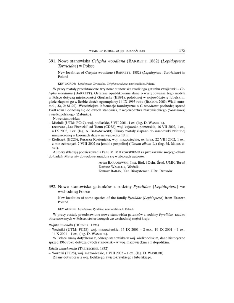 WIAD. ENTOMOL., 23 (3): POZNAŃ 2004 175 391. Nowe stanowiska Celypha woodiana (BARRETT , 1882) (Lepidoptera: Tortricidae) w Polsce New localities of Celypha woodiana (BARRETT , 1882) (Lepidoptera: Tortricidae) in Poland KEY WORDS: Lepidoptera, Tortricidae, Celypha woodiana, new localities, Poland. W pracy zostały przedstawione trzy nowe stanowiska rzadkiego gatunku zwójkówki – Celypha woodiana (B ARRETT ). Ostatnie opublikowane dane o występowania tego motyla w Polsce dotyczą miejscowości Gierlachy (EB91), położonej w województwie lubelskim, gdzie złapano go w liczbie dwóch egzemplarzy 14 IX 1995 roku (BUCIOR 2003: Wiad. entomol., 22, 2: 81-90). Wcześniejsze informacje faunistyczne o C. woodiana pochodzą sprzed 1960 roku i odnoszą się do dwóch stanowisk, z województwa mazowieckiego (Warszawa) i wielkopolskiego (Żabinko). Nowe stanowiska: – Mielnik (UTM: FC49), woj. podlaskie, 5 VII 2001, 1 ex. (leg. D. WASILUK). – rezerwat „Las Piwnicki” ad Toruń (CD38), woj. kujawsko-pomorskie, 16 VII 2002, 1 ex., 4 IX 2002, 1 ex. (leg. A. BARANOWSKI). Okazy zostały złapane do samołówki świetlnej umieszczonej w koronach drzew na wysokości 18 m. – Kieliszek (EC20), Puszcza Kozienicka, woj. mazowieckie, ex larva, 22 VIII 2002, 1 ex., z min zebranych 7 VIII 2002 na jemiole pospolitej (Viscum album L.) (leg. M. MIŁKOWSKI). Autorzy składają podziękowania Panu M. M IŁKOWSKIEMU za przekazanie swojego okazu do badań. Materiały dowodowe znajdują się w zbiorach autorów. Artur B ARANOWSKI, Inst. Biol. i Ochr. Środ. UMK, Toruń Dariusz WASILUK, Woźniki Tomasz BARAN, Kat. Biosystemat. URz, Rzeszów 392. Nowe stanowiska gatunków z rodziny Pyralidae (Lepidoptera) we wschodniej Polsce New localities of some species of the family Pyralidae (Lepidoptera) from Eastern Poland KEY WORDS: Lepidoptera, Pyralidae, new localities, E Poland. W pracy zostały przedstawione nowe stanowiska gatunków z rodziny Pyralidae, rzadko obserwowanych w Polsce, stwierdzonych we wschodniej części kraju. Palpita unionalis (HÜBNER , 1796) – Woźniki (UTM: FC28), woj. mazowieckie, 15 IX 2001 – 2 exx., 19 IX 2001 – 1 ex., 14 X 2001 – 1 ex., (leg. D. WASILUK). W Polsce znany dotychczas z jednego stanowiska w woj. wielkopolskim, dane historyczne sprzed 1960 roku dotyczą dwóch stanowisk – w woj. mazowieckim i małopolskim. Etiella zninckenella (TREITSCHKE, 1832) – Woźniki (FC28), woj. mazowieckie, 1 VIII 2002 – 1 ex., (leg. D. WASILUK). Znany dotychczas z woj. łódzkiego, świętokrzyskiego i lubelskiego. 176 KRÓTKIE DONIESIENIA Udea hamalis (THUNBERG, 1788) – Witowo (FD73), Puszcza Białowieska, woj. podlaskie, 3 VI 1998 – 1 ex., (leg. D. W ASILUK ). Znany z woj. podlaskiego, warmińsko-mazurskiego i lubelskiego. Eurrhypis pollinalis (DENIS et SCHIFFERMÜLLER, 1775) – Mielnik (FC49), woj. podlaskie, 25 V 1997 – 1 ex., 12 VI 1997 – 1 ex., 8 V 1999 – 1 ex., 26 V 2001 – 1 ex., (leg. D. WASILUK). Znany z kilku stanowisk w centralnej, południowo-wschodniej i wschodniej części kraju, w województwach: mazowieckim, łódzkim, podlaskim, lubelskim i małopolskim. Anania funebris (Ström, 1768) – Mielnik (FC49), woj. podlaskie, 25 V 1997 – 3 exx., 12 VII 1998 – 1 ex., 3 V 1999 – 1 ex., 23 VI 2000 – 1 ex., (leg. D. WASILUK). Znany z województw warmińsko-mazurskiego, podlaskiego, łódzkiego i lubelskiego. Materiały dowodowe znajdują się w zbiorach autorów. Artur BARANOWSKI, Inst. Biol. i Ochr. Środ. UMK, Toruń Dariusz WASILUK, Woźniki 393. Nowe stanowiska Nemophora congruella (ZELLER, 1839) i Nemophora ochsenheimerella (HÜBNER, 1813) (Lepidoptera: Adelidae) w Polsce New localities of Nemophora congruella (ZELLER, 1839) and Nemophora ochsenheimerella (HÜBNER, 1813) (Lepidoptera: Adelidae) in Poland KEY WORDS: Lepidoptera, Adelidae, Nemophora congruella, Nemophora ochsenheimerella, new localities, Poland. W trakcie badań faunistycznych, prowadzonych w rezerwacie „Jata” (UTM: EC85) w środowisku boru jodłowego (Abietum-Polonicum), odnotowano występowanie dwóch, rzadkich gatunków motyli z rodziny Adelidae: Nemophora congruella (ZELLER, 1839) – 27 V 2003, 2%% , 1&. Gatunek środkowoeuropejski. W Polsce znany z regla dolnego Tatr oraz Puszczy Białowieskiej; ponadto dane historyczne odnoszą się również do woj. śląskiego i woj. dolnośląskiego. Nemophora ochsenheimerella (HÜBNER , 1813) – 27 V 2003, 1%. Gatunek o zasięgu europejskim. W Polsce w ostatnich latach wykazany został z woj. lubelskiego: rez. Międzyrzeki – 16 VI 1991 (FA39) (leg. J. BUSZKO) oraz z woj. małopolskiego: Krościenko nad Dunajcem – 24 V 1989 (DV57) (leg. J. BUSZKO). Przed rokiem 1960, gatunek ten notowany był także w woj. dolnośląskim i woj. śląskim. Autorzy składają podziękowania Prof. Jarosławi BUSZKO za udostępnienie swoich danych faunistycznych. Artur B ARANOWSKI, Inst. Biol. i Ochr. Środ. UMK, Toruń Tomasz BARAN , Kat. Biosystemat. URz, Rzeszów