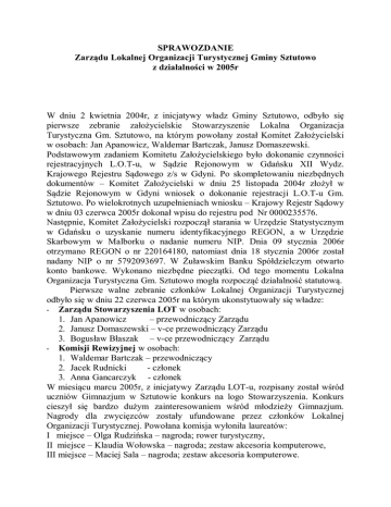 SPRAWOZDANIE Zarządu Lokalnej Organizacji Turystycznej Gminy Sztutowo z działalności w 2005r W dniu 2 kwietnia 2004r, z inicjatywy władz Gminy Sztutowo, odbyło się pierwsze zebranie założycielskie Stowarzyszenie Lokalna Organizacja Turystyczna Gm. Sztutowo, na którym powołany został Komitet Założycielski w osobach: Jan Apanowicz, Waldemar Bartczak, Janusz Domaszewski. Podstawowym zadaniem Komitetu Założycielskiego było dokonanie czynności rejestracyjnych L.O.T-u, w Sądzie Rejonowym w Gdańsku XII Wydz. Krajowego Rejestru Sądowego z/s w Gdyni. Po skompletowaniu niezbędnych dokumentów – Komitet Założycielski w dniu 25 listopada 2004r złożył w Sądzie Rejonowym w Gdyni wniosek o dokonanie rejestracji L.O.T-u Gm. Sztutowo. Po wielokrotnych uzupełnieniach wniosku – Krajowy Rejestr Sądowy w dniu 03 czerwca 2005r dokonał wpisu do rejestru pod Nr 0000235576. Następnie, Komitet Założycielski rozpoczął starania w Urzędzie Statystycznym w Gdańsku o uzyskanie numeru identyfikacyjnego REGON, a w Urzędzie Skarbowym w Malborku o nadanie numeru NIP. Dnia 09 stycznia 2006r otrzymano REGON o nr 220164180, natomiast dnia 18 stycznia 2006r został nadany NIP o nr 5792093697. W Żuławskim Banku Spółdzielczym otwarto konto bankowe. Wykonano niezbędne pieczątki. Od tego momentu Lokalna Organizacja Turystyczna Gm. Sztutowo mogła rozpocząć działalność statutową. Pierwsze walne zebranie członków Lokalnej Organizacji Turystycznej odbyło się w dniu 22 czerwca 2005r na którym ukonstytuowały się władze: - Zarządu Stowarzyszenia LOT w osobach: 1. Jan Apanowicz – przewodniczący Zarządu 2. Janusz Domaszewski – v-ce przewodniczący Zarządu 3. Bogusław Błaszak – v-ce przewodniczący Zarządu - Komisji Rewizyjnej w osobach: 1. Waldemar Bartczak – przewodniczący 2. Jacek Rudnicki - członek 3. Anna Gancarczyk - członek W miesiącu marcu 2005r, z inicjatywy Zarządu LOT-u, rozpisany został wśród uczniów Gimnazjum w Sztutowie konkurs na logo Stowarzyszenia. Konkurs cieszył się bardzo dużym zainteresowaniem wśród młodzieży Gimnazjum. Nagrody dla zwycięzców zostały ufundowane przez członków Lokalnej Organizacji Turystycznej. Powołana komisja wyłoniła laureatów: I miejsce – Olga Rudzińska – nagroda; rower turystyczny, II miejsce – Klaudia Wołowska – nagroda; zestaw akcesoria komputerowe, III miejsce – Maciej Sala – nagroda; zestaw akcesoria komputerowe. Na wniosek członków LOT – Urząd Gminy w Sztutowie uruchomił Informację Turystyczną w Sztutowie, która cieszyła się dużym zainteresowaniem turystów oraz kwaterodawców ze Sztutowa. Członkowie LOT-u /z własnych środków finansowych/ wykonali w 2005r pierwszy folder turystyczny, który był rozprowadzany na targach turystycznych w Katowicach, Białymstoku i Warszawie. W sezonie letnim 2005 – przedstawiciele Zarządu LOT-u uczestniczyli w organizacji imprez kulturalno-sportowych między inn: - DZIEŃ RYBAKA w Kątach Rybackich, - SZTUTOWSKIE LATO 2005, - KONCERTY zespołów estradowych na plaży w Kątach Rybackich, - FESTIWAL piosenki szantowej w Sztutowie, - MISTRZOSTWA Jantarowego Wybrzeża w piłce siatkowej plażowej i nożnej, - MISTRZOSTWA Polski zrzeszenia weteranów siatkówki, - NOCNY turniej siatkówki plażowej w Kątach Rybackich, Dzięki dużemu zaangażowaniu i wsparciu władz Gminy Sztutowo wydana została „GAZETA WCZASOWA” – informator dla turystów przebywających na wypoczynku nad morzem, zawierający m.in. kalendarz imprez, oraz wykaz bazy noclegowej w Gminie. Gazeta cieszyła się dużym uznaniem wśród wczasowiczów i kwaterodawców. Przedstawiciele Zarządu nawiązali kontakty i współpracę w zakresie rozwoju turystyki na Mierzei Wiślanej z: - Regionalną Organizacją Turystyczną w Gdańsku, oraz LOT-em w Krynicy Morskiej - Firmą „Słoneczna Mierzeja” z Sosnowca, - Redakcją „Dziennika Bałtyckiego” i „Kuriera Żuławskiego” oraz Starostwem Powiatowym w Nowym Dworze Gd. Realizując promocję regionu Mierzei Wiślanej kol. Domaszewski, za aprobatą członów LOT-u, zorganizował „Bank” zdjęć i bazę informacji członków LOT-u co w efekcie dało utworzenie folderu na lato 2006r, oraz strony internetowej www.lotsztutowo.mierzeja.pl Powstałe foldery będą eksponowane na targach turystycznych m.in. w Krakowie i Warszawie. Wszystkie działania organizacyjne były dotychczas finansowane ze środków własnych członków Stowarzyszenia. Z tytułu prowadzonej działalności gospodarczej w 2005r Zarząd Stowarzyszenia złożył w Urzędzie Skarbowym w Malborku zeznanie o wysokości osiągniętego dochodu przez podatnika podatku dochodowego od osób prawnych tj. CIT-8, oraz oświadczenie w sprawie CIT-2. W okresie sprawozdawczym Zarząd odbył 6 spotkań na których omawiane były bieżące sprawy organizacyjne i finansowe. Na dzień sporządzenia sprawozdania – zgodnie z złożonymi deklaracjami – Lokalna Organizacja Turystyczna Gminy Sztutowo liczy 30 członków. Zarząd LOT-u Gm. Sztutowo składa szczególne podziękowanie za wkład i współpracę w dążeniu do rozwoju turystyki na Mierzei Wiślanej dla: - Pani Iwony Tyburskiej – Wójta Gm. Sztutowo, - Pani Annie Góra – pracown. Gm. Sztutowo, oraz Panu Markowi Kozakiewiczowi – za pomoc w zakupie nagród dla laureatów konkursu na logo Lokalnej Organizacji Turystycznej Gm. Sztutowo, oraz Panu Markowi Felskiemu – za nieodpłatne udostępnienie lokalu na informację turystyczną w Sztutowie. ZARZĄD LOT Gm. Sztutowo