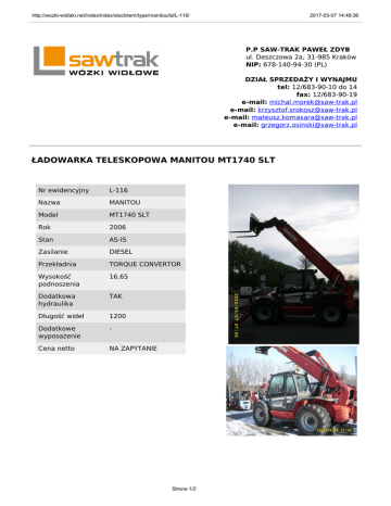 http://wozki-widlaki.net/index/index/stockitem/type/manitou/id/L-116/ 2017-03-07 14:49:36 P.P SAW-TRAK PAWEŁ ZDYB ul. Deszczowa 2a, 31-985 Kraków NIP: 678-140-94-30 (PL) DZIAŁ SPRZEDAŻY I WYNAJMU tel: 12/683-90-10 do 14 fax: 12/683-90-19 e-mail: [email protected] e-mail: [email protected] e-mail: [email protected] e-mail: [email protected] ŁADOWARKA TELESKOPOWA MANITOU MT1740 SLT Nr ewidencyjny L-116 Nazwa MANITOU Model MT1740 SLT Rok 2006 Stan AS-IS Zasilanie DIESEL Przekładnia TORQUE CONVERTOR Wysokość podnoszenia 16,65 Dodatkowa hydraulika TAK Długość wideł 1200 Dodatkowe wyposażenie - Cena netto NA ZAPYTANIE Strona 1/2 http://wozki-widlaki.net/index/index/stockitem/type/manitou/id/L-116/ Strona 2/2 Powered by TCPDF (www.tcpdf.org) 2017-03-07 14:49:37