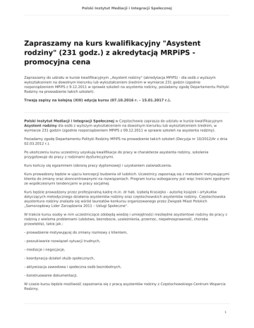 Polski Instytut Mediacji i Integracji Społecznej Zapraszamy na kurs kwalifikacyjny "Asystent rodziny" (231 godz.) z akredytacją MRPiPS promocyjna cena Zapraszamy do udziału w kursie kwalifikacyjnym ,,Asystent rodziny" (akredytacja MPiPS) - dla osób z wyższym wykształceniem na dowolnym kierunku lub wykształceniem średnim w wymiarze 231 godzin (zgodnie rozporządzeniem MPiPS z 9.12.2011 w sprawie szkoleń na asystenta rodziny, posiadamy zgodę Departamentu Polityki Rodziny na prowadzenie takich szkoleń). Trwają zapisy na kolejną (XIII) edycję kursu (07.10.2016 r. – 15.01.2017 r.). Polski Instytut Mediacji i Integracji Społecznej w Częstochowie zaprasza do udziału w kursie kwalifikacyjnym Asystent rodziny dla osób z wyższym wykształceniem na dowolnym kierunku lub wykształceniem średnim, w wymiarze 231 godzin (zgodnie rozporządzeniem MPiPS z 09.12.2011 w sprawie szkoleń na asystenta rodziny). Posiadamy zgodę Departamentu Polityki Rodziny MPiPS na prowadzenie takich szkoleń (Decyzja nr 10/2012/Ar z dnia 02.03.2012 r.). Po ukończeniu kursu uczestnicy uzyskują kwalifikacje do pracy w charakterze asystenta rodziny, szkolenie przygotowuje do pracy z rodzinami dysfunkcyjnymi. Kurs kończy się egzaminem (obroną pracy dyplomowej) i uzyskaniem zaświadczenia. Kurs prowadzony będzie w ujęciu koncepcji budzenia sił ludzkich. Uczestnicy zapoznają się z metodami motywującymi klienta do zmiany oraz skoncentrowanymi na rozwiązaniach. Program kursu wzbogacony jest więc treściami zgodnymi ze współczesnymi tendencjami w pracy socjalnej. Kurs będzie prowadzony przez profesjonalną kadrę m.in. dr hab. Izabelą Krasiejko - autorkę książek i artykułów dotyczących metodycznego działania asystentów rodziny oraz częstochowskich asystentów rodziny. Częstochowska asystentura rodziny znalazła się wśród laureatów konkursu organizowanego przez Związek Miast Polskich „Samorządowy Lider Zarządzania 2011 – Usługi Społeczne“. W trakcie kursu osoby w nim uczestniczące zdobędą wiedzę i umiejętności niezbędne asystentowi rodziny do pracy z rodziną z wieloma problemami (ubóstwo, bezrobocie, uzależnienia, przemoc, niepełnosprawność, choroba przewlekła), takie jak.: - prowadzenie motywującej do zmiany rozmowy z klientem, - poszukiwanie rozwiązań sytuacji trudnych, - mediacje i negocjacje, - koordynacja działań służb społecznych, - aktywizacja zawodowa i społeczna osób bezrobotnych, - konstruowanie dokumentacji. W czasie kursu będzie możliwość zapoznania się z pracą asystentów rodziny z Częstochowskiego Centrum Wsparcia Rodziny. 1 Polski Instytut Mediacji i Integracji Społecznej Kurs skierowany jest do: Osób przygotowujących się do roli zawodowej asystenta rodziny, posiadających wykształcenie średnie lub wykształcenie wyższe na kierunkach innych niż wymienione w art. 12 ust.1 p. pkt a ustawy z dnia 9 czerwca 2011 r. o wspieraniu rodziny i systemie pieczy zastępczej (Dz.U. Nr 149, poz.887) tj.: praca socjalna, socjologia, pedagogika. Zajęcia będą prowadzone przez wyspecjalizowaną kadrę: dr hab. Izabela Krasiejko - adiunkt w Zakładzie Pracy Socjalnej Akademii im. J. Długosza, konsultant metodyczny i asystent rodziny w Miejskim Ośrodku Pomocy Społecznej w Częstochowie, konsultant Podejścia Skoncentrowanego na Rozwiązaniach (szkolenie zaawansowane), autorka książki Metodyka działania asystenta rodziny (www.slaskwn.com.pl), książki Praca socjalna w praktyce asystenta rodziny (www.slaskwn.com.pl), Zawód asystenta rodziny w procesie profesjonalizacji. Wstęp do teorii i praktyki nowej profesji społecznej (www.weakapit.pl). dr Edyta Widawska - adiunkt w Zakładzie Teorii Wychowania Uniwersytetu Śląskiego w Katowicach, animatorka społeczna, trenerka umiejętności miękkich, mediator, konsultant Podejścia Skoncentrowanego na Rozwiązaniach (szkolenie zaawansowane). dr Zbigniew Wieczorek - adiunkt w Zakładzie Pedagogiki Społecznej i Terapii Pedagogicznej Akademii im. J. Długosza, posiada ukończone szkolenia dotyczące terapii w ujęciu różnych szkół terapeutycznych m.in. Podejścia Skoncentrowanego na Rozwiązaniach (szkolenie zaawansowane), NLP, terapii komunikacyjnej, poznawczo – behawioralnej. dr Agnieszka Miklewska – adiunkt w Zespole Badawczym Psychologii Stosowanej Akademii im. J.Długosza, psychoterapeuta, konsultant PSR (szkolenie zaawansowane), pełniła funkcję eksperta ds. wsparcia psychologicznego i oceny predyspozycji zawodowych przy Programie Aktywizacji Zawodowej Osób Niepełnosprawnych „Kroki ku pracy”. dr Sylwia Kita – adiunkt w Zakładzie Pedagogiki Społecznej i Terapii Pedagogicznej Akademii im. J. Długosza, mgr Monika Podgórska – psychoterapeuta, mediator, coach mgr Alina Kula - Kurator Okręgowy Sądu Okręgowego w Częstochowie mgr Lidia Zeller - mgr pedagogiki, Prezes Stowarzyszenie na rzecz pomocy dziecku i rodzinie ,,DLA RODZINY”, Kierownik Częstochowskiego Centrum Wsparcia Rodziny, w latach 2002 – 2011 Zastępca Dyrektora ds. Świadczeń Pomocy Społecznej w MOPS w Częstochowie. mgr Anna Imielińska – asystent rodziny mgr Beata Wawrzyńczak – specjalista terapii uzależnień. Informacje organizacyjne: Miejsce zajęć – Częstochowa Czas trwania kursu - 231 godzin (w tym 30 godzin praktyk) Termin kursu – 07.10.2016 r. – 15.01.2017 r. Terminy zjazdów: I zjazd: 07-09.10.2016 r. II zjazd: 21-23.10.2016 r. III zjazd: 04-06.11.2016 r. 2 Polski Instytut Mediacji i Integracji Społecznej IV zjazd: 18-20.11.2016 r. V zjazd: 03-04.12.2016 r. VI zjazd: 16-18.12.2016 r. VII zjazd (zakończony obroną pracy dyplomowej): 13-15.01.2017 r. Zajęcia praktyczne: termin do ustalenia Promocyjne ceny kursu! - dla uczestników indywidualnych (osób fizycznych) – 1845,00 zł brutto (1500 zł netto + 23%VAT ) - dla uczestników, których udział finansowany jest ze środków publicznych cena wynosi 1845,00 zł netto (VAT zwolniony - zgodnie z art. 43 ust. 1 pkt. 