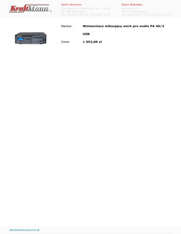 Salon Bemowo Salon Białołęka Powstańców Śląskich 87 lok. U10 B 01-466 Warszawa Tel. (22)427-89-95, (22)398-73-32 Kabrioletu 4 03-117 Warszawa Tel. (22)490-31-43, (22)243-36-05 Nazwa: Wzmacniacz miksujący work pro audio PA 40/2 USB Cena: akcesoriamuzyczne.pl 1 052,00 zł
