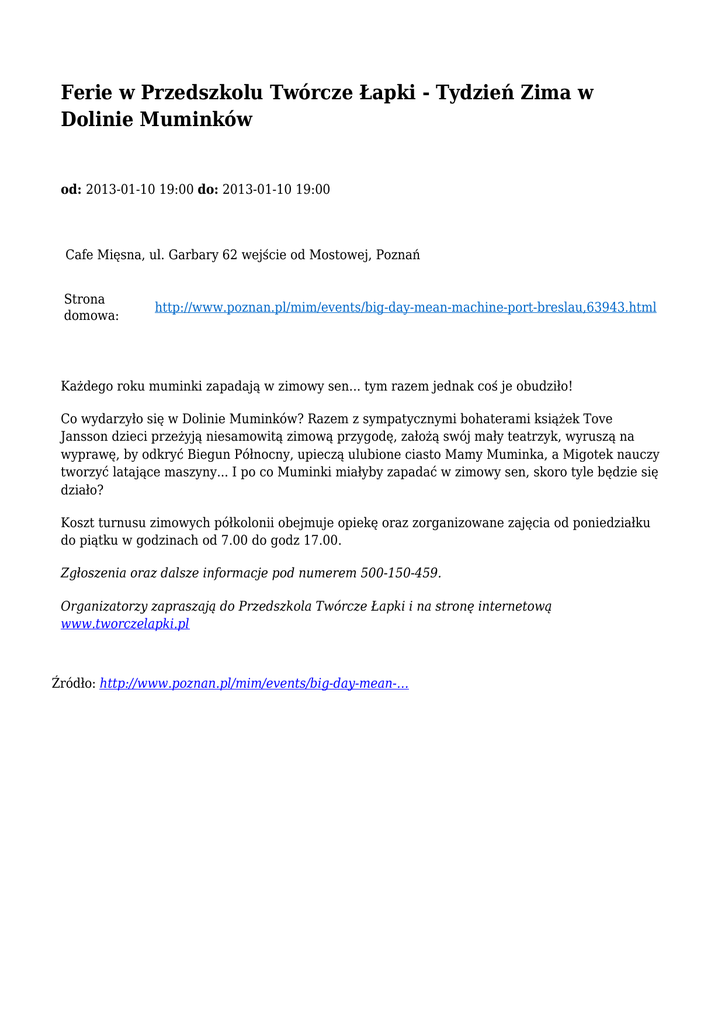Ferie w Przedszkolu Twórcze Łapki - Tydzień Zima w Dolinie Muminków od: 2013-01-10 19:00 do: 2013-01-10 19:00 Cafe Mięsna, ul. Garbary 62 wejście od Mostowej, Poznań Strona domowa: http://www.poznan.pl/mim/events/big-day-mean-machine-port-breslau,63943.html Każdego roku muminki zapadają w zimowy sen... tym razem jednak coś je obudziło! Co wydarzyło się w Dolinie Muminków? Razem z sympatycznymi bohaterami książek Tove Jansson dzieci przeżyją niesamowitą zimową przygodę, założą swój mały teatrzyk, wyruszą na wyprawę, by odkryć Biegun Północny, upieczą ulubione ciasto Mamy Muminka, a Migotek nauczy tworzyć latające maszyny... I po co Muminki miałyby zapadać w zimowy sen, skoro tyle będzie się działo? Koszt turnusu zimowych półkolonii obejmuje opiekę oraz zorganizowane zajęcia od poniedziałku do piątku w godzinach od 7.00 do godz 17.00. Zgłoszenia oraz dalsze informacje pod numerem 500-150-459. Organizatorzy zapraszają do Przedszkola Twórcze Łapki i na stronę internetową www.tworczelapki.pl Źródło: http://www.poznan.pl/mim/events/big-day-mean-…