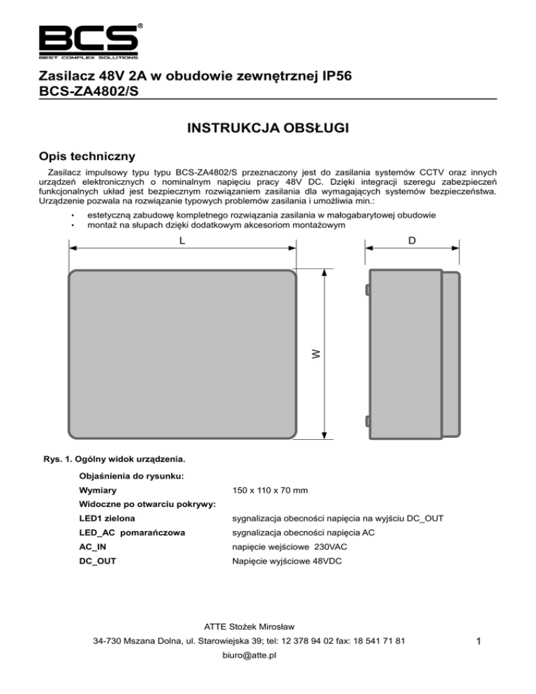 Zasilacz 48V 2A w obudowie zewnętrznej IP56 BCS-ZA4802/S INSTRUKCJA OBSŁUGI Opis techniczny Zasilacz impulsowy typu typu BCS-ZA4802/S przeznaczony jest do zasilania systemów CCTV oraz innych urządzeń elektronicznych o nominalnym napięciu pracy 48V DC. Dzięki integracji szeregu zabezpieczeń funkcjonalnych układ jest bezpiecznym rozwiązaniem zasilania dla wymagających systemów bezpieczeństwa. Urządzenie pozwala na rozwiązanie typowych problemów zasilania i umożliwia min.: • • estetyczną zabudowę kompletnego rozwiązania zasilania w małogabarytowej obudowie montaż na słupach dzięki dodatkowym akcesoriom montażowym D W L Rys. 1. Ogólny widok urządzenia. Objaśnienia do rysunku: Wymiary 150 x 110 x 70 mm Widoczne po otwarciu pokrywy: LED1 zielona sygnalizacja obecności napięcia na wyjściu DC_OUT LED_AC pomarańczowa sygnalizacja obecności napięcia AC AC_IN napięcie wejściowe 230VAC DC_OUT Napięcie wyjściowe 48VDC ATTE Stożek Mirosław 34-730 Mszana Dolna, ul. Starowiejska 39; tel: 12 378 94 02 fax: 18 541 71 81 [email protected] 1 Dane techniczne Obudowa Stopień ochrony obudowy Wymiary obudowy Montaż Typ zasilacza Sprawność Moc zasilacza Zakres napięcia wejściowego Napięcie wyjściowe Prąd wyjściowy Zabezpieczenie przed przeciążeniem zasilacza Zabezpieczenie przed zwarciem wyjścia DC_OUT Zabezpieczenie przed przepięciami Zakres temperatur pracy Tworzywo, kolor szary IP56 150 x 110 x 70 mm Uchwyty montażowe, możliwością zawieszenia impulsowy, sprawność około 93% >93% 96W – moc ciągła 180÷240V AC 50÷60 Hz 48V +/-3% max 2A zabezpieczenie elektroniczne na poziomie 3A zabezpieczenie elektroniczne (wymaga restartu zasilacza) Wejście AC – warystor, wyjście DC – dioda transil -10°C ... +40°C Instalacja i obsługa urządzenia Zasady bezpieczeństwa • • • • Urządzenie może być montowane tylko przez wykwalifikowanego instalatora, posiadającego odpowiednie zezwolenia i uprawnienia do przyłączania (ingerencji) w instalacje 230VAC oraz instalacje niskonapięciowe. Pomimo, że obudowa zasilacza posiada wysoki stopień ochrony to zaleca się aby urządzenie montować w miejscach chronionych przed bezpośrednim wpływem czynników atmosferycznych, w szczególności przed deszczem i nasłonecznieniem. Ponieważ zasilacz nie posiada wyłącznika umożliwiającego odłączenie zasilania sieciowego, należy powiadomić właściciela lub użytkownika urządzenia o sposobie odłączenia go od sieci (np. poprzez wskazanie bezpiecznika zabezpieczającego obwód zasilający). Obwody wyjściowe zasilacza są odizolowane od obwodów sieciowych. ATTE Stożek Mirosław 34-730 Mszana Dolna, ul. Starowiejska 39; tel: 12 378 94 02 fax: 18 541 71 81 [email protected] 2 UWAGA Przed przystąpieniem do instalacji oraz w trakcie prac konserwacyjnych należy upewnić się, że napięcie w obwodzie zasilającym 230VAC jest odłączone Instalacja urządzenia 1. Urządzenie zamontować w wybranym miejscu i doprowadzić przewody połączeniowe. 2. Przewody zasilające 230VAC podłączyć do zacisków L, N listwy śrubowej. 3. Załączyć zasilanie 230VAC. Jeżeli wszystkie połączenia zostały wykonane poprawnie to diody sygnalizacyjne na wewnętrznym module zasilacza powinny się zaświecić. W przypadku, gdy nie zaświeci się żadna z diod LED należy sprawdzić stan bezpiecznika umieszczonego w listwie śrubowej. 4. Po sprawdzeniu sygnalizacji działania zasilacza należy zamknąć obudowę. Sygnalizacja (wewnętrzny moduł zasilacza) • • Obecność zasilania AC oraz praca zasilacza sygnalizowana jest poprzez pomarańczową diodę LED AC. Obecność napięcia na wyjściach zasilacza sygnalizowana jest świeceniem zielonej diody LED1. Konserwacja • W przypadku wymiany bezpieczników należy używać zamienników zgodnych z oryginalnymi. ATTE Stożek Mirosław 34-730 Mszana Dolna, ul. Starowiejska 39; tel: 12 378 94 02 fax: 18 541 71 81 [email protected] 3 OZNAKOWANIE WEEE Zużytego sprzętu elektrycznego i elektronicznego nie wolno wyrzucać razem ze zwykłymi domowymi odpadami. Według dyrektywy WEEE obowiązującej w UE dla zużytego sprzętu elektrycznego i elektronicznego należy stosować oddzielne sposoby utylizacji. $Revision: 101 $ ATTE Stożek Mirosław 34-730 Mszana Dolna, ul. Starowiejska 39; tel: 12 378 94 02 fax: 18 541 71 81 [email protected] 4
