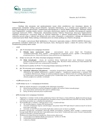 Rzeszów, dn.31.03.2016 r. Szanowni Państwo, Każdego dnia pracujemy nad uatrakcyjnieniem naszej oferty produktowej oraz nieustająco dążymy do podwyższania standardów obsługi naszych Klientów. Uprzejmie informujemy, że w ostatnim czasie podjęliśmy szereg działań zmierzających do uproszczenia i ujednolicenia obowiązujących w naszym Banku regulaminów. Dokonane zmiany treści Regulaminów wynikają między innymi z obowiązku dostosowania zapisów do aktualnie obowiązujących regulacji organizacji kartowych (VISA i Mastercard), rekomendacji Komisji Nadzoru Finansowego dotyczącej bezpieczeństwa transakcji internetowych, wytycznych Rady ds. Systemu Płatniczego w zakresie bezpieczeństwa kart zbliżeniowych, wdrożenia nowych usług w zakresie kart debetowych oraz zmian związanych z wydawaniem i obsługą kart debetowych wydawanych przez Bank. Mamy nadzieję, że dokonane przez nas zmiany spotkają się z Państwa akceptacją. W związku z powyższym Bank Spółdzielczy w Rzeszowie wprowadza zmiany w REGULAMINIE Otwierania i prowadzenia rachunków bankowych dla osób fizycznych, który obowiązywać będzie z dniem 06 czerwca 2016 roku. Przedstawiamy poniżej zakres zmian: w § 2: a) pkt. 9) otrzymuje nowe następujące brzmienie: 9) b) blokada karty (zastrzeżenie karty) – unieważnienie karty przez Bank lub Posiadacza rachunku/Użytkownika karty zgodnie z obowiązującymi przepisami prawa, zgodnie z obowiązującymi przepisami prawa, Umową lub umową o kartę debetową oraz Regulaminem; dodaje się nowy pkt. 29), który otrzymuje następujące brzmienie: 29) limity transakcyjne – kwota, do wysokości której Użytkownik karty może dokonywać transakcji gotówkowych lub bezgotówkowych w ciągu jednego dnia. Wysokość limitu ustalona jest indywidualnie dla każdej z wydanych kart oraz wymienionych transakcji; c) dotychczasowe punkty od 29) do 71) otrzymują kolejno numerację od 30) do 72) d) pkt. 56) otrzymuje nowe następujące brzmienie: 56) transakcja zbliżeniowa (bezstykowa) – transakcja bezgotówkowa dokonana przy użyciu karty z anteną zbliżeniową lub naklejki zbliżeniowej w punkcie usługowo – handlowym zaopatrzonym w terminal POS z czytnikiem zbliżeniowym. Polega na realizacji płatności poprzez zbliżenie karty do czytnika zbliżeniowego bez konieczności potwierdzania transakcji przez Użytkownika karty za pomocą numeru PIN lub poprzez złożenie podpisu na wydruku z terminala; w § 50 usuwa się ust. 6., w § 51 dodaje się ust. 5. o następującym brzmieniu: 5. ‒ Bank nie udziela akceptacji w przypadku próby dokonania transakcji: 1) której kwota przekracza wartość dostępnych środków lub wartość limitu transakcyjnego; 2) przy użyciu karty zastrzeżonej lub czasowo zablokowanej; 3) kartą, do której utracono prawo użytkowania. § 52 otrzymuje nowe następujące brzmienie: 1. 2. 3. Najpóźniej w terminie 14 dni od daty podpisania Umowy lub Umowy o kartę debetową, Bank przesyła pocztą na wskazany we wniosku adres korespondencyjny Posiadacza karty/Użytkownika karty kod PIN oraz kartę. Kod PIN oraz karta przesyłane są w odrębnej korespondencji. W przypadku gdy w terminie, o którym mowa w ust. 1 Użytkownik katy: 1) nie otrzyma koperty z kodem PIN lub kartą lub 2) stwierdzi uszkodzenie koperty umożliwiające odczytanie kodu PIN bądź danych zamieszczonych na karcie przez inne osoby lub 3) stwierdzi, że kod PIN jest nieczytelny bądź dane zamieszczone na karcie są błędne powinien niezwłocznie zawiadomić placówkę Banku prowadzącą rachunek, która wystąpi o wygenerowanie nowego kodu PIN do karty lub zleci wyprodukowanie nowej karty. Użytkownik karty może również samodzielnie ustanowić kod PIN w portalu kartowym. Wysłana przez Bank karta jest nieaktywna. Kartę można aktywować: 1) za pośrednictwem Infolinii Banku pod numerem +48 86 215 50 00; 2) za pośrednictwem portalu kartowego; 3) w placówce Banku. ‒ § 53 otrzymuje nowe następujące brzmienie: 1. 2. 3. 4. 5. 6. 7. 8. 9. 10. 11. w § 54 ust. 8. otrzymuje nowe następujące brzmienie: 8. Duplikat karty przesyłany jest w ciągu 14 dni kalendarzowych od dnia złożenia wniosku o wydanie duplikatu karty na adres korespondencyjny, wskazany we wniosku. w § 59 dodaje się ust. 7. o następującym brzmieniu: 7. Użytkownik karty jest zobowiązany do podpisania karty, podpisem zgodnym ze wzorem podpisu obowiązującym w Banku, z zastrzeżeniem, że naklejka zbliżeniowa nie wymaga podpisu. w § 56 ust. 2. otrzymuje nowe następujące brzmienie: 2. Posiadacz rachunku/Użytkownik karty może w każdym czasie wyłączyć funkcję płatności zbliżeniowych za pośrednictwem Infolinii Banku , portalu kartowego lub w placówce Banku. w § 55 ust. 1. otrzymuje nowe następujące brzmienie: 1. Karta niespersonalizowana wraz z kodem identyfikacyjnym PIN wydawana jest w Banku i może być używana przez osoby wymienione w § 50 ust. 3. Karta niespersonalizowana jest wydawana jako nieaktywna. W celu aktywowania karty należy wybrać jedną z metod opisanych w § 52 ust.3. Okres ważności karty niespersonalizowanej, z wyłączeniem naklejki zbliżeniowej, podany jest na awersie karty i kończy się w ostatnim dniu wskazanego na karcie miesiąca. W przypadku, gdy Posiadacz karty/Użytkownik karty stwierdzi uszkodzenie otrzymanego kodu PIN, w bezpiecznej kopercie z kodem PIN nie będzie kodu PIN lub będzie on niepełny oraz gdy kod PIN będzie niemożliwy do odczytu, wówczas Bank wydaje nową kartę z nowym kodem PIN. Użytkownik karty może również samodzielnie ustanowić kod PIN w portalu kartowym. Karty wydane jako niespersonalizowane wznawiane są jako karty spersonalizowane, z wyłączeniem naklejki zbliżeniowej. Okres ważności karty spersonalizowanej oraz naklejki zbliżeniowej wynosi 36 miesięcy, podany jest na awersie karty lub części, z której wyłamywana jest karta w przypadku naklejki zbliżeniowej i kończy się w ostatnim dniu wskazanego m