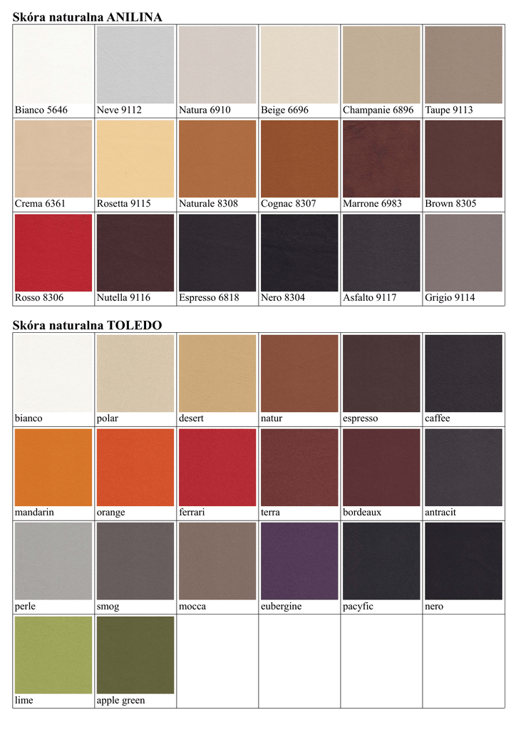 Skóra naturalna ANILINA Bianco 5646 Neve 9112 Natura 6910 Beige 6696 Champanie 6896 Taupe 9113 Crema 6361 Rosetta 9115 Naturale 8308 Cognac 8307 Marrone 6983 Brown 8305 Rosso 8306 Nutella 9116 Espresso 6818 Nero 8304 Asfalto 9117 Grigio 9114 Skóra naturalna TOLEDO bianco polar desert natur espresso caffee mandarin orange ferrari terra bordeaux antracit perle smog mocca eubergine pacyfic nero lime apple green