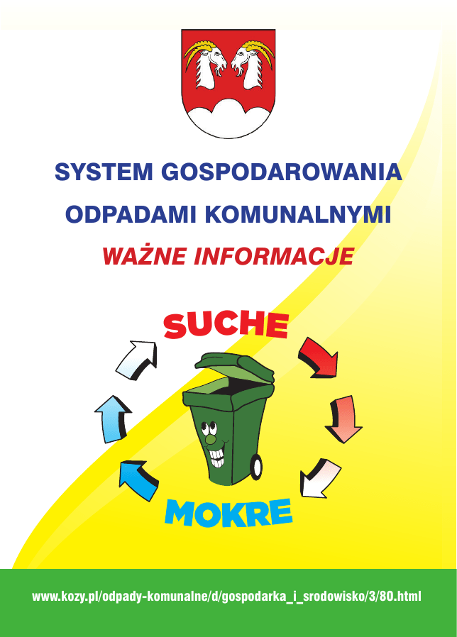 SYSTEM GOSPODAROWANIA ODPADAMI KOMUNALNYMI WAŻNE INFORMACJE SUCHE www.kozy.pl/odpady-komunalne/d/gospodarka_i_srodowisko/3/80.html UWAGA! Od 1 stycznia 2015 r. nową firmą odbierającą odpady komunalne z terenu Gminy Kozy, wyłonioną w drodze przetargu nieograniczonego, będzie SANIT-TRANS z siedzibą w Międzyrzeczu Górnym 383. SP. Z O.O. Właściciele nieruchomości, którzy dotychczas dzierżawili pojemniki od firmy SITA ZOM Sp. z o.o. mogą odkupić je od firmy na preferencyjnych warunkach, jednakże nie później niż do 31.12.2014r. Po tym terminie niewykupione pojemniki zostaną zabrane. Nie ma możliwości dalszego ich dzierżawienia. Zainteresowani powyższym powinni kontaktować się bezpośrednio z firmą SITA ZOM Sp. z o.o. pod nr telefonu: 33 499 20 00 lub osobiście w Biurze Obsługi Kontraktów przy ul. Gazowniczej 38, w Bielsku-Białej. Przypominamy! Pojemniki z odpadami należy bezwzględnie wystawiać do godziny 600 w dniu odbioru odpadów. Pojemniki muszą spełniać warunki normy polsko-europejskiej PN-EN 840. W innym przypadku odpady w nich zgromadzone mogą nie zostać odebrane. Każdy pojemnik ma określoną wytrzymałość. Nie należy przepełniać pojemników! www.kozy.pl/odpady-komunalne/d/gospodarka_i_srodowisko/3/80.html Przypominamy!!! 31 g r u d n i a 2 0 1 4 r. upływa termin uiszczenia ostatniej w tym roku opłaty za śmieci W związku z tym, że koniec roku zawsze obfituje w zwiększoną ilość wydatków, nie czekaj do ostatniej chwili z bieżącymi opłatami. www.kozy.pl/odpady-komunalne/d/gospodarka_i_srodowisko/3/80.html W związku z licznymi zgłoszeniami mieszkańców Gminy, w 2015r. zmianie ulegnie częstotliwość odbioru odpadów suchych, mokrych i zmieszanych. W sezonie letnim, tj. od maja do sierpnia odpady suche będą odbierane dwa razy w miesiącu. W pozostałym okresie, jak dotąd, jeden raz w miesiącu. Odpady mokre i zmieszane będą odbierane dwa razy w miesiącu, a nie jak dotąd - co dwa tygodnie. Częstotliwość odbioru pozostałych rodzajów odpadów pozostaje bez zmian. Harmonogram odbioru odpadów na rok 2015 zostanie przekazany przez firmę wywozową do dnia 20 grudnia 2014r. Pamiętaj! Odpady segregujemy z podziałem na suche, mokre i popiół. Osobno gromadzimy odpady niebezpieczne (pojemniki po farbach, lakierach, środkach ochrony roślin, żarówki, świetlówki, baterie, akumulatory, elektrośmieci) - są one odbierane w mobilnych punktach zbiórki. Przeterminowane lub częściowo wykorzystane leki dostarczamy do wyznaczonych aptek na terenie Gminy Kozy. www.kozy.pl/odpady-komunalne/d/gospodarka_i_srodowisko/3/80.html