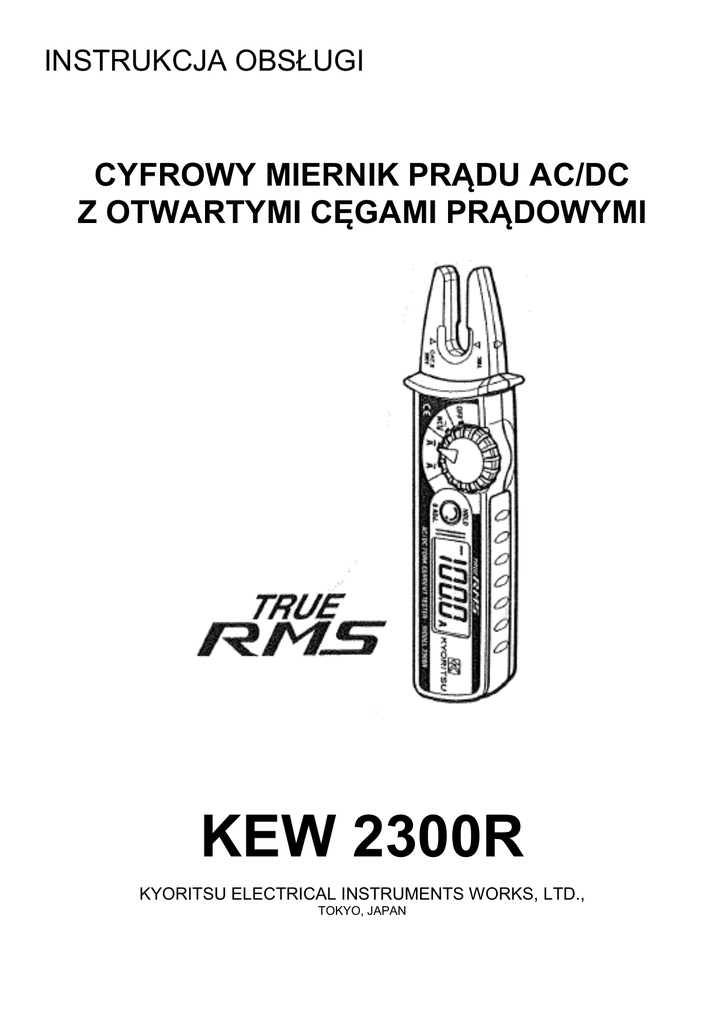 INSTRUKCJA OBSŁUGI CYFROWY MIERNIK PRĄDU AC/DC Z OTWARTYMI CĘGAMI PRĄDOWYMI KEW 2300R KYORITSU ELECTRICAL INSTRUMENTS WORKS, LTD., TOKYO, JAPAN 1. CECHY CHARAKTERYSTYCZNE Pomiar prądu AC/DC do 100A za pomocą otwartych cęgów nowego typu - bez potrzeby rozwierania obwodu, jak to ma miejsce w przypadku pomiarów prądu metodami tradycyjnymi Pomiar rzeczywistej wartości skutecznej prądu przemiennego – True RMS Specjalnie ukształtowane, małe, otwarte cęgi ułatwiają przeprowadzanie pomiarów w miejscach trudnodostępnych (duża ilość przewodów, wąskie otwory inspekcyjne, itp.) Funkcja NCV do bezdotykowego wykrywania przewodów pod napięciem (np. fazowych) APO (Auto Power Off) - funkcja automatycznego wyłączania zasilania po okresie bezczynności w celu przedłużenia żywotności baterii zasilających Data Hold - funkcja umożliwiająca zatrzymanie na wyświetlaczu wyniku pomiarów przeprowadzanych w miejscach słabo oświetlonych lub trudnodostępnych, a następnie ich odczyt w dogodnym miejscu Ergonomiczna, dwukomponentowa obudowa z rękojeścią i przełącznikiem obrotowym z miękkiego tworzywa umożliwiająca obsługę w jednej ręce Etui ochronne w komplecie Zgodny z PN-EN61010-2-032 Kat. III 300V,stopień zanieczyszczenia 2 2. UWAGI DOTYCZĄCE BEZPIECZEŃSTWA Instrukcja obsługi zawiera ostrzeżenia oraz zalecenia dotyczące bezpieczeństwa, które muszą być spełnione przez użytkownika aby bezpiecznie posługiwać się miernikiem, oraz przechowywać go we właściwych warunkach. Przed przystąpieniem do pomiarów należy dokładnie przeczytać niniejszą instrukcję. ! OSTRZEŻENIE Należy dokładnie i ze zrozumieniem przeczytać niniejszą instrukcję. Zachowaj niniejszą instrukcję aby w razie potrzeby móc z niej skorzystać. Dokonuj tylko takich pomiarów do jakich miernik jest przeznaczony. Instrukcję należy przeczytać ze zrozumieniem i przestrzegać wszystkich zaleceń w niej zawartych. W przeciwnym wypadku może dojść do wypadku, zniszczenia miernika lub testowanego urządzenia/obwodu. Taki symbol umieszczony na mierniku oznacza konieczność przeczytania odpowiednich uwag zawartych w instrukcji aby bezpiecznie posługiwać się przyrządem. ! 2 ! NIEBEZPIECZEŃSTWO określa takie warunki i działania, które mogłyby ! spowodować poważny wypadek lub obrażenia ciała. OSTRZEŻENIE określa takie warunki i działania, które mogą być bezpośrednią przyczyną poważnego wypadku lub ciężkich obrażeń. ! UWAGA określa takie warunki i działania, które mogą spowodować lekkie obrażenia bądź uszkodzenie testowanych urządzeń lub miernika. ! NIEBEZPIECZEŃSTWO Nie wolno dokonywać pomiarów w obwodach o napięciu powyżej 300V AC/DC. Nie wolno dokonywać pomiarów w otoczeniu, w którym obecne są gazy palne. Używanie miernika w takich warunkach może wywołać iskrzenia i spowodować eksplozję. Nigdy nie wolno przystępować do pomiarów z wilgotnymi rękami. Nie wolno przekraczać maksymalnych wartości na danym zakresie pomiarowym. Nie wolno otwierać przedziału baterii w czasie gdy dokonywane są pomiary. ! OSTRZEŻENIE Nie wolno dokonywać żadnych pomiarów jeżeli naruszona została struktura miernika (uszkodzona obudowa lub dostępne części przewodzące). Nie wolno samodzielnie dokonywać żadnych przeróbek ani napraw miernika. Należy zwrócić się do dystrybutora jeżeli miernik wymaga naprawy lub kalibracji. Nie wolno dokonywać wymiany baterii jeżeli powierzchnia miernika jest mokra. Przed otwarciem przedziału baterii w celu ich wymiany należy zawsze wyłączyć miernik. 3 ! UWAGA Przed przystąpieniem do pomiarów upewnij się, że przełącznik zakresów ustawiony jest we właściwej pozycji. Nie narażaj miernika na bezpośrednie działanie słońca, ekstremalnych temperatur i wilgoci. Po zakończeniu pomiarów przełącznik zakresów jest ustawiony w pozycji OFF. Gdy miernik nie będzie używany przez dłuższy czas należy wyjąć z niego baterie. Do czyszczenia miernika należy używać miękkiej szmatki zwilżonej w wodzie z niewielką ilością detergentu. Nie wolno stosować rozpuszczalników ani innych płynów agresywnych. 3. SPECYFIKACJA Prąd przemienny A True RMS* Funkcja Zakres Dokładność ACA 0…100.0A 2.0% odczytu 5cyfr (50/60Hz) 3.0% odczytu 5cyfr (50/60Hz) Prąd stały Funkcja DCA CF (współczynnik szczytu) CF ≤ 2 2 < CF ≤ 2.5 A Zakres 0... 100A Dokładność 2.0% odczytu 5cyfr (50/60Hz) Dokładności gwarantowane dla temperatury 23C 5C i wilgotności względnej RH 75% Bezdotykowa detekcja napięcia przemiennego NC V Funkcja Zakres NCV do 300VAC Wskazanie W normalnych warunkach (brak detekcji napięcia) : Lo W przypadku wykrycia napięcia (minimum 80VAC) : Hi Uwaga: Funkcja NCV (Non Contact Voltage) pozwala bezdotykowo wykryć napięcie (min. 80VAC) w przewodniku. Na czułość przyrządu może mieć wpływ obecność rur i innych przedmiotów metalowych, bliskość innych przewodów pod napięciem, sposób trzymania przyrządu oraz pozycja czujnika. 4 CF (współczynnik szczytu) Standard bezpieczeństwa zanieczyszcz. 2 CF ≤ 2.5 IEC 61010-1 Kat. III 300V, stopień IEC 61010-2-32, IEC 61326 (standard EMC) LCD, maks. wskazanie 1049, jednostki i Wyświetlacz symbole Sygnalizacja przekroczenia zakresu symbol „OL” (tylko na funkcjach prądowych) Czas odpowiedzi / próbkowanie ok. 2 sekundy / ok. 2 x/s Temperatura i wilgotność pracy 0C ÷ 40C, wilg. wzgl. 85% (bez kondensacji) Temperatura i wilgotność składowania -20C ÷ 60C, RH 85% (bez kondensacji) Zasilanie / pobór prądu 2 baterie R03 1,5V / ~12mA lub mniej Automatyczne wyłączanie zasilania po około 10 minutach od ostatniego przełączenia Zabezpieczenia AC/DCA : 120A AC/DC przez 10s ACV (NCV) : 360V AC przez 10s Wytrzymałość elektryczna 3700VAC przez 1min. (obudowa – obwód) Rezystancja izolacji 10MΩ / 1000V między obudową a obwodem Maksymalna średnica przewodnika 10mm Wymiary / waga 161.3 x 40.2 x 30.3mm / 110g z ba