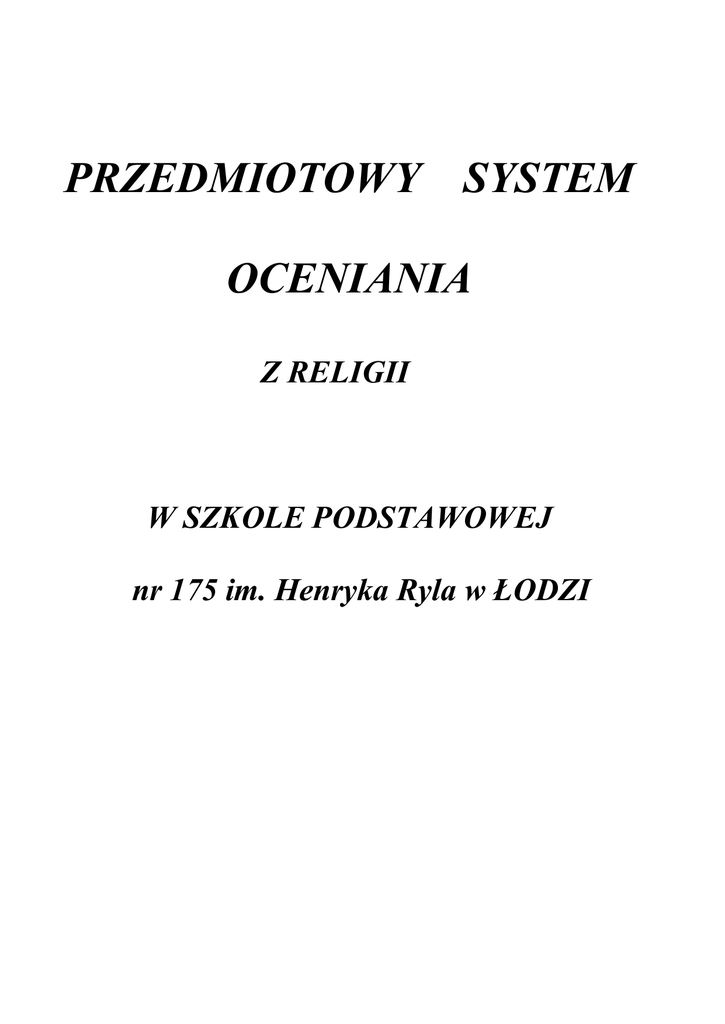 PRZEDMIOTOWY SYSTEM OCENIANIA Z RELIGII W SZKOLE PODSTAWOWEJ nr 175 im. Henryka Ryla w ŁODZI I Kontrakt 1. Sprawdzanie i ocenianie osiągnięć ucznia występuje w całym procesie katechizacji. 2. Sprawdzanie osiągnięć ucznia dokonywane jest różnymi metodami: odpowiedzi ustnej, prac praktycznych, testów wiadomości i umiejętności. 3. Uczeń ma prawo być raz – dwa w semestrze nieprzygotowany do zajęć. 4. O nie przygotowaniu do zajęć (brak zeszytu, podręcznika, pracy domowej) uczeń informuje nauczyciela na początku katechezy. 5. Brak pracy domowej uczeń powinien uzupełnić w okresie najbliższych zajęć. 6. Brak pracy domowej nie może być tłumaczony nieobecnością ucznia w szkole. 7. Sprawdziany są obowiązkowe (zgodnie z terminarzem). Jeżeli uczeń z przyczyn losowych nie mógł go napisać, może to zrobić w innym terminie za zgodą obydwu stron. Sprawdzian powinien być zapowiedziany z tygodniowym wyprzedzeniem. 8. Uczeń może poprawić sprawdzian w terminie wspólnie ustalonym z katechetą ( w przeciągu 4 tygodni). Do dziennika wpisuje się obie oceny, przy czym bierze się pod uwagę ocenę wyższą. 9. W przypadku nieobecności w szkole uczeń powinien we własnym zakresie uzupełnić wiadomości oraz brakujące notatki i ćwiczenia. 10. Uczeń ma prawo do oceny za prace dodatkowe. Uczestnictwo ucznia w konkursie, olimpiadzie czy aktywne uczestnictwo w życiu parafii i stowarzyszeniu (przynależność do kółka zainteresowań) – podnosi ocenę ucznia. 11. Zeszyt ucznia sprawdzany jest dwa razy w semestrze (systematyczność i estetyka). II Cele katechetyczne: Budzenie zainteresowania przesłaniem Bożym; Uzdolnienie do odczytania w nauczaniu biblijnym wezwania Bożego dla swojego życia; Przygotowanie do samodzielnego odbioru tekstów; Ukazywanie wiary jako pomocy w zrozumieniu swego życia i świata; Zdobycie umiejętności symbolizowania, czynnego, świadomego i radosnego włączenia się w liturgii Kościoła; Pogłębione przeżywanie roku liturgicznego i sakramentów; Interpretacja ludzkiego (ucznia) doświadczenia w świetle wezwania Bożego - kształtowanie sumienia; Kształtowanie refleksyjnej postawy wobec różnych sytuacji życiowych i zobowiązań moralnych; Pomoc w przygotowaniu do przemian okresu dojrzewania; Gotowość otwarcia się na Boga w modlitwie; Poczucie przynależności, posiadanie własnego miejsca i zadań w społeczności Kościoła, rodziny, koleżeńskiej, narodu; Przyjęcie postawy motywującej do odpowiedzialnego uczestnictwa; Kształtowanie postawy odpowiedzialności; Odpowiedzialne podjęcie zadań w najbliższym otoczeniu; Odnajdywanie własnego miejsca i zadań w życiu rodziny, szkoły, Kościoła i innych społecznościach; Świadectwo życia; Budowanie postawy świadectwa. III Osiągnięcia Znajomość podstawowych fragmentów Pisma Świętego i ich przesłania; Umiejętność odczytania przesłania poznanych fragmentów biblijnych; Umiejętność integrowania poznanych informacji z aktualnymi wyzwaniami; Znajomość symboli wiary; Znajomość religijnych korzeni wybranych elementów kultury polskiej; Znajomość istoty okresów liturgicznych, ich odczytywanie w kontekście biblijnym i życia chrześcijańskiego; Znajomość symboliki liturgicznej; Aktywne uczestnictwo w Eucharystii; Znajomość istoty sakramentów; Zastosowanie wskazań prawa Bożego w konkretnych sytuacjach życiowych; Umiejętność kształtowania własnego sumienia, osobowości, charakteru w oparciu o prawo Boże; Umiejętność rozwiązywania podstawowych problemów wiary; Hierarchizacja podstawowych wartości moralnych; Ocena poglądów i postaw własnych i innych ludzi; Znajomość sposobów i rodzajów modlitwy oraz biblijnych wzorów modlitwy; Umiejętność samodzielnego formułowania modlitw; Postawa uznania błędu, przeproszenia, dziękczynienia, uwielbienia; Umiejętność rozwiązywania trudnych sytuacji w duchu chrześcijańskim; Umiejętność reagowania na niewłaściwe zachowania; Odczytywanie własnych zadań we wspólnocie: rodzinnej, kościelnej, koleżeńskiej, szkolnej; Umiejętność wyrażania własnych opinii; Zaangażowanie w różne formy apostolstwa; Postawa akceptacji i tolerancji; Znajomość biblijnych przykładów odpowiedzi na Boże wezwanie. IV Obszary oceniania 1. Sprawdziany, kartkówki. 2. Konkursy. 3. Odpowiedzi ustne (aktywność). 4. Prace domowe. 5. Znajomość: modlitwy, katechizmu, tematyki biblijnej. 6. Praca w grupie. 7. Prace dodatkowe (inicjatywy twórcze, przygotowanie pomocy, udział w konkursach, przynależność do stowarzyszeń i grup modlitewnych). 8. Udział w życiu parafii (schola, ministrantura, szkolne koło Caritas, misterium, spektakl, oaza, kółka zainteresowań). V Rodzaje narzędzi 1. Sprawdziany, testy, quizy, krzyżówki. 2. Kartkówki (materiał nie więcej niż z trzech ostatnich lekcji). 3. Wypowiedzi ustne. VI Źródła wiedzy o uczniu: VII codzienna obserwacja, rozmowy, jakość zadawanych pytań i odpowiedzi przez ucznia. W ocenianiu z religii obowiązują poniższe zasady: 1. Obiektywność – zastosowanie jednolitych norm i kryteriów oceniania.. 2. Jawność – podawanie na bieżąco wyników pracy ucznia (rodzicom lub opiekunom na ich zapotrzebowanie lub gdy zaistnieje taka potrzeba ze strony szkoły). 3. Instruktywność – wskazanie na występujące braki. 4. Mobilizacja do dalszej pracy. VIII IX Sposoby oceniania: wartościowanie gestem, słowem (pochwała), mimiką, stopniem, dyplomem Wymiar oceny 1. Dydaktyczny – wynika z programów nauczania, mierzona przede wszystkim testami kompetencji (wiedza, umiejętności, aktywność, praca na lekcji). 2. Społeczno – dydaktyczny – określa postawy i cechy osobowościowe ucznia, jego funkcjonowanie w grupie, emocjonalne zaangażowanie, wynikające np. z trudności rodzinnych. 3. Dydaktyczno – prognostyczna – powinna informować o stopniu znajomości zagadnienia niekoniecznie w oparciu o program wyłącznie szko