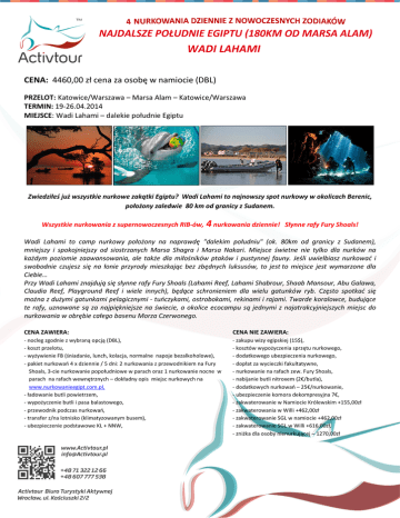 NAJDALSZE POŁUDNIE EGIPTU (180KM OD MARSA ALAM) WADI LAHAMI CENA: 4460,00 zł cena za osobę w namiocie (DBL) PRZELOT: Katowice/Warszawa – Marsa Alam – Katowice/Warszawa TERMIN: 19-26.04.2014 MIEJSCE: Wadi Lahami – dalekie południe Egiptu Zwiedziłeś już wszystkie nurkowe zakątki Egiptu? Wadi Lahami to najnowszy spot nurkowy w okolicach Berenic, położony zaledwie 80 km od granicy z Sudanem. Wszystkie nurkowania z supernowoczesnych RIB-ów, 4 nurkowania dziennie! Słynne rafy Fury Shoals! Wadi Lahami to camp nurkowy położony na naprawdę "dalekim południu" (ok. 80km od granicy z Sudanem), mniejszy i spokojniejszy od siostrzanych Marsa Shagra i Marsa Nakari. Miejsce świetne nie tylko dla nurków na każdym poziomie zaawansowania, ale także dla miłośników ptaków i pustynnej fauny. Jeśli uwielbiasz nurkować i swobodnie czujesz się na łonie przyrody mieszkając bez zbędnych luksusów, to jest to miejsce jest wymarzone dla Ciebie… Przy Wadi Lahami znajdują się słynne rafy Fury Shoals (Lahami Reef, Lahami Shabrour, Shaab Mansour, Abu Galawa, Claudia Reef, Playground Reef i wiele innych), będące schronieniem dla wielu gatunków ryb. Często spotkać się można z dużymi gatunkami pelagicznymi - tuńczykami, ostrobokami, rekinami i rajami. Twarde koralowce, budujące te rafy, uznawane są za najpiękniejsze na świecie, a okolice ecocampu są jednymi z najatrakcyjniejszych miejsc do nurkowania w obrębie całego basenu Morza Czerwonego. CENA ZAWIERA: CENA NIE ZAWIERA: - nocleg zgodnie z wybraną opcją (DBL), - koszt przelotu, - wyżywienie FB (śniadanie, lunch, kolacja, normalne napoje bezalkoholowe), - pakiet nurkowań 4 x dziennie / 5 dni: 2 nurkowania z przewodnikiem na Fury Shoals, 3-cie nurkowanie popołudniowe w parach oraz 1 nurkowanie nocne w parach na rafach wewnętrznych – dokładny opis miejsc nurkowych na www.nurkowanieegipt.com.pl, - ładowanie butli powietrzem, - wypożyczenie butli i pasa balastowego, - przewodnik podczas nurkowań, - transfer z/na lotnisko (klimatyzowanym busem), - ubezpieczenie podstawowe KL + NNW, - zakupu wizy egipskiej (15$), - kosztów wypożyczenia sprzętu nurkowego, - dodatkowego ubezpieczenia nurkowego, - dopłat za wycieczki fakultatywne, - nurkowanie na rafach zew. Fury Shoals, - nabijanie butli nitroxem (2€/butla), - dodatkowych nurkowań – 25€/nurkowanie, - ubezpieczenie komora dekompresyjna 7€, - zakwaterowanie w Namiocie Królewskim +155,00zł - zakwaterowania w Willi +462,00zł - zakwaterowanie SGL w namiocie +462,00zł - zakwaterowanie SGL w Willi +616,00zł, - zniżka dla osoby nienurkującej – 1270,00zł RAMOWY PROGRAM IMPREZY*: Dzień 1 – Dzień wylotu: Zbiórka na lotniku na 2,5 godziny przed wylotem Wylot do Marsa Alam Transfer z lotniska do campu (ok. 2,5h z lotniska w Marsa Alam) Zakwaterowanie w namiotach Lunch Zapoznanie z bazą, omówienie szczegółów, przygotowanie sprzętu nurkowego Kolacja i czas wolny Dzień 2-6 (pakiet 5 dni nurkowych) ** Śniadanie ok. godziny 06:00 Przygotowanie do wypłynięcia na 2 nurkowania (nurkowanie z RIB – u) Dwa nurkowania na rafach Fury Shoals (w przerwie można przekąsić kawę/herbatę i ciasto) Powrót do campu na lunch Sjesta Trzecie nurkowanie na pobliskich rafach (nurkowanie z RIB – u) Powrót do bazy Przygotowanie do nurkowania nocnego (nurkowanie z RIB – u) Czwarte nurkowanie nocne Powrót na kolację, czas wolny, nocleg Dzień 7 Śniadanie Czas wolny – możliwość skorzystania z wycieczek fakultatywnych – info na www.nurkowanieegipt.com.pl Lunch Czas wolny, kolacja, przygotowanie do wyjazdu, czas wolny, nocleg Dzień 8 – Dzień wyjazdu: Śniadanie Wykwaterowanie z campu Transfer na lotnisko w Marsa Alam Odprawa paszportowo-bagażowa Przylot do Polski, zakończenie imprezy. * - dokładny program imprezy uzależniony jest od godzin przelotu ** - w przypadku kursu OWD w przeciągu dnia odbywają się zajęcia praktyczne i teoretyczne, kurs trwa od 3-5 dni. *** - Doba pobytowa zaczyna się o godz. 14.00 a kończy o godz. 12.00. Przy zakwaterowaniu przed rozpoczęciem doby hotelowej pobierana jest na miejscu dopłata w wysokości połowy stawki dziennej za zakwaterowanie. Przy wykwaterowaniu po zakończeniu doby hotelowej pobierana jest na miejscu dopłata w wysokości połowy stawki dziennej za zakwaterowanie. OPIS CAMPU Do miejsc nurkowych dociera się pontonami typu RIB. Przewodnicy opracowali program podwodnych wycieczek, trwających z reguły 60 minut każda. Wymagane jest minimum 20 zalogowanych nurkowań i obowiązkowe posiadanie komputera nurkowego (można go wypożyczyć na miejscu za 10 EUR/dzień). Jedynie dwa pierwsze nurkowania w ciągu dnia odbywają się w asyście przewodnika. Trzecie nurkowanie wykonywane jest samodzielnie (w parach), podobnie jak nocne. Zaplecze nurkowe wyposażone jest w zbiorniki ze słodką wodą do płukania sprzętu i wieszaki na sprzęt, a także w dostęp do elektryczności 220 V do ładowania akumulatorów latarek. Zaleca się, by korzystający z elektryczności goście posiadali szybkie ładowarki (max. 6 godzin). Butle znajdujące się na wyposażeniu Wadi Lahami są aluminiowe o pojemności 12 l. Ponadto, po nurkowaniu można skorzystać z pryszniców. Podczas pobytu w Wadi Lahami zapewniane jest pełne wyżywienie - 3 posiłki w ciągu dnia i słodka przekąska na podwieczorek. Ci z gości, którzy wymagają specjalnej diety, proszeni są o zgłoszenie tego faktu w momencie dokonywania rezerwacji. W przypadku wykonywania nurkowań nocnych nurkowie proszeni są o zgłaszanie, czy kolacja ma być podana przed czy po nurkowaniu. Do posiłków przewidziane są zimne napoje, woda, kawa i herbata, piwo dostępne za opłatą. Wszystkie płatne napoje i usługi zostaną rozliczone zbiorczym rachunkiem pod koniec pobytu. Zaleca się, by goście Wadi Lahami mieli przy sobie gotówkę lub czeki podróżne, bowiem przy płatności kartą doliczana jest dopłata w wysokości 3%. Rzeczy wartościowe mo