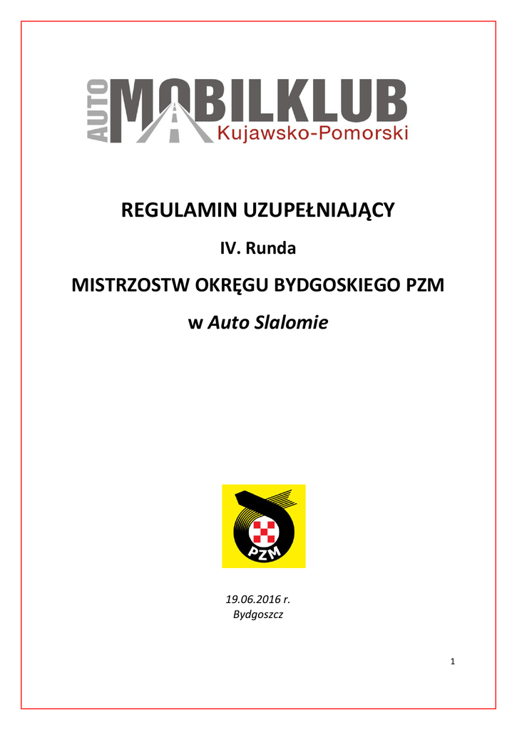 REGULAMIN UZUPEŁNIAJĄCY IV. Runda MISTRZOSTW OKRĘGU BYDGOSKIEGO PZM w Auto Slalomie 19.06.2016 r. Bydgoszcz 1 Zawody zorganizowane zgodnie z Międzynarodowym Kodeksem Sportowym FIA oraz jego Załącznikami i Regulaminem Sportowym PZM 1. Program Zawodów: 10.06.2016 19.06.2016 10:00 10:00 - 11:00 11:15 11:30 - 12:00 12:10 16:30 17:00 Otwarcie listy zgłoszeń Zamknięcie listy zgłoszeń Odbiór Administracyjny / Badanie Kontrolne Odprawa uczestników Zapoznanie z Trasą Start pierwszego uczestnika Ogłoszenie wyników prowizorycznych Ogłoszenie wyników oficjalnych / zakończenie zawodów Biuro Zawodów Przyjmowanie zgłoszeń e-mail [email protected] do 17.06.2016, godz. 15:00 Automobilklub KujawskoPomorski, ul. Białogardzka 7, 85-808 Bydgoszcz. Tel. 790-484-804. oraz w dniu 19.06.2016 godz. 9:30 - 10:00 ZO PZM Bydgoszcz (Kartodrom) ul. Fordońska 116, 85-739 Bydgoszcz. 2. Organizator: Automobilklub Kujawsko-Pomorski ul. Białogardzka 7, 85-808 Bydgoszcz, tel. 693-529-066 e-mail [email protected] Zawody rozgrywane są w oparciu o następujące przepisy: - Międzynarodowy Kodeks Sportowy FIA wraz z załącznikami (MKS FIA), - Regulamin Konkursowej Jazdy Samochodowej 2016 (KJS) - Regulamin Ochrony Środowiska w Sportach Motorowych PZM - Regulamin Ramowy Mistrzostwa Okręgu Bydgoskiego w Auto Slalomie na rok 2016, - Regulamin Uzupełniający Zawodów zatwierdzony przez OKSS. 3. Numer wizy ZO PZM: OKSS.III.420.18.2016 z dnia 05.06.2016r 4. Data i Miejsce: Zawody odbędą się dnia 19.06.2016, ZO PZM Bydgoszcz (Kartodrom) ul. Fordońska 116, Bydgoszcz. 2 5. Osoby Oficjalne Zespół Sędziów Sportowych Przewodniczący: Magdalena Bajerska I-484/12 Członek: Marcin Jettka I-513/12 Członek: Krzysztof Studziński I-003/12 Dyrektor Zawodów: Mirosław Urbaczewski I-560/13 Kierownik zabezpieczenia i trasy: Piotr Kobus I-612/14 Kierownik BK: Bartłomiej Gołąb II-02052 Kierownik PO 1: Dominika Jettka II-02004 Kierownik PO 2: Gabriela Kałamarska II- Tel. 606911003 Małgorzata Urbaczewska Kierownik Biura Zawodów: II 02007 Ratownik Medyczny: Damian Dębecki T/10104275/14 Kamil Urbaczewski S/K/251/2015 Komisarz Ochrony Środowiska: (lic s. II-02005) Asystent Dyrektora zawodnikami: ds. Kontaktu z Marta Kobus II-02003, tel. 790484804 6. Dopuszczeni zawodnicy Do udziału w zawodach dopuszczone są wszystkie osoby posiadające aktualne prawo jazdy, (co najmniej) kategorii. B oraz spełniające wymagania regulaminów sportu samochodowego dotyczącego Auto Slalomu. 7. Zgłoszenia: 7.1. Aby zgłosić udział w zawodach należy skorzystać z formularza zamieszczonego pod adresem internetowym www.akkp.pl Formularz będzie dostępny od dnia 10.06 godz. 8:00. W dniu zawodów 19.06.2016r można zgłaszać się w godzinach od 9:30 do 10:00 w biurze zawodów. Maksymalna ilość uczestników dopuszczonych do zawodów wynosi 50 załóg. 3 7.2. Wysokość wpisowego za udział w rundzie wynosi: 80zł dla uczestników zrzeszonych w klubie sfederowanym w PZM i opłaconą składką na rok 2016. 110 zł dla pozostałych uczestników legitymujących się 7.3. Do startu zostaną dopuszczeni wszyscy kierowcy posiadający ważne prawo jazdy minimum kategorii B oraz ważne ubezpieczenie OC i zalecane NNW. 8. Odbiór administracyjny – rejestracja zawodników Weryfikacja dokumentów potwierdzających uprawnienia do kierowania pojazdem i karta przynależności klubowej. 9. Podział na klasy: K1 -( Art. 251 Zał. „J” pkt.1.2 klasa 1-7) - samochody z silnikami o pojemności do 1.400 cm3 K2 -(Art. 251 Zał. „J” pkt.1.2 klasa 8) - sam. z silnikami o poj. ponad 1.400 do 1.600 cm3 K3 -(Art. 251 Zał. „J” pkt.1.2 klasa 9) - sam. z silnikami o poj. ponad 1.600 do 2000 cm3 K4 - (Art. 251 Zał. „J” pkt.1.2 klasa 10-16) - sam. z silnikami o poj. ponad 2000 do 5.500 cm3, oraz pojazdy z napędem na 4 koła bez względu na pojemność silnika OPEN - pozostałe samochody (w tym buggy) Gość- kierowca/zawodnik posiadający licencję. Samochody posiadające silniki benzynowe z turbodoładowaniem zaliczone zostaną do klasy według pojemności wynikającej z pomnożenia pojemności silnika przez współczynnik 1,7. Natomiast samochody z silnikami wysokoprężnymi z turbodoładowaniem przez współczynnik 1,5. 10. Trasa Długość trasy: 1017m. Nawierzchnia: asfalt 11. Przebieg Zawodów: Uczestnicy będą mieli do pokonania trzykrotny przejazd wyznaczonej pachołkami (słupkami) trasy na czas. Dwa najlepsze czasy będą liczone do klasyfikacji końcowej zawodów. Pomiar czasu odbywać się będzie za pomocą fotokomórki. Uczestnicy nie zatrzymują się na linii mety (meta lotna), zatrzymanie następuje na linii mety stop. 12. Falstart i kary czasowe za wykroczenia: Mają zastosowanie przepisy pkt. 11 Regulaminu Ramowego MOB PZM w Auto Slalomie 2016. 13. Punktacja: Według pkt. 10 Regulaminu Ramowego MOB PZM w Auto Slalomie na rok 2016. 4 14. Klasyfikacja Zawodnicy będą klasyfikowani w MOB PZM w Auto Slalomie, w poszczególnych klasach oraz klasyfikacji generalnej zgodnie z ustaleniami opublikowanymi w pkt 15 Regulaminu Ramowego MOB PZM w Auto Slalomie na rok 2016. 15. Wyposażenie bezpieczeństwa uczestnika Podczas przejazdów zapoznawczych, treningowych i wyścigowych kierujący uczestnicy zobowiązani są do: a) używania kasku, który posiada homologacje dopuszczającą do sportu samochodowego (w sezonie 2016 dopuszcza się z utraconą homologacją) b) zaleca się używanie kombinezonu (dopuszczone jest używanie kombinezonu z utraconą homologacją FIA Standard 1986 ). c) zaleca się bieliznę (długa), balaklawę, skarpety – dopuszczone jest również używanie ww. wyposażenia osobistego z utraconą normą ISO 6940. d) zaleca się używanie butów i rękawic – dopuszczone jest używanie ww. wyposażenia osobistego z utraconą normą ISO 6940. e) poruszania się w zapiętych pasach bezpieczeństwa. f) poruszania się z zamkniętą szybą boczną, po stronie kierującego. 16. Nagrody Mają zastosowanie przepisy 