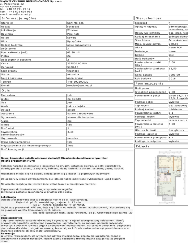 ŚLĄSKIE CENTRUM NIERUCHOMOŚCI Sp. z o.o. ul. Panewnicka 22 40-709 Katowice tel.: +48 32 721 75 12 kom.: +48 602 699 053 email: [email protected] Informacje ogólne Nieruchomość Oferta nr SCN-MS-526 Standard 4 Rodzaj sprzedaż Opłaty w czynszu Lokalizacja Wrocław administracja, remontowy, sp Dzielnica Psie Pole Opłaty wg liczników gaz, prąd, wod Kowale Rodzaj mieszkania jednopoziomow Byczyńska Stan lokalu Do wykończeni nowe budownictwo Mies. czynsz admin. 280,00 Ilość pokoi 3 Okna nowe PCV Pow. całkowita [m2] 62.50 m² Instalacje nowe 2p Balkon jest 2 Ilość balkonów 1 Cena 337500.00 PLN Powierzchnia działki [m2] 0.00 Cena/m2 5400.00 własność Powierzchnia użytkowa [m2] 62,50 Stan prawny Status aktualna Cena garażu 9000,00 Imię i nazwisko Anna Kryzar Rok budowy 2016 Telefon +48 602102939 E-mail [email protected] Rejon Ulica Rodzaj budynku Piętro Ilość pięter w budynku Opis Pomieszczenia Ilość pokoi 3 Wysokość pomieszczeń 2,80 Powierzchnia pokoi salon 18,3, 1 s 12,9, 2 sypialn Plac zabaw tak Widok na osiedle Gaz jest Podłogi pokoi wylewka Woda tak - miejska Typ kuchni bez zabudowy Dojazd asfalt Rodzaj kuchni oddzielna działki zabudowane Powierzchnia kuchni 8,1 własne dla budynku Podłoga kuchni wylewka Alarm nie Typ łazienki razem z wc, z Winda tak 1 Powierzchnia łazienki [m2] 5,00 Ilość wind Powierzchnia balkonów/tarasów 3,40 Glazura łazienki bez glazury Podłoga łazienki wylewka Otoczenie Ogrzewanie Usytuowanie narożne Powierzchnia przedpokoi 8,7 Drzwi antywłamaniowe tak Podłoga przedpokoi Przystosowania dla niepełnosprawnych True Zdjęcia Ilość kondygnacji 2 Nowe, kameralne osiedle otoczone zielenią!! Mieszkania do odbioru w tym roku! Objete programem MDM! Polecam narożne mieszkanie 3 pokojowe na drugim, ostatnim piętrze, w pełni rozkładowe, składające się z salonu, 2 sypialni, balkonu, dużej łazienki z oknem, ustawnej jasnej kuchni. Mieszkanie mieści się na osiedlu składającym się z dwóch, 2 piętrowych budynków. Do odbioru w stanie developerskim, ale istnieje także możliwość wykończenia „pod klucz”. Na osiedlu znajdują się jeszcze inne wolne lokale o mniejszym metrażu. Zapraszam do kontaktu ze mną w sprawie szczegółów. Inwestycja zostanie zakończona w grudniu 2016 roku. Lokalizacja Osiedle zlokalizowane jest w odległości 400 m od ul. Swojczyckiej. Dojazd do pl. Grunwaldzkiego, zajmie ok 12 min. Do CH Korona dojedziemy w 10 minut. Najbliższy przystanek MPK znajduje się 200 m od osiedla, liniami autobusowymi, dostaniemy się do głównych węzłów komunikacyjnych miasta. Dla osób ceniących ruch, jazda rowerem, do pl. Grunwaldzkiego zajmie 20 min. Bezpieczeństwo Cały teren osiedla zostanie oświetlony i ogrodzony, a wjazd zabezpieczony szlabanem. Strefy prywatnych ogródków oddzielono żywopłotem i ogrodzeniem, co zapewni poczucie intymności. Inwestycja zostanie również objęta całodobowym monitoringiem. Na osiedlu powstanie bezpieczny plac zabaw dla dzieci, stojaki na rowery, ławeczki, na których można odpocząć przed domem oraz starannie dobrane obiekty małej architektury. Rekreacja W strefie rekreacyjnej, do wyłącznego użytku mieszkańców, znajdą się urządzenia znane z wrocławskich outdoor fitnessów, dzięki czemu codzienny trening można zacząć tuż za progiem domu. wylewka W pobliżu osiedla przebiega również grobla Swojczycko-Kowalska, a wzdłuż niej trasa rekreacyjna chętnie uczęszczana przez biegaczy. Pobliskie zielone tereny otwarte i cieki wodne to doskonałe miejsca spacerowe. Niedaleko inwestycji rozpoczynają się również trasy rowerowe wśród zieleni, a w słoneczne popołudnia będzie można spędzić czas przy stoliku szachowym. Mapa ŚLĄSKIE CENTRUM NIERUCHOMOŚCI Sp. z o.o. ul. Panewnicka 22 40-709 Katowice tel.: +48 32 721 75 12 kom.: +48 602 699 053 email: [email protected]