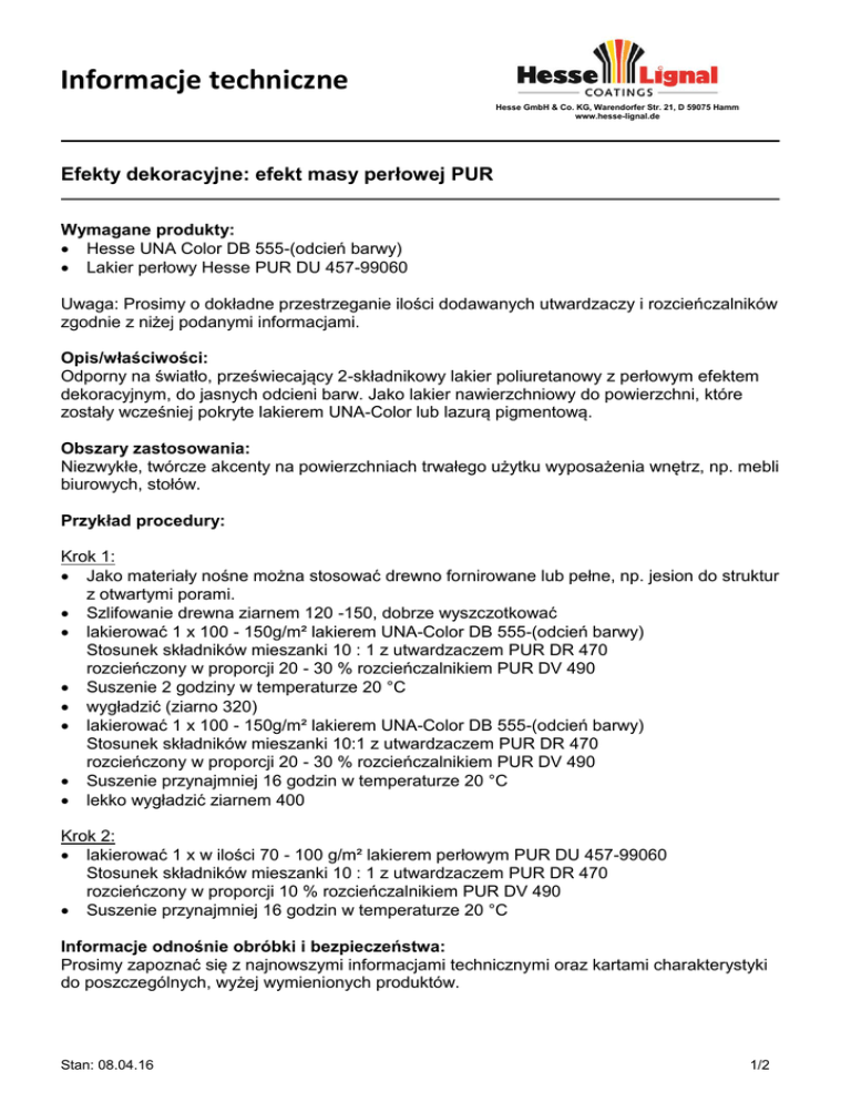 Informacje techniczne Hesse GmbH & Co. KG, Warendorfer Str. 21, D 59075 Hamm www.hesse-lignal.de Efekty dekoracyjne: efekt masy perłowej PUR Wymagane produkty: Hesse UNA Color DB 555-(odcień barwy) Lakier perłowy Hesse PUR DU 457-99060 Uwaga: Prosimy o dokładne przestrzeganie ilości dodawanych utwardzaczy i rozcieńczalników zgodnie z niżej podanymi informacjami. Opis/właściwości: Odporny na światło, przeświecający 2-składnikowy lakier poliuretanowy z perłowym efektem dekoracyjnym, do jasnych odcieni barw. Jako lakier nawierzchniowy do powierzchni, które zostały wcześniej pokryte lakierem UNA-Color lub lazurą pigmentową. Obszary zastosowania: Niezwykłe, twórcze akcenty na powierzchniach trwałego użytku wyposażenia wnętrz, np. mebli biurowych, stołów. Przykład procedury: Krok 1: Jako materiały nośne można stosować drewno fornirowane lub pełne, np. jesion do struktur z otwartymi porami. Szlifowanie drewna ziarnem 120 -150, dobrze wyszczotkować lakierować 1 x 100 - 150g/m² lakierem UNA-Color DB 555-(odcień barwy) Stosunek składników mieszanki 10 : 1 z utwardzaczem PUR DR 470 rozcieńczony w proporcji 20 - 30 % rozcieńczalnikiem PUR DV 490 Suszenie 2 godziny w temperaturze 20 °C wygładzić (ziarno 320) lakierować 1 x 100 - 150g/m² lakierem UNA-Color DB 555-(odcień barwy) Stosunek składników mieszanki 10:1 z utwardzaczem PUR DR 470 rozcieńczony w proporcji 20 - 30 % rozcieńczalnikiem PUR DV 490 Suszenie przynajmniej 16 godzin w temperaturze 20 °C lekko wygładzić ziarnem 400 Krok 2: lakierować 1 x w ilości 70 - 100 g/m² lakierem perłowym PUR DU 457-99060 Stosunek składników mieszanki 10 : 1 z utwardzaczem PUR DR 470 rozcieńczony w proporcji 10 % rozcieńczalnikiem PUR DV 490 Suszenie przynajmniej 16 godzin w temperaturze 20 °C Informacje odnośnie obróbki i bezpieczeństwa: Prosimy zapoznać się z najnowszymi informacjami technicznymi oraz kartami charakterystyki do poszczególnych, wyżej wymienionych produktów. Stan: 08.04.16 1/2 Informacje techniczne Hesse GmbH & Co. KG, Warendorfer Str. 21, D 59075 Hamm www.hesse-lignal.de Efekty dekoracyjne: efekt masy perłowej PUR Wskazówki specjalne: Efekt masy perłowej można uzyskać tylko na odcieniach pastelowych. Lakier perłowy należy nanosić równomiernie, różne grubości powłok zmieniają odcień barwy, zbyt duże gramatury powłoki powodują zmętnienie. W celu uzyskania indywidualnych odcieni barwy można do lakieru perłowego PUR DU 45799060 wmieszać 5 - 10 % lakieru UNA-Color DB 555-(odcień barwy). Nanoszenie następuje wtedy jak w przypadku lakieru warstwowego, jako podkład i jako warstwa wierzchnia. Przed użyciem dobrze wymieszać! Lakiery PUR nie powinny być używane i nie powinny schnąć w temperaturach materiału i pokojowej poniżej 18 °C. W celu uniknięcia zaburzeń przyczepności powierzchnie z lakierami poliuretanowymi (PUR) należy przeszlifować świeżo przed lakierowaniem. Utwardzone powłoki spełniają wymagania normy DIN 68861-1B (Powierzchnie mebli; właściwości przy obciążeniu chemicznym), normy DIN EN 71-3 (Bezpieczeństwo zabawek), jak również wcześniejszej normy DIN 53160 (Badanie odporności na ślinę i pot) i nie zawierają formaldehydu. Prosimy przeprowadzić lakierowanie próbne. Uwaga: Przedstawione informacje mają charakter doradczy, opierają się na najlepszej wiedzy i starannych badaniach, zgodnie z aktualnym stanem techniki. Informacje te nie mają charakteru prawnie wiążącego. Oprócz tego odsyłamy Państwa do naszych warunków handlowych. Karta charakterystyki zgodnie z dyrektywą 91/155/EWG zostanie udostępniona. Stan: 08.04.16 2/2