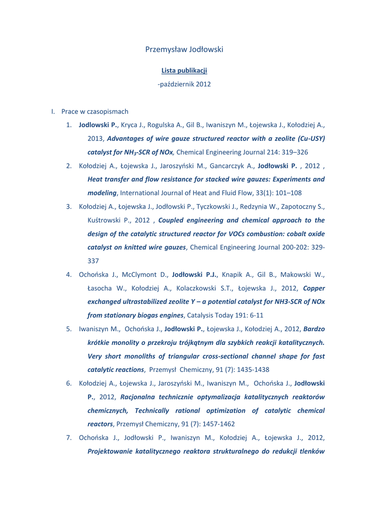 Przemysław Jodłowski Lista publikacji -październik 2012 I. Prace w czasopismach 1. Jodlowski P., Kryca J., Rogulska A., Gil B., Iwaniszyn M., Łojewska J., Kołodziej A., 2013, Advantages of wire gauze structured reactor with a zeolite (Cu-USY) catalyst for NH3-SCR of NOx, Chemical Engineering Journal 214: 319–326 2. Kołodziej A., Łojewska J., Jaroszyński M., Gancarczyk A., Jodłowski P. , 2012 , Heat transfer and flow resistance for stacked wire gauzes: Experiments and modeling, International Journal of Heat and Fluid Flow, 33(1): 101–108 3. Kołodziej A., Łojewska J., Jodłowski P., Tyczkowski J., Redzynia W., Zapotoczny S., Kuśtrowski P., 2012 , Coupled engineering and chemical approach to the design of the catalytic structured reactor for VOCs combustion: cobalt oxide catalyst on knitted wire gauzes, Chemical Engineering Journal 200-202: 329337 4. Ochońska J., McClymont D., Jodłowski P.J., Knapik A., Gil B., Makowski W., Łasocha W., Kołodziej A., Kolaczkowski S.T., Łojewska J., 2012, Copper exchanged ultrastabilized zeolite Y – a potential catalyst for NH3-SCR of NOx from stationary biogas engines, Catalysis Today 191: 6-11 5. Iwaniszyn M., Ochońska J., Jodłowski P., Łojewska J., Kołodziej A., 2012, Bardzo krótkie monolity o przekroju trójkątnym dla szybkich reakcji katalitycznych. Very short monoliths of triangular cross-sectional channel shape for fast catalytic reactions, Przemysł Chemiczny, 91 (7): 1435-1438 6. Kołodziej A., Łojewska J., Jaroszyński M., Iwaniszyn M., Ochońska J., Jodłowski P., 2012, Racjonalna technicznie optymalizacja katalitycznych reaktorów chemicznych, Technically rational optimization of catalytic chemical reactors, Przemysł Chemiczny, 91 (7): 1457-1462 7. Ochońska J., Jodłowski P., Iwaniszyn M., Kołodziej A., Łojewska J., 2012, Projektowanie katalitycznego reaktora strukturalnego do redukcji tlenków azotu. Ocena aktywności i metody syntezy katalizatorów na bazie zeolitów powstawionych kationem miedzi, Przemysł Chemiczny, 91 (9): 1842 II. Prace pokonferencyjne i doniesienia zjazdowe 8. Jodłowski P.J., Gołąb R., Ochońska J., Kołodziej A., Iwaniszyn M., Kolaczkowski S.T., Łojewska J., 2012, Wire gauze reactor for CH4 and CO removal from biogas-fuelled engine exhaust, Preprints, 9th International Congress on Catalysis and Automotive Pollution Control, Brussels, vol. 3: 287-297 9. Iwaniszyn M., Ochońska J., Jodłowski P., Łojewska J., Matuszek-Chmurowska A., Kołodziej A., 2012, Microstructured reactor as a pre-turbo catalytic converter, 9th International Congress on Catalysis and Automotive Pollution Control, Brussels, vol. 3: 3279-286 10. Iwaniszyn M., Ochońska J., Garncarczyk A., Jodłowski P., Knapik A., Łojewska J., Janowska-Renkas E., Kołodziej A., 2012, Short-channel structured reactor as a catalytic afterburner, 9th International Congress on Catalysis and Automotive Pollution Control, Brussels, vol.3: 87-96 11. Ochońska J., Rogulska A., Jodłowski P., Gil B., Roth W., Iwaniszyn M., Kołodziej A., Łojewska J., 2012, Zeolite catalysts in structured reactors for NH3-SCR of NOx from biogas engines: active center design, 9th International Congress on Catalysis and Automotive Pollution Control, Brussels, vol. 2: 77 -86 12. Knapik A. W., Jodłowski P.J., Kołodziej A., Kapica R., Tyczkowski J., Łojewska J., 2009, Zastosowanie strukturalnych katalizatorów opartych na tlenku kobaltu do dopalania LZO jako alternatywa do monolitów ceramicznych promowanych metalami szlachetnymi, Materiały IV Krakowskiej Konferencji Młodych Uczonych, Kraków, 333-342 13. Jodłowski P. J., Jodłowski G.S., 2008, Serwatka jako substrat do otrzymywania biogazu w procesie fermentacji metanowej, Materiały III Krakowskiej Konferencji Młodych Uczonych, Kraków, 93-98