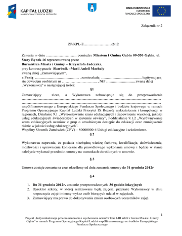 Załącznik nr 2 ZP/KPL-E…………………../2/12 Zawarta w dniu ……………………. pomiędzy Miastem i Gminą Gąbin 09-530 Gąbin, ul. Stary Rynek 16 reprezentowaną przez Burmistrza Miasta i Gminy – Krzysztofa Jadczaka, przy kontrasygnacie Skarbnik –Marii Anieli Machały zwaną dalej „Zamawiającym”, a Panią ………………………………… . zamieszkałą: ……………………………… legitymującą się dowodem osobistym nr ……………………….. , NIP …………………….. zwaną dalej „Wykonawcą” o następującej treści: §1 Zamawiający zleca, a Wykonawca zobowiązuje się do przeprowadzenia …………………………………………………………………………………………………… …………………………………………………………………………………………………… współfinansowanego z Europejskiego Funduszu Społecznego i budżetu krajowego w ramach Programu Operacyjnego Kapitał Ludzki Priorytet IX Rozwój wykształcenia i kompetencji w regionach, Działanie 9.1 „Wyrównywanie szans edukacyjnych i zapewnienie wysokiej, jakości usług edukacyjnych świadczonych w systemie oświaty”, Poddziałanie 9.1.2 „Wyrównywanie szans edukacyjnych uczniów z grup o utrudnionym dostępie do edukacji oraz zmniejszenie różnic w jakości usług edukacyjnych”. Wspólny Słownik Zamówień (CPV) – 80000000-4 Usługi edukacyjne i szkoleniowe. §2 Wykonawca zapewnia, że posiada niezbędną wiedzę fachową, kwalifikacje, doświadczenie, możliwości i uprawnienia konieczne dla prawidłowego wykonania umowy i będzie w stanie należycie wykonać przedmiot umowy na warunkach określonych w umowie. §3 Umowa zostaje zawarta na czas określony od dnia zawarcia umowy do 31 grudnia 2012r §4 1. Do 31 grudnia 2012r. zostanie przeprowadzonych 30 godzin lekcyjnych 2. Dyrektor szkoły, w której realizowane będą zajęcia, przekaże Wykonawcy w dniu rozpoczęcia zajęć imienny wykaz osób biorących udział w zajęciach. 3. Zamawiający ma prawo do dokonywania zmian osobowych uczestników zajęć. 1 Projekt „Indywidualizacja procesu nauczania i wychowania uczniów klas I-III szkół z terenu Miasta i Gminy Gąbin” w ramach Programu Operacyjnego Kapitał Ludzki współfinansowanego ze środków Europejskiego Funduszu Społeczcznego §5 1. Wykonawca w porozumieniu z dyrektorem szkoły przygotuje szczegółowy harmonogram zajęć na okres obowiązywania umowy w terminie do 7 dni od zawarcia umowy oraz niezwłocznie dostarczy go Zamawiającemu. 2. Strony zastrzegają sobie możliwość zmian w harmonogramie zajęć pod warunkiem przedstawienia ich dyrektorowi szkoły z siedmiodniowym wyprzedzeniem (siedem dni kalendarzowych). 3. W przypadku niemożliwości realizowania przez Wykonawcę przedmiotu umowy zgodnie z harmonogramem zajęć, spowodowanej usprawiedliwioną nieobecnością trwającą w miesiącu nie dłużej niż pięć dni roboczych w sumie lub następujących kolejno po sobie, przy czym przez usprawiedliwioną nieobecność rozumie się wyłącznie nieobecność udokumentowaną zwolnieniem lekarskim lub innym dokumentem urzędowym, Wykonawca zobowiązany jest do przeprowadzenia zajęć w ilości godzin równej nieodbytym zajęciom, w innym terminie uzgodnionym z dyrektorem szkoły, w której prowadzone będą zajęcia. 4. Poza przypadkiem określonym w ust. 3 dopuszcza się odpracowanie przez Wykonawcę niezrealizowanych godzin lekcyjnych w terminach ustalonych z dyrektorem szkoły. §6 1. Do podstawowych obowiązków Wykonawcy należy: 1) przygotowanie szczegółowego programu zajęć w formie pisemnej i przedstawienie go do zatwierdzenia dyrektorowi szkoły, w której będą realizowane zajęcia, o których mowa § 1 umowy - w terminie 7 dni od podpisania umowy oraz niezwłoczne dostarczenie go Zamawiającemu, 2) przeprowadzenie zajęć zgodnie z programem i harmonogramem zatwierdzonym przez dyrektora szkoły, w której będą realizowane zajęcia, o których mowa § 1 umowy, 3) niezwłoczne informowanie dyrektora szkoły o każdym przypadku uniemożliwiającym mu realizację zajęć zgodnie z harmonogramem, 4) zapewnienie ładu i porządku w czasie zajęć, bezpieczeństwa uczniów uczestniczącym w zajęciach oraz zgodnego z przeznaczeniem użytkowania sprzętu, materiałów i pomocy dydaktycznych, 5) bieżące dokumentowanie prowadzonych zajęć w dzienniku zajęć oraz bieżąca kontrola frekwencji i monitorowania osiągnięć uczniów, 6) przeprowadzenie i dokonanie zbiorczej analizy ankiet ewaluacyjnych (których treść uzgodniona będzie wcześniej z dyrektorem szkoły) na pierwszych i ostatnich zajęciach w każdym semestrze oraz w każdej grupie i przekazanie analizy dyrektorowi w terminie 14 dni od zakończenia zajęć w danym semestrze. 7) sporządzenie raportu z realizacji zajęć po ich zakończeniu i złożenia go dyrektorowi szkoły wraz z ostatnim rachunkiem/fakturą, 2 Projekt „Indywidualizacja procesu nauczania i wychowania uczniów klas I-III szkół z terenu Miasta i Gminy Gąbin” w ramach Programu Operacyjnego Kapitał Ludzki współfinansowanego ze środków Europejskiego Funduszu Społeczcznego 8) przestrzeganie przepisów ustawy z dnia 29 sierpnia 1997 r. o ochronie danych osobowych ( Dz. U. z 2002 r. Nr 101 poz. 926 z późn. zm.) oraz rozporządzenia Ministra Spraw Wewnętrznych i Administracji z dnia 29 kwietnia 2004 r. w sprawie dokumentacji przetwarzania danych osobowych oraz warunków technicznych i organizacyjnych, jakim powinny odpowiadać urządzenia i systemy informatyczne służące do przetwarzania danych osobowych (Dz. U. Nr 100, poz. 1024), 9) niezwłoczne udostępnianie dokumentacji z zakresu realizacji umowy na żądanie uprawnionemu przedstawicielowi Zamawiającego, dyrektorowi szkoły, organowi kontrolującemu. 2. Wykonawca ponosi pełną odpowiedzialność za: 1) bezpieczeństwo uczniów w czasie trwania zajęć, 2) jakość i 