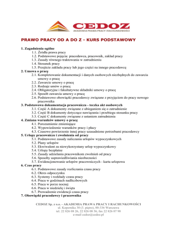 PRAWO PRACY OD A DO Z - KURS PODSTAWOWY 1. Zagadnienia ogólne 1.1. Źródła prawa pracy 1.2. Podstawowe pojęcia: pracodawca, pracownik, zakład pracy 1.3. Zasady równego traktowania w zatrudnieniu 1.4. Stosunek pracy 1.5. Przejście zakładu pracy lub jego części na innego pracodawcę 2. Umowa o pracę 2.1. Kompletowanie dokumentacji i danych osobowych niezbędnych do zawarcia umowy o pracę 2.2. Zawarcie umowy o pracę 2.3. Rodzaje umów o pracę 2.4. Obligatoryjne i fakultatywne składniki umowy o pracę 2.5. Sposób zawarcia umowy o pracę 2.6. Podstawowe obowiązki pracodawcy związane z przyjęciem do pracy nowego pracownika 3. Podstawowa dokumentacja pracownicza - teczka akt osobowych 3.1. Część A dokumenty związane z ubieganiem się o zatrudnienie 3.2. Część B dokumenty dotyczące nawiązania i przebiegu stosunku pracy 3.3. Część C dokumenty związane z ustaniem zatrudnienia 4. Zmiana warunków umowy o pracę 4.1. Porozumienie zmieniające 4.2. Wypowiedzenie warunków pracy i płacy 4.3. Czasowe powierzenie innej pracy uzasadnione potrzebami pracodawcy 5. Urlopy pracownicze i zwolnienia od pracy 5.1. Podstawowe zasady naliczania urlopów wypoczynkowych 5.2. Plany urlopów 5.3. Ekwiwalent za niewykorzystany urlop wypoczynkowy 5.4. Urlopy bezpłatne 5.5. Zasady udzielania pracownikom zwolnień od pracy 5.6. Sposoby usprawiedliwiania nieobecności 5.7. Ewidencjonowanie urlopów pracowniczych - karta urlopowa 6. Czas pracy 6.1. Podstawowe zasady rozliczania czasu pracy 6.2. Okres odpoczynku 6.3. Systemy i rozkłady czasu pracy 6.4. Praca w godzinach nadliczbowych 6.5. Praca w porze nocnej 6.6. Praca w niedzielę i święta 6.7. Prowadzenie ewidencji czasu pracy 7. Obowiązki pracodawcy i pracownika CEDOZ Sp. z o.o. - AKADEMIA PRAWA PRACY I RACHUNKOWOŚCI ul. Kopernika 30 (3. piętro), 00-336 Warszawa tel. 22 826 08 26, 22 826 08 56, fax 22 826 07 98 e-mail [email protected] 7.1. Podstawowe obowiązki pracodawcy 7.2. Podstawowe obowiązki pracownika 7.3. Zakaz konkurencji 7.4. Obowiązek pracodawcy w zakresie ułatwienia podnoszenia kwalifikacji zawodowych pracowników 7.5. Regulamin pracy 7.6. Nagrody i wyróżnienia 7.7. Odpowiedzialność porządkowa pracownika 7.8. Obowiązki pracodawcy w zakresie współpracy ze związkami zawodowymi 8. Odpowiedzialność materialna pracowników 8.1. Odpowiedzialność za szkodę wyrządzoną pracodawcy 8.2. Odpowiedzialność pracowników za mienie powierzone 9. Uprawnienia pracowników związane z rodzicielstwem 9.1. Ochrona pracy kobiet ciężarnych 9.2. Uprawnienia dotyczące sprawowania opieki nad dzieckiem 9.3. Urlopy macierzyńskie 9.4. Urlopy wychowawcze 10. Rozwiązywanie stosunku pracy 10.1. Na mocy porozumienia stron 10.2. Rozwiązanie umowy o pracę za wypowiedzeniem 10.3. Rozwiązanie umowy o pracę bez wypowiedzenia 10.4. Z upływem czasu, na który była zawarta 10.5. Wygaśnięcie stosunku pracy 10.6. Rozwiązanie umowy o pracę z przyczyn dotyczących pracodawcy 10.7. Świadectwo pracy - szczegółowa treść oraz sposób i tryb jego wydawania CEDOZ Sp. z o.o. - AKADEMIA PRAWA PRACY I RACHUNKOWOŚCI ul. Kopernika 30 (3. piętro), 00-336 Warszawa tel. 22 826 08 26, 22 826 08 56, fax 22 826 07 98 e-mail [email protected]