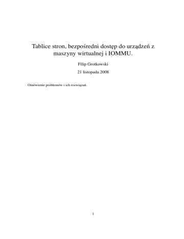 Tablice stron, bezpośredni dost˛ep do urzadzeń ˛ z maszyny wirtualnej i IOMMU. Filip Grotkowski 21 listopada 2008 Omówienie problemów i ich rozwiazań. ˛ 1 Spis treści 1 Tablice stron 1.1 Shadow Page Table . . . . . . . . . . . . . . . . . . . . . . . 1.2 AMD Nested Page Table . . . . . . . . . . . . . . . . . . . . 1.2.1 Wprowadzenie . . . . . . . . . . . . . . . . . . . . . 1.2.2 Szczegóły . . . . . . . . . . . . . . . . . . . . . . . . 1.2.3 Koszt translacji . . . . . . . . . . . . . . . . . . . . . 1.2.4 Oszcz˛edność pami˛eci . . . . . . . . . . . . . . . . . . 1.2.5 Wpływ rozmiaru strony na szybkość nested page’ingu 1.3 Intel Extended Page Table . . . . . . . . . . . . . . . . . . . 2 Bezpośredni dost˛ep do urzadze ˛ ń z maszyny wirtualnej 3 IOMMU 3.1 IOMMU a wirtualizacja . . . . . . . . . . . . . . . . 3.2 AMD IOMMU . . . . . . . . . . . . . . . . . . . . 3.3 Intel VT-d . . . . . . . . . . . . . . . . . . . . . . . 3.3.1 Rzutowanie adresów na chronione dziedziny 3.3.2 Tłumaczenie adresów . . . . . . . . . . . . . 3.3.3 Rzutowanie VT-d DMA . . . . . . . . . . . 3.3.4 Rzutowanie przerwań VT-d . . . . . . . . . 3.3.5 Zastosowanie . . . . . . . . . . . . . . . . . 3.3.6 Cache’owanie wpisów struktur . . . . . . . . 3.4 Zastosowania IOMMU poza wirtualizacja˛ . . . . . . 2 . . . . . . . . . . . . . . . . . . . . . . . . . . . . . . . . . . . . . . . . . . . . . . . . . . . . . . . . . . . . . . . . . . . . . . . . . . . . . . . . 3 3 4 4 4 6 9 9 9 9 . . . . . . . . . . . . . . . . . . . . . . . . . . . . . . . . . . . . . . . . . . . . . . . . . . . . . . . . . . . . . . . . . . . . . . . . . . . . . . . . . . . . . . . . . . . . . . . . . . . . . . . . . . . . . . . . . . . . . . . . . . . . . . . . . . . . . . . . . . . . . . . . . . . . . . 9 11 11 11 11 12 15 15 16 16 16 1 1.1 Tablice stron Shadow Page Table Techniki softwarowe wymagaja˛ utrzymywania kopii (shadow version), tablicy stron gościa (gPT). Kiedy gość jest aktywny, podczas wykonywania translacji adresów, hypervisor nakazuje procesorowi działanie na tych właśnie kopiach. Głównym problemem zwiazanym ˛ z utrzymywaniem Shadow Page Table (sPT) jest oczywiście spojność tej struktury z tablica˛ stron gościa. Istnieje wiele rozwiazań ˛ tego problemu. Jednym z nich jest ochrona przed zapisem fizycznych stron, które stanowia˛ gPT. Każda operacja dodania translacji skutkuje wyjatkiem ˛ page fault. Nast˛epnie procesor oddaje sterowanie do hypervizera, a ten emuluje odpowiednie operacje. Podobnie hypervizor przejmuje kontrol˛e kiedy gość edytuje gPT w celu usuni˛ecia translacji. W tym przypadku translacja jest usuwana z gPT, a nast˛epnie sa˛ przeprowadzane aktualizacje w sPT. Inna metoda stronicowania w tle nie zabezpiecza przed nadpisaniem stron stojacych ˛ za gPT, ale za to polega na sposobie w jaki procesor zachowuje si˛e przy obsłudze bł˛edów odwołań do tablicy stronicowania oraz stosowaniu reguł spójności TLB (w kontekście danego gościa). W tej technice zwanej czasem Virtual TLB, hypervizor pozwala gościowi dodawać nowe translacje do gPT bez wnikania w te operacje. Dopiero jeśli gość, wykonujac ˛ jakieś operacje, b˛edzie chciał odwołać si˛e do pami˛eci poprzez dodana˛ translacj˛e, procesor spowoduje page fault (bo translacja nie jest wpisane do sPT). W konsekwencji page fault pozwoli hypervizorowi zainterweniować, tzn. przejżeć gPT, dodać do sPT brakujac ˛ a˛ translacj˛e i wykonać instrukcje, która spowodowała bład. ˛ Podobnie jeśli gość b˛edzie chciał usunać ˛ translacj˛e. Wtedy wykona on INVLPG (usuni˛ecie wpisu w TLB), by unieważnić translacj˛e w TLB, a hypervizor usunie odpowiednia˛ translacj˛e z sPT i wykona INVLPG (Invalidate Translation Look-Aside Buffer Entry - usuni˛ecie wpisu w TLB) dla usuni˛etej translacji. Obie techniki owocuja˛ w wiele page faultów. Już zwykłe zachowanie gościa przynosi dużo bł˛edów - np. si˛eganie po strony, które zostały już odesłane do pami˛eci przez SO gościa i trzeba je ściagać ˛ od nowa. Takie bł˛edy nazywamy indukowanymi przez gościa page faultami, musza˛ być one analizowane przez hypervizor i odsyłane z powrotem do gościa, co powoduje zwi˛ekszenie kosztów takiej operacji w stosunku do natywnego stronicowania. Page faulty spowodowane przez sPT nazywamy indukowanymi przez hypervizor. Dla odróżnienia dwóch powyższych page faultów, hypervizor musi przejść przez sPT i gPT, co znacznie zwi˛eksza koszty. Kiedy gość jest aktywny, page walker ustawia bity accessed i dirty w sPT. Ale skoro gość polega na dobrych ustawieniach tych bitów w gPT, hypervizor musi odzwierciedlać je w gPT. Dla przykładu, gość może użyć tych bitów do stwierdzenia, które strony moga˛ być przeniesione na dysk, by zwolnić miejsce dla nowych stron. W sytuacji kiedy gość reshedule’uje nowy proces, odświeża rejestr CR3, by gPT odnosiło si˛e do nowego procesu. Hypervizor także bierze udział w tej operacji unieważniajac ˛ wpisy w TLB zwiazane ˛ z poprzednia˛ zawartościa˛ CR3 i ustawia nowa˛ wartość CR3 bazujac ˛ a˛ na sPT dla nowego procesu. Znów widać, że contex switch’e u gościa podnosza˛ koszty. Utrzymywanie sPT poważnie spowalnia czas reakcji maszyny wirtualnej i zwi˛eksza zużycie pami˛eci dla gości SMP. W przypadku takich gości, to samo gPT może być użyte do translacji adresów dla wi˛ecej niż jednego procesora. Od hypervizora wymagamy wtedy by utrzymywał 3 odpowiednia˛ liczb˛e sPT (dla każdego procesora) lub by dzielił sPT pomi˛edzy wiele wirtualnych procesorów. Dodatkowo wiemy, że wi˛eksze zużycie pami˛eci w przyszłości pociaga ˛ za soba˛ zwi˛ekszenie kosztów synchronizacji. Szacuje si˛e, że aż do 75% normalnego działania hypervizora może pochłaniać stronicowanie w tle. 1.2 1.2.1 AMD Nested Page Table Wprowadzenie Aby uniknać ˛ kosztów narzucanych przez oprogramowanie stronicowania w tle, procesor