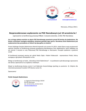 www.pzbad.pl www.pgenarodowy.pl Warszawa, 28 lipca 2016 r. Bezprecedensowe wydarzenie na PGE Narodowym już 10 września br.! zaproszenie na konferencję prasową PZBad: 2 sierpnia (wtorek), 12:00, PGE Narodowy Już w drugą sobotę września na płycie PGE Narodowego powstanie ponad 50 kortów do badmintona. Na boisku centralnym wystąpią największe światowe gwiazdy tego sportu. Narodowy Dzień Badmintona jest wydarzeniem bez precedensu w historii tej dyscypliny na świecie! Prezes Polskiego Związku Badmintona Marek Krajewski oraz prezes PL.2012+ Jakub Opara mają przyjemność zaprosić Państwa na konferencję prasową poświęconą Narodowemu Dniu Badmintona, która odbędzie się we wtorek 2 sierpnia w Loży Platynowej PGE Narodowego w Warszawie. Początek spotkania o godzinie 12:00. W konferencji prasowej wezmą też udział Nadia Zięba i Robert Mateusiak - reprezentanci Polski, którzy wystąpią w Igrzyskach Olimpijskich w Rio. Wstęp na konferencję na hasło: „Narodowy Dzień Badmintona” - na podstawie wydrukowanego zaproszenia lub obrazu zaproszenia na urządzeniu mobilnym. Wjazd na konferencję bramą numer 6 od Wybrzeża Szczecińskiego (parking na poziomie -3). Wejście dla niezmotoryzowanych tunelem VIP (brama numer 5). Zapraszamy! Polski Związek Badmintona ul. Zygmunta Słomińskiego 19/134 00-195 Warszawa tel.: 22 412 10 31, 22 412 10 32 [email protected]