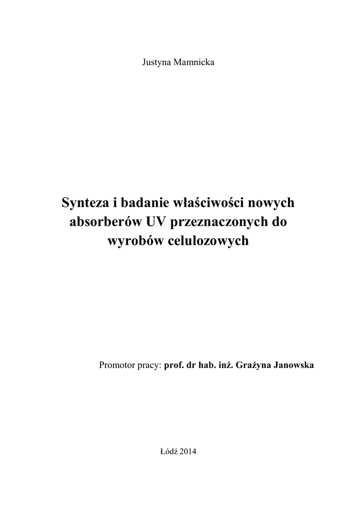 Justyna Mamnicka Synteza i badanie właściwości nowych absorberów UV przeznaczonych do wyrobów celulozowych Promotor pracy: prof. dr hab. inż. Grażyna Janowska Łódź 2014 W ramach przedstawionej rozprawy otrzymano i zbadano właściwości użytkowe nowej grupy rozpuszczalnych w wodzie absorberów UV pochodnych symetrycznej 1,3,5-triazyny, przeznaczonych do wyrobów z włókien celulozowych. W trakcie przeprowadzonych prac badawczych wykonano syntezę absorberów reaktywnych, zarówno tak zwanych absorberów „zimnych”, zdolnych do reakcji z włóknem celulozowym w temperaturze 35-40°C, jak i absorberów „gorących”, reagujących z włóknem w temperaturach 60-80°C lub 80°C. Otrzymano także absorbery o charakterze bezpośrednim. Sposoby wytwarzania tych absorberów objęte zostały jednym patentem udzielonym i dwoma zgłoszeniami patentowymi. Syntezę jednego spośród opracowanych absorberów powtórzono w skali półtechnicznej, a otrzymany produkt wykorzystano do modyfikacji różnych wyrobów włókienniczych, nadając im doskonałe właściwości barierowe (UPF>40). Część badań w większej skali była prowadzona w ramach realizowanego w Instytucie Włókiennictwa projektu Envirotex. Pierwszym etapem prowadzonych prac badawczych była synteza odpowiednich półproduktów - „diamin” i „tetraamin”, wykorzystanych następnie do otrzymania absorberów UV. Synteza półproduktów polegała na trzyetapowej reakcji kondensacji odpowiednich amin aromatycznych z 2,4,6-trichloro-1,3,5-triazyną (chlorkiem cyjanuru). Czystość półproduktów określono chromatograficznie oraz na podstawie analizy zawartości pierwszorzędowych aromatycznych grup aminowych poprzez miareczkowanie próbki w środowisku kwaśnym za pomocą mianowanego roztworu azotanu (III). Budowa chemiczna wybranych produktów została także potwierdzona za pomocą spektroskopii NMR. Proces otrzymywania reaktywnych absorberów UV polegał na kondensacji otrzymanych „diamin” lub „tetraamin” z chlorkiem cyjanuru użytym w ilości odpowiednio dwóch lub czterech moli chlorku cyjanuru na jeden mol półproduktu. Mieszaninę reakcyjną dzielono następnie na dwie równe porcje. Z jednej wydzielano „absorbery zimne” a drugą część mieszaniny reakcyjnej poddawano kondensacji z 4-(β-siarczanoetylo)-sulfonyloaniliną otrzymując „absorbery gorące”. Wszystkie etapy syntezy oraz otrzymane absorbery charakteryzowane były za pomocą chromatografii cienkowarstwowej, oznaczono w nich także zawartość chlorku sodu oraz chloru atomowego poprzez analizę konduktometryczną próbek przed i po alkalicznej hydrolizie za pomocą mianowanego roztworu azotanu (V) srebra. Dla wybranych produktów wykonano widma masowe (MALDI) oraz analizę elementarną w celu potwierdzenia obliczonej teoretycznie masy cząsteczkowej otrzymanych absorberów. Reakcje otrzymywania absorberów typu „bezpośredniego” również polegały w pierwszym etapie na kondensacji półproduktów – „diamin” i „tetraamin” z chlorkiem cyjanuru użytym w odpowiedniej proporcji w temperaturze 0-5°C, a następnie przeprowadzeniu kolejnych kondensacji w 35-40°C oraz 80-90°C z różnymi aminami alifatycznymi, aromatycznymi bądź amoniakiem. Podobnie jak poprzednio otrzymane produkty charakteryzowane były za pomocą chromatografii cienkowarstwowej. Oznaczono w nich także zawartość chlorku sodu poprzez analizę konduktometryczną próbek za pomocą mianowanego roztworu azotanu (V) srebra. Dla wybranych absorberów wykonano widma masowe (MALDI) oraz analizę elementarną. Wyniki tych badań potwierdziły założoną budowę otrzymanych produktów. W celu scharakteryzowania otrzymanych absorberów UV wykonano widma absorpcyjne ich roztworów wodnych w zakresie 250-400nm. Zgodnie z oczekiwaniem, wszystkie otrzymane absorbery wykazywały znaczną absorpcję molową (od około 54000 do ponad 150000 dm3/mol•cm). Badania użytkowe obejmujące także optymalizację składu kąpieli aplikacyjnych wykazały, że większość absorberów zarówno reaktywnych, jak i bezpośrednich wykazuje bardzo dobre powinowactwo do modyfikowanej dzianiny bawełnianej. Stopnie wyczerpywania z kąpieli aplikacyjnych były wysokie i bardzo wysokie dochodząc do 90-95% przy stężeniach absorbera 0,5-1,0% w stosunku do masy wyrobu włókienniczego. Kolejnym etapem pracy była ocena właściwości barierowych zmodyfikowanych wyrobów włókienniczych. Badania te przeprowadzono w Instytucie Włókiennictwa w Łodzi zgodnie z odpowiednią Normą Europejską. Wymienione wyżej, korzystne właściwości optyczne i aplikacyjne sprawiły, że zmodyfikowane wyroby włókiennicze uzyskały doskonałe właściwości barierowe przy niskich stężeniach otrzymanych absorberów (0,25-0,5% w stosunku do masy włókna). Wartości wskaźnika UPF niemal wszystkich dzianin zmodyfikowanych absorberami UV przekraczały wartość 40 (niekiedy nawet kilkunastokrotnie) pozwalając uzyskać wyroby zapewniające całkowitą ochronę przed promieniowaniem ultrafioletowym. Doskonałe właściwości barierowe wyrobów tekstylnych uzyskano zarówno dzięki ich modyfikacji podczas klasycznego procesu aplikacji metodą okresową, jak i w wyniku procesów prania wyrobów włókienniczych w kąpielach zawierających dodatek absorberów UV typu reaktywnego lub bezpośredniego. W przypadku absorberów reaktywnych trwałe właściwości ochronne uzyskano w procesach prania w temperaturze niższej niż to wynikało z budowy zastosowanego układu reaktywnego. Opracowana technologia objęta zgłoszeniem patentowym umożliwia nadanie właściwości ochronnych gotowym wyrobom włókienniczych również w warunkach domowych. Ostatnim etapem pracy były próby modyfikacji struktury wybranych absorberów UV lub stosowanych procesów aplikacyjnych w celu zapewnienia wyrobom włókienniczym dodatkowych właściwości użytkowych. Zmiana struktury absorberów UV poprzez wbudowanie w ich czą