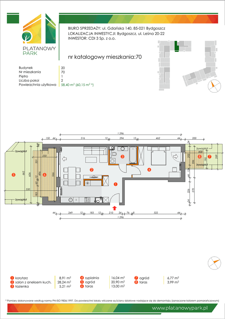 BIURO SPRZEDAŻY: ul. Gdańska 140, 85-021 Bydgoszcz LOKALIZACJA INWESTYCJI: Bydgoszcz, ul. Leśna 20-22 INWESTOR: CDI 3 Sp. z o.o. nr katalogowy mieszkania: 70 Budynek Nr mieszkania Piętro Liczba pokoi Powierzchnia użytkowa 20 70 1 2 58,40 m2 (60,15 m2 *) 1 296 44 516 12 294 12 462 44 200 24 150 24 żywopłot żywopłot 566 6 7 żywopłot 44 134 336 351 12 496 4 4 22 60 1 1 183 226 550 24 ZM żywopłot 270 606 662 5 8 269 3 3 190 202 400 250 24 44 249 12 183 12 210 24 76 8 522 44 1 296 1 korytarz 2 salon z aneksem kuch. 3 łazienka 8,91 m2 28,24 m2 5,21 m2 4 sypialnia 5 ogród 6 taras 16,04 m2 20,90 m2 13,00 m2 7 ogród 8 taras 6,77 m2 3,99 m2 * Pomiary dokonywane według normy PN-ISO 9836:1997. Do powierzchni lokalu wliczane są ściany działowe nadające się do demontażu (oznaczone kolorem pomarańczowym)