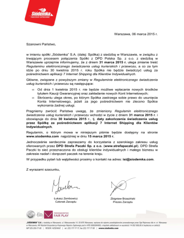 Warszawa, 06 marca 2015 r. Szanowni Państwo, w imieniu spółki „Siódemka” S.A. (dalej: Spółka) z siedzibą w Warszawie, w związku z trwającym procesem połączenia Spółki z DPD Polska Sp. z o.o. z siedzibą w Warszawie uprzejmie informujemy, że z dniem 31 marca 2015 r. ulega zmianie treść Regulaminu elektronicznego świadczenia usług kurierskich i przewozu, a co za tym idzie po dniu 30 kwietnia 2015 r. roku Spółka nie będzie świadczyć usług za pośrednictwem aplikacji 7 Internet Shipping dla Klientów Indywidualnych. Główne, związane z powyższym zmiany w Regulaminie elektronicznego świadczenia usług kurierskich i przewozu są następujące: • • Od dnia 1 kwietnia 2015 r. nie będzie możliwe wpłacanie nowych środków tytułem Kaucji Gwarancyjnej oraz zakładanie nowych Kont Internetowych; Skróceniu ulega okres, po którym Spółka zastrzega sobie prawo do usunięcia Konta Internetowego, jeżeli za jego pośrednictwem nie zlecono Spółce wykonania żadnej usługi. Pragniemy zwrócić Państwa uwagę, że zmieniony Regulamin elektronicznego świadczenia usług kurierskich i przewozu wchodzi w życie z dniem 31 marca 2015 r. i obowiązuje do dnia 30 kwietnia 2015 r., tj. daty zakończenia świadczenia usług przez Spółkę za pośrednictwem aplikacji 7 Internet Shipping dla Klientów Indywidualnych. Regulamin, o którym mowa w niniejszym piśmie będzie dostępny na stronie www.siodemka.com najpóźniej w dniu 15 marca 2015 r. Jednocześnie serdecznie zapraszamy do korzystania z szerokiego zakresu usług oferowanych przez DPD Strefa Paczki Sp. z o.o. (www.strefapaczki.pl). DPD Strefa Paczki to sieć przeznaczona do obsługi klientów indywidualnych i małego biznesu w zakresie nadań i doręczeń paczek na terenie kraju. W przypadku pytań lub wątpliwości prosimy o kontakt na adres: [email protected]. Z wyrazami szacunku, Łukasz Zembowicz Członek Zarządu Zbigniew Brzeziński Prezes Zarządu