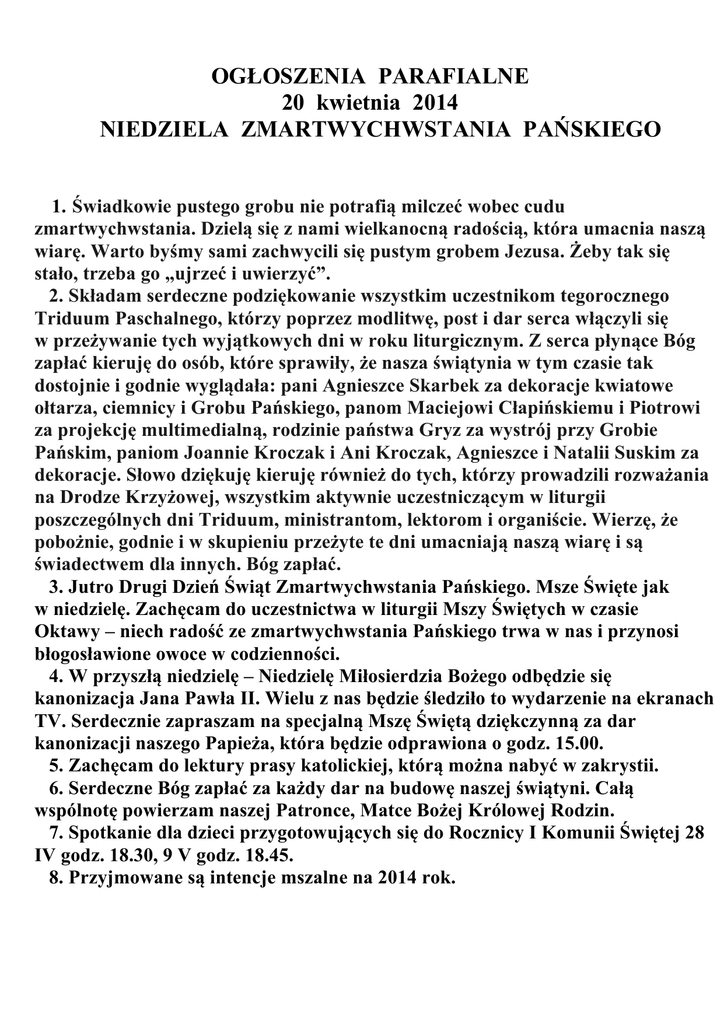 OGŁOSZENIA PARAFIALNE 20 kwietnia 2014 NIEDZIELA ZMARTWYCHWSTANIA PAŃSKIEGO 1. Świadkowie pustego grobu nie potrafią milczeć wobec cudu zmartwychwstania. Dzielą się z nami wielkanocną radością, która umacnia naszą wiarę. Warto byśmy sami zachwycili się pustym grobem Jezusa. Żeby tak się stało, trzeba go „ujrzeć i uwierzyć”. 2. Składam serdeczne podziękowanie wszystkim uczestnikom tegorocznego Triduum Paschalnego, którzy poprzez modlitwę, post i dar serca włączyli się w przeżywanie tych wyjątkowych dni w roku liturgicznym. Z serca płynące Bóg zapłać kieruję do osób, które sprawiły, że nasza świątynia w tym czasie tak dostojnie i godnie wyglądała: pani Agnieszce Skarbek za dekoracje kwiatowe ołtarza, ciemnicy i Grobu Pańskiego, panom Maciejowi Cłapińskiemu i Piotrowi za projekcję multimedialną, rodzinie państwa Gryz za wystrój przy Grobie Pańskim, paniom Joannie Kroczak i Ani Kroczak, Agnieszce i Natalii Suskim za dekoracje. Słowo dziękuję kieruję również do tych, którzy prowadzili rozważania na Drodze Krzyżowej, wszystkim aktywnie uczestniczącym w liturgii poszczególnych dni Triduum, ministrantom, lektorom i organiście. Wierzę, że pobożnie, godnie i w skupieniu przeżyte te dni umacniają naszą wiarę i są świadectwem dla innych. Bóg zapłać. 3. Jutro Drugi Dzień Świąt Zmartwychwstania Pańskiego. Msze Święte jak w niedzielę. Zachęcam do uczestnictwa w liturgii Mszy Świętych w czasie Oktawy – niech radość ze zmartwychwstania Pańskiego trwa w nas i przynosi błogosławione owoce w codzienności. 4. W przyszłą niedzielę – Niedzielę Miłosierdzia Bożego odbędzie się kanonizacja Jana Pawła II. Wielu z nas będzie śledziło to wydarzenie na ekranach TV. Serdecznie zapraszam na specjalną Mszę Świętą dziękczynną za dar kanonizacji naszego Papieża, która będzie odprawiona o godz. 15.00. 5. Zachęcam do lektury prasy katolickiej, którą można nabyć w zakrystii. 6. Serdeczne Bóg zapłać za każdy dar na budowę naszej świątyni. Całą wspólnotę powierzam naszej Patronce, Matce Bożej Królowej Rodzin. 7. Spotkanie dla dzieci przygotowujących się do Rocznicy I Komunii Świętej 28 IV godz. 18.30, 9 V godz. 18.45. 8. Przyjmowane są intencje mszalne na 2014 rok.