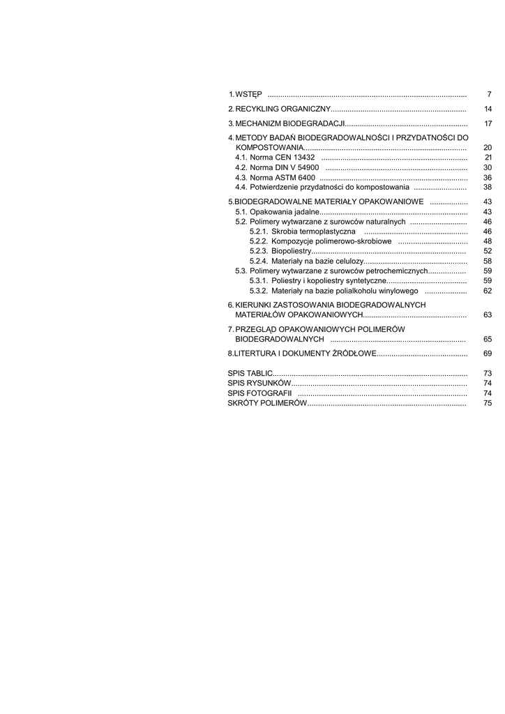 1. WSTĘP .............................................................................................. 7 2. RECYKLING ORGANICZNY................................................................ 14 3. MECHANIZM BIODEGRADACJI.......................................................... 17 4. METODY BADAŃ BIODEGRADOWALNOŚCI I PRZYDATNOŚCI DO KOMPOSTOWANIA............................................................................. 4.1. Norma CEN 13432 ..................................................................... 4.2. Norma DIN V 54900 ................................................................... 4.3. Norma ASTM 6400 ...................................................................... 4.4. Potwierdzenie przydatności do kompostowania ......................... 20 21 30 36 38 5.BIODEGRADOWALNE MATERIAŁY OPAKOWANIOWE .................. 5.1. Opakowania jadalne...................................................................... 5.2. Polimery wytwarzane z surowców naturalnych ........................... 5.2.1. Skrobia termoplastyczna ................................................. 5.2.2. Kompozycje polimerowo-skrobiowe ................................. 5.2.3. Biopoliestry......................................................................... 5.2.4. Materiały na bazie celulozy................................................. 5.3. Polimery wytwarzane z surowców petrochemicznych.................. 5.3.1. Poliestry i kopoliestry syntetyczne...................................... 5.3.2. Materiały na bazie polialkoholu winylowego .................... 43 43 46 46 48 52 58 59 59 62 6. KIERUNKI ZASTOSOWANIA BIODEGRADOWALNYCH MATERIAŁÓW OPAKOWANIOWYCH................................................. 63 7. PRZEGLĄD OPAKOWANIOWYCH POLIMERÓW BIODEGRADOWALNYCH ................................................................ 65 8.LITERTURA I DOKUMENTY ŹRÓDŁOWE........................................... 69 SPIS TABLIC............................................................................................ SPIS RYSUNKÓW................................................................................... SPIS FOTOGRAFII ................................................................................ SKRÓTY POLIMERÓW........................................................................... 73 74 74 75