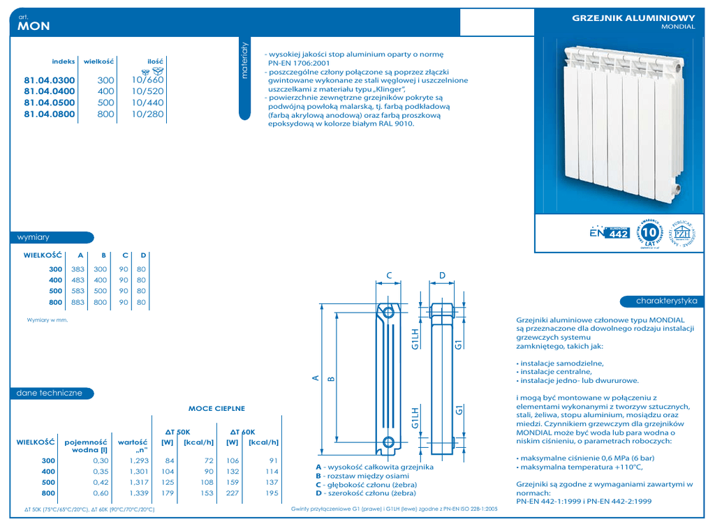 GRZEJNIK ALUMINIOWY art. MON indeks wielkość ilość 81.04.0300 81.04.0400 81.04.0500 81.04.0800 300 400 500 800 10/660 10/520 10/440 10/280 materiały MONDIAL - wysokiej jakości stop aluminium oparty o normę PN-EN 1706:2001 - poszczególne człony połączone są poprzez złączki gwintowane wykonane ze stali węglowej i uszczelnione uszczelkami z materiału typu „Klinger”, - powierzchnie zewnętrzne grzejników pokryte są podwójną powłoką malarską, tj. farbą podkładową (farbą akrylową anodową) oraz farbą proszkową epoksydową w kolorze białym RAL 9010. wymiary WIELKOŚĆ A B C D 300 383 300 90 80 400 483 400 90 80 500 583 500 90 80 800 883 800 90 80 charakterystyka Grzejniki aluminiowe członowe typu MONDIAL są przeznaczone dla dowolnego rodzaju instalacji grzewczych systemu zamkniętego, takich jak: Wymiary w mm. • instalacje samodzielne, • instalacje centralne, • instalacje jedno- lub dwururowe. dane techniczne i mogą być montowane w połączeniu z elementami wykonanymi z tworzyw sztucznych, stali, żeliwa, stopu aluminium, mosiądzu oraz miedzi. Czynnikiem grzewczym dla grzejników MONDIAL może być woda lub para wodna o niskim ciśnieniu, o parametrach roboczych: MOCE CIEPLNE ΔT 50K WIELKOŚĆ pojemność wodna [l] wartość „n” 300 0,30 1,293 400 0,35 1,301 500 0,42 1,317 800 0,60 1,339 ΔT 50K (75°C/65°C/20°C), ΔT 60K (90°C/70°C/20°C) ΔT 60K [kcal/h] [W] 84 72 106 91 104 90 132 114 125 108 159 137 179 153 227 195 [W] [kcal/h] A - wysokość całkowita grzejnika B - rozstaw między osiami C - głębokość członu (żebra) D - szerokość członu (żebra) Gwinty przyłączeniowe G1 (prawe) i G1LH (lewe) zgodne z PN-EN ISO 228-1:2005 • maksymalne ciśnienie 0,6 MPa (6 bar) • maksymalna temperatura +110°C, Grzejniki są zgodne z wymaganiami zawartymi w normach: PN-EN 442-1:1999 i PN-EN 442-2:1999