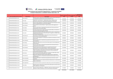 WYKAZ ZŁOŻONYCH KART PROJEKTÓW SUBREGIONALNYCH – MAŁOPOLSKA ZACHODNIA W RAMACH PODDZIAŁANIA 4.4.2 OBNIŻENIE POZIOMU NISKIEJ EMISJI - SPR LP Numer identyfikacyjny Karty projektu Projektodawca Wartość całkowita (w Koszty kwalifikowalne PLN) (w PLN) Tytuł projektu Wnioskowane dofinansowanie (w PLN) 1 RPOWM/SPR/MZ/2016/4.4.2/1 Gmina Mucharz Obniżenie poziomu niskiej emisji w Gminie Mucharz, poprzez wymianę źródeł ciepła w indywidualnych gospodarstwach domowych (biopaliwo i gaz) 4 430 000,00 3 189 600,00 3 189 600,00 2 RPOWM/SPR/MZ/2016/4.4.2/2 Gmina Kęty GMINA KĘTY. Czyste powietrze – NASZA wspólna sprawa. Likwidacja źródeł ogrzewania na paliwa stałe w indywidualnych gospodarstwach domowych 2 400 000,00 2 400 000,00 1 680 000,00 3 RPOWM/SPR/MZ/2016/4.4.2/3 Gmina Wolbrom Wymiana kotłów węglowych w indywidualnych gospodarstwach domowych na kotły gazowe i spalające biomasę na terenie Gminy Wolbrom 3 458 824,00 3 458 824,00 2 940 000,00 4 RPOWM/SPR/MZ/2016/4.4.2/4 Gmina Chełmek Czyste powietrze w Gminie Chełmek – Program wymiany kotłów węglowych na gazowe 705 000,00 700 000,00 400 000,00 5 RPOWM/SPR/MZ/2016/4.4.2/5 Gmina Babice Wymiana źródeł ciepła w indywidualnych gospodarstwach domowych (biomasa i paliwa gazowe) na terenie gminy Babice 1 271 064,00 1 088 472,00 700 000,00 6 RPOWM/SPR/MZ/2016/4.4.2/6 Gmina Olkusz Eliminacja niskosprawnych urządzeń grzewczych w Gminie Olkusz i ich wymiana na kotły wykorzystujące paliwa gazowe i biomasę 1 030 000,00 1 030 000,00 824 000,00 365 000,00 360 000,00 240 000,00 7 RPOWM/SPR/MZ/2016/4.4.2/7 Gmina Zator Wymiana przestarzałych źródeł ciepła zasilanych paliwem stałym w indywidualnych gospodarstwach domowych na terenie Gminy Zator i zastąpienie ich źródłami ciepła na biomasę lub paliwa gazowe 8 RPOWM/SPR/MZ/2016/4.4.2/8 Gmina Brzeszcze Eko- Brzeszcze. Obniżenie poziomu niskiej emisji na terenie Gminy Brzeszcze – dofinansowanie wymiany kotłów gazowych 420 000,00 420 000,00 240 000,00 9 RPOWM/SPR/MZ/2016/4.4.2/9 Gmina Tomice Wymiana kotłów węglowych na kotły gazowe w budynkach mieszkalnych na terenie Gminy Tomice 500 000,00 500 000,00 450 000,00 1 121 000,00 1 121 000,00 1 121 000,00 10 RPOWM/SPR/MZ/2016/4.4.2/10 Gmina Wadowice Wymiana źródeł ciepła w indywidualnych gospodarstwach domowych na terenie Gminy Wadowice 11 RPOWM/SPR/MZ/2016/4.4.2/11 Gmina Wieprz Ograniczenie niskiej emisji na terenie Gminy Wieprz poprzez montaż ekologicznych kotłów gazowych 1 886 806,50 1 871 806,50 1 591 035,52 2 131 646,00 2 007 700,00 1 260 000,00 1 533 000,00 1 533 000,00 1 350 000,00 260 500,00 240 000,00 120 000,00 2 964 706,00 2 964 706,00 2 520 000,00 385 000,00 380 000,00 323 000,00 12 RPOWM/SPR/MZ/2016/4.4.2/12 Gmina Alwernia Wymiana źródeł ciepła w indywidualnych gospodarstwach domowych (biomasa i paliwa gazowe) w Gminie Alwernia 13 RPOWM/SPR/MZ/2016/4.4.2/13 Gmina Oświęcim Wymiana niesprawnych źródeł grzewczych w gospodarstwach domowych zlokalizowanych na terenie gminy Oświęcim – biomasa i paliwa gazowe Ograniczenie poziomu niskiej emisji w Gminie Stryszów poprzez wymianę źródeł ciepła w indywidualnych gospodarstwach domowych na kotły nowej generacji wykorzystujące paliwa gazowe i biomasę 14 RPOWM/SPR/MZ/2016/4.4.2/14 Gmina Stryszów 15 RPOWM/SPR/MZ/2016/4.4.2/15 Gmina Klucze 16 RPOWM/SPR/MZ/2016/4.4.2/16 Gmina Brzeźnica 17 RPOWM/SPR/MZ/2016/4.4.2/17 Gmina Andrychów Wymiana przestarzałych kotłów węglowych na nowoczesne źródła ciepła, zasilane gazem i biomasą w gminach Bukowno, Klucze i Bolesław Ograniczenie niskiej emisji poprzez wymianę kotłów i pieców na źródła ciepła spalające paliwa gazowe w indywidualnych gospodarstwach domowych na terenie gminy Brzeźnica Wymiana źródeł ciepła w indywidualnych gospodarstwach domowych w gminie Andrychów 1 632 400,00 1 632 400,00 1 387 540,00 911 600,00 911 600,00 774 860,00 18 RPOWM/SPR/MZ/2016/4.4.2/18 Gmina Andrychów Budowa preizolowanej sieci cieplnej do budynków zlokalizowanych na osiedlu Żwirki i Wigury w Andrychowie 19 RPOWM/SPR/MZ/2016/4.4.2/19 Gmina Spytkowice Poprawa jakości powietrza i ograniczenie niskiej emisji na terenie Gminy Spytkowice 2 086 500,00 2 076 500,00 1 715 025,00 20 RPOWM/SPR/MZ/2016/4.4.2/20 Gmina Libiąż Obniżenie poziomu niskiej emisji na obszarze Gminy Libiąż poprzez wymianę starych kotłów węglowych na kotły gazowe 320 000,00 320 000,00 308 000,00 21 RPOWM/SPR/MZ/2016/4.4.2/21 Gmina Kalwaria Zebrzydowska Wymiana systemów ogrzewania z węglowego na ogrzewanie paliwem gazowym w budynkach i lokalach mieszkalnych na terenie Gminy Kalwaria Zebrzydowska 612 000,00 510 000,00 420 000,00 30 425 046,50 28 715 608,50 23 554 060,52 suma