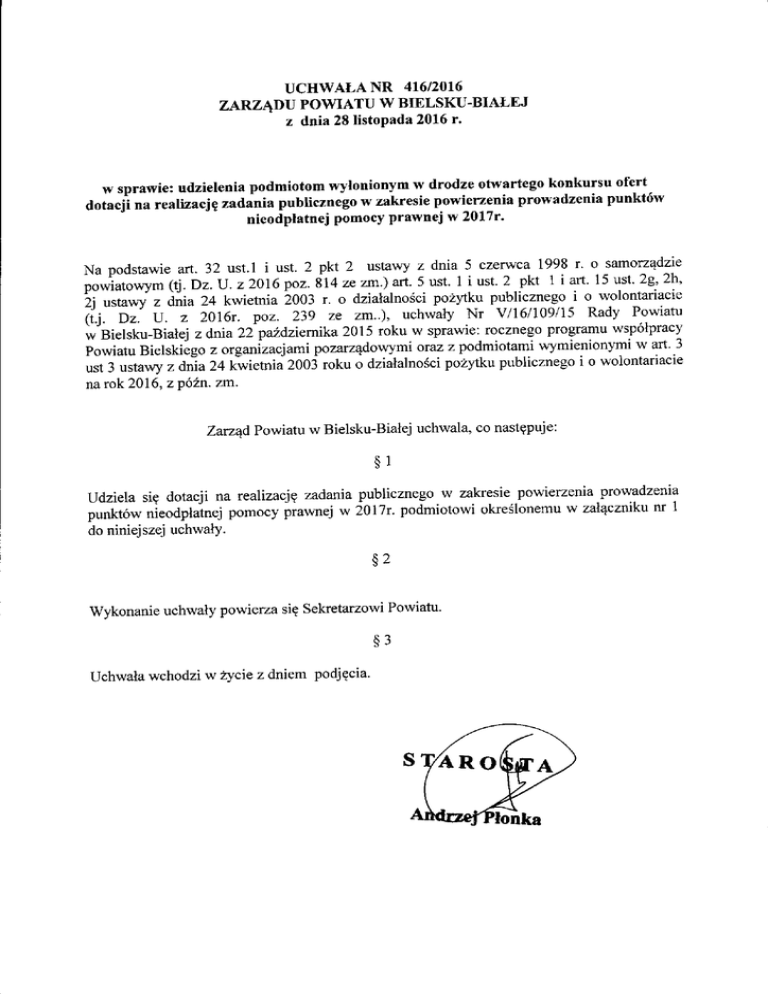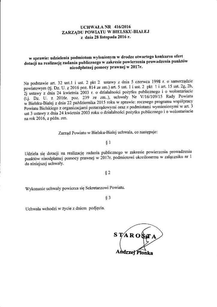UCHWAŁA NR 416lż016 ZARZĄDU POWIATU W BIELSKU-BIAŁEJ z dnia 29listopada 201ó r. ofert w sprawie: udzielenia podmiotom wylonionym w drodze otwartego konkursu punktów prowadzenia dotacji na realizację zadania publicznego w zakresie p_owierzenia 2O17r, w prawnej nieodpłatnej pomocy Na podstawie art. 32 ust.l i ust. 2 pkt 2 ustawy z dnia 5 czenvca 1998 r. o samorządzie po*iuto*y. (tj, Dz, U. z2016poz.§14 ze zm.).art,_5. ust, 1iust,2 pkt 1iań, 15 ust,29,2h, ;i ;"*y ,;iia 24 kwietnia )0ol .. o działalnościpożytku publicznego i o wolontariacie (rj. I]. z 2076r. poz. ż39 ze zm..), uchwĄ Nr V/l6i109l15 Rady Powiatu '".' z dnia 22 pńdziemika 2015 roku w sprawie: rocznego programu współpracy *'si"lrku_liuł.j po*iuto Bielskiógo z organlzacjami pozarządowymi oraz z podmiotami wymienionymi w art. 3 .., l ,uu*y z diia zą tiri"tniu zooj roku Ó działalnościpoĄ,tku publicznego i o wolontariacie na rok 2016, z późn. zm. Zarząd Powia§l w Bielsku-Białej uchwala, co następuje: §1 udziela się dotacji na realizację zadania publicznego w zakresie powierzenia prowadzenia nr 1 puŃtów nieodpłatnej pomocy piarrnei * ż0l7r. podmiotowi określonemu w załączniku do niniej szej uchwały. §2 Wykonanie uchwały powierza się Seketarzowi Powiatu, §3 Uchwała wchod zi w Ęcie z dnięm podjęcia, Zalącznik 41612016 nr l do UchwaĘ nr z dnia 28 listopada 20l6 ws. Udzielenia podmiotom wylonionym w drodze otwańego konkursu ofert dotacji na realżację zadań publicznych w zakresie powierzenia prowadzenia punktów nieodpłatnej pomocy prawnej w 20l7r. wykaz zadań i podmiotów je realizu.|ących z zakresu powierzenia prowadzenia punktów nieodpłatnej pomocy prawnej w 2017r.. którym udziela się na 20l7 r. dotacj i ze irodków budżetu Państw-a. l,p. Nazwa Organizacji Nazwa zadania Kwota zatwierd zona przez Zarząd Izll' Powierzenie zadania publicznego t. lt'undacja Pomocy Prawnej ,,SUBVENIO", ul. Aleksandrowicka 53a Prowadzenie Punktu nr III (Bestwina, Wilamowice) Nieodpłatnej Pomocy Prawnej Fundacja Pomocy Prawnej prowadzenie punktu nr v (Szcąy r k, B uczkowi ce, WiI kow ice) Nieodpłatnej Pomocy Prawnej Fundacja Pomocy Prawnej ,,SUBVENIO", ul. Aleksandrowicka 53a ,13-300 Bielsko- Biala. prowadzenie punklu nr vI (Jasienica, Jaworze) Nieodpłatnej PomocJ) Prownej 43_300 Bielsko- Biała. 2. ,,SUBVENIO", ul. Aleksandrowicka 53a 43-300 Bielsko- Biała. J. RAZEM: 60.725,88 zl. 60,725,88 zł. 60.725,88 zł. 182.177,,64