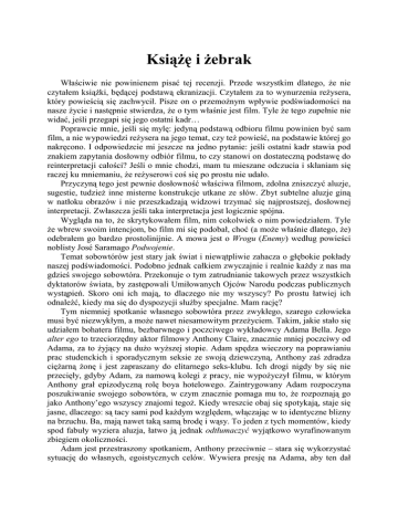 KsiąŜę i Ŝebrak Właściwie nie powinienem pisać tej recenzji. Przede wszystkim dlatego, Ŝe nie czytałem ksiąŜki, będącej podstawą ekranizacji. Czytałem za to wynurzenia reŜysera, który powieścią się zachwycił. Pisze on o przemoŜnym wpływie podświadomości na nasze Ŝycie i następnie stwierdza, Ŝe o tym właśnie jest film. Tyle Ŝe tego zupełnie nie widać, jeśli przegapi się jego ostatni kadr… Poprawcie mnie, jeśli się mylę: jedyną podstawą odbioru filmu powinien być sam film, a nie wypowiedzi reŜysera na jego temat, czy teŜ powieść, na podstawie której go nakręcono. I odpowiedzcie mi jeszcze na jedno pytanie: jeśli ostatni kadr stawia pod znakiem zapytania dosłowny odbiór filmu, to czy stanowi on dostateczną podstawę do reinterpretacji całości? Jeśli o mnie chodzi, mam tu mieszane odczucia i skłaniam się raczej ku mniemaniu, Ŝe reŜyserowi coś się po prostu nie udało. Przyczyną tego jest pewnie dosłowność właściwa filmom, zdolna zniszczyć aluzje, sugestie, tudzieŜ inne misterne konstrukcje utkane ze słów. Zbyt subtelne aluzje giną w natłoku obrazów i nie przeszkadzają widzowi trzymać się najprostszej, dosłownej interpretacji. Zwłaszcza jeśli taka interpretacja jest logicznie spójna. Wygląda na to, Ŝe skrytykowałem film, nim cokolwiek o nim powiedziałem. Tyle Ŝe wbrew swoim intencjom, bo film mi się podobał, choć (a moŜe właśnie dlatego, Ŝe) odebrałem go bardzo prostolinijnie. A mowa jest o Wrogu (Enemy) według powieści noblisty José Saramago Podwojenie. Temat sobowtórów jest stary jak świat i niewątpliwie zahacza o głębokie pokłady naszej podświadomości. Podobno jednak całkiem zwyczajnie i realnie kaŜdy z nas ma gdzieś swojego sobowtóra. Przekonuje o tym zatrudnianie takowych przez wszystkich dyktatorów świata, by zastępowali Umiłowanych Ojców Narodu podczas publicznych wystąpień. Skoro oni ich mają, to dlaczego nie my wszyscy? Po prostu łatwiej ich odnaleźć, kiedy ma się do dyspozycji słuŜby specjalne. Mam rację? Tym niemniej spotkanie własnego sobowtóra przez zwykłego, szarego człowieka musi być niezwykłym, a moŜe nawet niesamowitym przeŜyciem. Takim, jakie stało się udziałem bohatera filmu, bezbarwnego i poczciwego wykładowcy Adama Bella. Jego alter ego to trzeciorzędny aktor filmowy Anthony Claire, znacznie mniej poczciwy od Adama, za to Ŝyjący na duŜo wyŜszej stopie. Adam spędza wieczory na poprawianiu prac studenckich i sporadycznym seksie ze swoją dziewczyną, Anthony zaś zdradza cięŜarną Ŝonę i jest zapraszany do elitarnego seks-klubu. Ich drogi nigdy by się nie przecięły, gdyby Adam, za namową kolegi z pracy, nie wypoŜyczył filmu, w którym Anthony grał epizodyczną rolę boya hotelowego. Zaintrygowany Adam rozpoczyna poszukiwanie swojego sobowtóra, w czym znacznie pomaga mu to, Ŝe rozpoznają go jako Anthony’ego wszyscy znajomi tegoŜ. Kiedy wreszcie obaj się spotykają, staje się jasne, dlaczego: są tacy sami pod kaŜdym względem, włączając w to identyczne blizny na brzuchu. Ba, mają nawet taką samą brodę i wąsy. To jeden z tych momentów, kiedy spod fabuły wyziera aluzja, łatwo ją jednak odtłumaczyć wyjątkowo wyrafinowanym zbiegiem okoliczności. Adam jest przestraszony spotkaniem, Anthony przeciwnie – stara się wykorzystać sytuację do własnych, egoistycznych celów. Wywiera presję na Adama, aby ten dał mu na jeden dzień swoje ubranie i samochód oraz (zwłaszcza) jego dziewczynę, Mary. Adam nie pozostaje mu dłuŜny – idzie do apartamentu sobowtóra, by z właściwą sobie nieśmiałością i wahaniem udawać Anthony’ego przed jego Ŝoną Helen. Jak myślicie, czy panie dały się oszukać? Macie rację, nie do końca. O ile jednak Mary zareagowała oburzeniem i wściekłością, to ze strony Helen Adam doświadczył jedynie cichej akceptacji. Nie zdradzę, oczywiście, czym to się skończyło. Dość, Ŝe Ŝebrak zajął miejsce księcia, natomiast ksiąŜę… ale tego właśnie nie mogę powiedzieć. No to wróćmy jeszcze na koniec do podświadomości i związanej z nią interpretacji filmu. Chodzi oczywiście o sugestię, Ŝe Adam i Anthony to ta sama osoba, dokładniej zaś Anthony jest projekcją ukrytych pragnień i obsesji ciapowatego Adama. Widać to w końcówce filmu (którą sobie darowaliśmy), kiedy Adam zaczyna wchodzić w rolę swojego sobowtóra. W przeciwieństwie do ksiąŜki w filmie jednak tak karkołomnej tezy nie da się przeforsować – w końcu widz ma przed oczami dwie osoby, a nie jedną. No i całkiem dobrze, Ŝe dwie: Jake Gyllenhaal jest świetnym aktorem i jego grę ogląda się z przyjemnością, a w tym wypadku przyjemność jest nawet podwójna. Andrzej Prószyński P. S. Projekcją podświadomości Adama jest niewątpliwie nadnaturalnej wielkości pająk przemierzający Toronto (widać tę scenę na plakacie poniŜej). Jest to aluzja do rzeźby Louise Bourgeois zatytułowanej Maman (obok). Nazwa pochodzi stąd, Ŝe jest to pajęczyca z odwłokiem pełnym jaj. Jak to się ma do ciąŜy Helen, nie ośmielę się wyrokować. Podobnie nie będę próbował tłumaczyć motta filmu, które brzmi: Chaos to porządek, którego jeszcze nie rozumiemy. Wróg (Enemy), Hiszpania, Kanada, 2013 ocena FilmWeb: 6,1, IMDb: 6.8 reŜyseria: Denis Villeneuve scenariusz: Javier Gullón według powieści José Saramago Podwojenie muzyka: Danny Bensi, Saunder Jurriaans zdjęcia: Nicolas Bolduc gatunek: thriller czas trwania: 1 godz. 27 min. Obsada: Jake Gyllenhaal (Adam Bell, Anthony Claire) Mélanie Laurent (Mary, dziewczyna Adama) Sarah Gadon (Helen, Ŝona Anthony’ego) Isabella Rossellini (matka Adama) Joshua Peace (kolega Adama z pracy) Tim Post (konsjerŜ Anthony'ego) Kedar Brown (straŜnik w agencji aktorskiej) Darryl Dinn (pracownik wypoŜyczalni wideo)