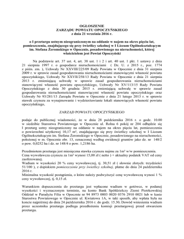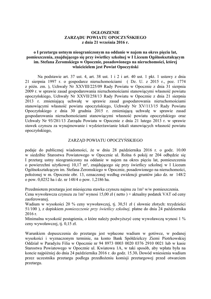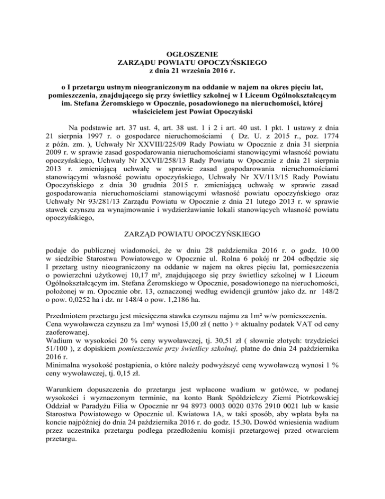 OGŁOSZENIE ZARZĄDU POWIATU OPOCZYŃSKIEGO z dnia 21 września 2016 r. o I przetargu ustnym nieograniczonym na oddanie w najem na okres pięciu lat, pomieszczenia, znajdującego się przy świetlicy szkolnej w I Liceum Ogólnokształcącym im. Stefana Żeromskiego w Opocznie, posadowionego na nieruchomości, której właścicielem jest Powiat Opoczyński Na podstawie art. 37 ust. 4, art. 38 ust. 1 i 2 i art. 40 ust. 1 pkt. 1 ustawy z dnia 21 sierpnia 1997 r. o gospodarce nieruchomościami ( Dz. U. z 2015 r., poz. 1774 z późn. zm. ), Uchwały Nr XXVIII/225/09 Rady Powiatu w Opocznie z dnia 31 sierpnia 2009 r. w sprawie zasad gospodarowania nieruchomościami stanowiącymi własność powiatu opoczyńskiego, Uchwały Nr XXVII/258/13 Rady Powiatu w Opocznie z dnia 21 sierpnia 2013 r. zmieniającą uchwałę w sprawie zasad gospodarowania nieruchomościami stanowiącymi własność powiatu opoczyńskiego, Uchwały Nr XV/113/15 Rady Powiatu Opoczyńskiego z dnia 30 grudnia 2015 r. zmieniającą uchwałę w sprawie zasad gospodarowania nieruchomościami stanowiącymi własność powiatu opoczyńskiego oraz Uchwały Nr 93/281/13 Zarządu Powiatu w Opocznie z dnia 21 lutego 2013 r. w sprawie stawek czynszu za wynajmowanie i wydzierżawianie lokali stanowiących własność powiatu opoczyńskiego, ZARZĄD POWIATU OPOCZYŃSKIEGO podaje do publicznej wiadomości, że w dniu 28 października 2016 r. o godz. 10.00 w siedzibie Starostwa Powiatowego w Opocznie ul. Rolna 6 pokój nr 204 odbędzie się I przetarg ustny nieograniczony na oddanie w najem na okres pięciu lat, pomieszczenia o powierzchni użytkowej 10,17 m², znajdującego się przy świetlicy szkolnej w I Liceum Ogólnokształcącym im. Stefana Żeromskiego w Opocznie, posadowionego na nieruchomości, położonej w m. Opocznie obr. 13, oznaczonej według ewidencji gruntów jako dz. nr 148/2 o pow. 0,0252 ha i dz. nr 148/4 o pow. 1,2186 ha. Przedmiotem przetargu jest miesięczna stawka czynszu najmu za 1m² w/w pomieszczenia. Cena wywoławcza czynszu za 1m² wynosi 15,00 zł ( netto ) + aktualny podatek VAT od ceny zaoferowanej. Wadium w wysokości 20 % ceny wywoławczej, tj. 30,51 zł ( słownie złotych: trzydzieści 51/100 ), z dopiskiem pomieszczenie przy świetlicy szkolnej, płatne do dnia 24 października 2016 r. Minimalna wysokość postąpienia, o które należy podwyższyć cenę wywoławczą wynosi 1 % ceny wywoławczej, tj. 0,15 zł. Warunkiem dopuszczenia do przetargu jest wpłacone wadium w gotówce, w podanej wysokości i wyznaczonym terminie, na konto Bank Spółdzielczy Ziemi Piotrkowskiej Oddział w Paradyżu Filia w Opocznie nr 94 8973 0003 0020 0376 2910 0021 lub w kasie Starostwa Powiatowego w Opocznie ul. Kwiatowa 1A, w taki sposób, aby wpłata była na koncie najpóźniej do dnia 24 października 2016 r. do godz. 15.30. Dowód wniesienia wadium przez uczestnika przetargu podlega przedłożeniu komisji przetargowej przed otwarciem przetargu. Uczestnicy przetargu zobowiązani są posiadać dokument tożsamości oraz potwierdzenia wpłacenia wadium. Uczestnicy biorą udział w przetargu osobiście lub przez pełnomocników. Wadium wniesione przez uczestnika przetargu, który przetarg wygrał zalicza się na poczet czynszu, natomiast pozostałym oferentom zostanie zwrócone bez oprocentowania, nie później niż przed upływem 3 dni od daty zamknięcia przetargu. Osiągnięta w przetargu najwyższa stawka czynszu za 1m² może być waloryzowana w oparciu o średnioroczny wskaźnik wzrostu cen towarów i usług konsumpcyjnych za rok poprzedni. W przypadku gdy osoba ustalona jako najemca, nie przystąpi bez usprawiedliwienia do zawarcia umowy, w miejscu i terminie wyznaczonym przez organizatora przetargu, organizator przetargu może odstąpić od zawarcia umowy, a wpłacone wadium nie podlega zwrotowi. Zarząd Powiatu Opoczyńskiego zastrzega sobie jedynie z ważnych powodów, prawo odwołania przetargu, niezwłocznie podając informację do publicznej wiadomości, podając przyczynę odwołania przetargu. Szczegółowe informacje w przedmiotowej sprawie można uzyskać w Starostwie Powiatowym w Opocznie w Wydziale Geodezji, Kartografii, Katastru i Gospodarki Nieruchomościami, ul. Rolna 6, pokój nr 204 lub telefonicznie pod nr tel. 44 7361552 wew. 39. Ogłoszenie wywieszono na tablicach ogłoszeń Starostwa Powiatowego w Opocznie oraz zamieszczono na stronie internetowej pod adresem www.bip.opocznopowiat.pl, na okres 30 dni tj. od 21 września 2016 r. do 20 października 2016 r. Opoczno, dnia 21 września 2016 r.