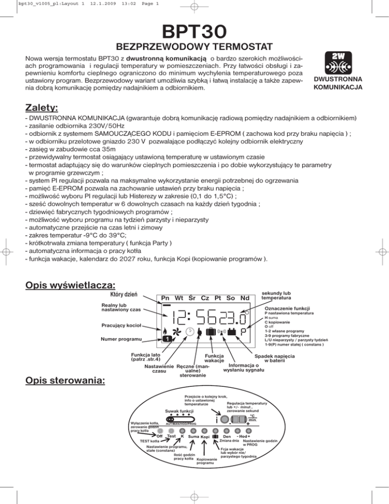 bpt30_v1005_pl:Layout 1 12.1.2009 13:02 Page 1 BPT30 BEZPRZEWODOWY TERMOSTAT Nowa wersja termostatu BPT30 z dwustronną komunikacją o bardzo szerokich możliwościach programowania i regulacji temperatury w pomieszczeniach. Przy łatwości obsługi i zapewnieniu komfortu cieplnego ograniczono do minimum wychylenia temperaturowego poza ustawiony program. Bezprzewodowy wariant umożliwia szybką i łatwą instalację a także zapewnia dobrą komunikację pomiędzy nadajnikiem a odbiornikiem. DWUSTRONNA KOMUNIKACJA Zalety: - DWUSTRONNA KOMUNIKACJA (gwarantuje dobrą komunikację radiową pomiędzy nadajnikiem a odbiornikiem) - zasilanie odbiornika 230V/50Hz - odbiornik z systemem SAMOUCZĄCEGO KODU i pamięciom E-EPROM ( zachowa kod przy braku napięcia ) ; - w odbiorniku przelotowe gniazdo 230 V pozwalające podłączyć kolejny odbiornik elektryczny - zasięg w zabudowie cca 35m - przewidywalny termostat osiągający ustawioną temperaturę w ustawionym czasie - termostat adaptujący się do warunków cieplnych pomieszczenia i po dobie wykorzystujący te parametry w programie grzewczym ; - system PI regulacji pozwala na maksymalne wykorzystanie energii potrzebnej do ogrzewania - pamięć E-EPROM pozwala na zachowanie ustawień przy braku napięcia ; - możliwość wyboru PI regulacji lub Histerezy w zakresie (0,1 do 1,5°C) ; - sześć dowolnych temperatur w 6 dowolnych czasach na każdy dzień tygodnia ; - dziewięć fabrycznych tygodniowych programów ; - możliwość wyboru programu na tydzień parzysty i nieparzysty - automatyczne przejście na czas letni i zimowy - zakres temperatur -9°C do 39°C; - krótkotrwała zmiana temperatury ( funkcja Party ) - automatyczna informacja o pracy kotła - funkcja wakacje, kalendarz do 2027 roku, funkcja Kopi (kopiowanie programów ). Opis wyświetlacza: Który dzień Pn Wt Śr Cz Pt So Nd Realny lub nastawiony czas Oznaczenie funkcji P nastawiona temperatura H suma C kopiowanie O off 1-2 własne programy 3-9 programy fabryczne L/U nieparzysty / parzysty tydzień 1-9(P) numer stałej ( constans ) Pracujący kocioł Numer programu Opis sterowania: sekundy lub temperatura Funkcja lato Funkcja Spadek napięcia (patrz .str.4) wakacje w baterii Informacja o Nastawienie Ręczne (manwysłaniu sygnału ualne) czasu sterowanie Przejście o kolejny krok, info o ustawionej Regulacja temperatury temperaturze lub +/- minut , zerowanie sekund Suwak funkcji Wyłączenie kotła, zerowanie godzin pracy kotła Test TEST kotła Nastawienie programu, stałe (constans) Ilość godzin pracy kotła Kopiowanie programu Zmiana dnia Nastawienie godzin w PROG Fcja wakacje lub wybór nie/ parzystego tygodnia bpt30_v1005_pl:Layout 1 12.1.2009 13:02 Page 2 INSTRUKCJA OBSŁUGI Dzięki nowej technologii SAMOUCZĄCEGO KODU przy pierwszym podłączeniu nie kodujemy zestawu gdyż został on zakodowany fabrycznie . Montujemy zgodnie z instrukcją I BPT30 jest gotowy do pracy . Gdy na wyświetlaczu ukaże się napis Er:r i mruga symbol “ “, to oznacza błędy w komunikacji pomiędzy nadajnikiem a odbiornikiem: a, odbiornik nie podłączony, sprawdzić podłączenie ( na odbiorniku świecąca zielona LED )! b, do odbiornika wprowadzony zły kod lub zmazana pamięć (na odbiorniku mruga czerwona LED = pusta pamięć), przeprowadzamy KODOWANIE: 1, Naciskamy na cca 1,5 s “PRZYCISK FUNKCJI “ na odbiorniku ( patrz str.6 rys.3 ) mruga przemiennie żółta i czerwona LED i odbiornik czeka na kod (tzw.nauka kodu). 2, Na nadajniku naciskamy " TEST " i na wyświetlaczu ukaże się sygnał wysłania kodu “ “. 3, Przyjęcie kodu na odbiorniku jest potwierdzane równoczesnym mrugnięciem żółtej i czerwonej diody . 4, Po przyjęciu kodu dojdzie automatycznie do kilkakrotnego włączenia i wyłączenia kotła. Funkcja suwaka: (od lewej strony) 1.AUT : termostat pracuje według nastawionego programu .Wybór programu prowadzi się przyciskiem " K ". Gdy nastawiony jest nie/parzysty tydzień nie ma możliwości wyboru programu. Programy 1-2 są nastawialne , 3-9 są fabryczne. 2. MAN : służy do ręcznie nastawianej temperatury. Na wyświetlaczu symbol “ “. W tej funkcji można nastawić dwie temperatury (wybór nastawionych temperatur prowadzimy naciskając “ K ” i przyciskiem. “+/-°C”). 3. HOD : nastawienie aktualnego czasu i daty Na LCD wyświetlony zostanie czas i mruga indykacja GODZIN przyciskiem +/nastawiamy czas zatwierdzając przyciskiem" i " (zapis).Podobnie postępujemy ustawiając minuty i sekundy. Po nastawieniu czasu wyświetli się data dzień, miesiąc, rok (rok oznaczony dwoma ostatnimi cyframi 08 = 2008). Postępujemy nastawiając podobnie jak czas. Dzień tygodnia zaznaczony zostanie automatycznie. 4. PROG : programowanie termostatu i nastawienie constans Suwak funkcji Termostat umożliwia nastawienie sześciu pasm czasowo temperaturowych na każdy dzień. Przyciskiem “K ” (constans) wybieramy - programowanie pierwszego, drugiego programu - przegląd fabrycznych programów (3 do 9, patrz str.7, wprowadzenie zmian) - nastawienie constans ( Fce ). Wybór prog.1-2 Wybór prog.3-9 Nastawienie constans Programowanie: 1, Suwak funkcji w pozycję PROG. Wybór 2, Naciskamy " K " i wybieramy program ( 2, 3 do 9 ) . (programy 3 do 9 są fabryczne ale mozna je zmieniać!) 3, Naciskamy “+/-Hod.” nastawiamy czas włączenia a przyciskiem “+/-°C” temperaturę pierwszego pasma programu. (nastawiamy początek zmiany temperatury!) 4, Naciskamy " i " (zapis), czym przechodzimy do drugiego pasma w tym dniu. (na wyświetlaczu numery pasm od do ). 5, Przy nastawieniu wszystkich temperatur w tym dniu czas nastawiamy “+/-Hod a temperaturę +/-°C”. Po nastawieniu ostatniej temperatury w tym dniu BPT30 przejdzie automatycznie do dnia następnego co na LCD wyświetla się podkreśleniem “ “ dnia kolejnego. Gdy nie wykorzystujemy w danym dniu wszystkich 6 pasm przechodzimy do kolejnego dnia naciskając " i "(zapis) lub przycisk “ Den ”. 6, Po zaprogramow