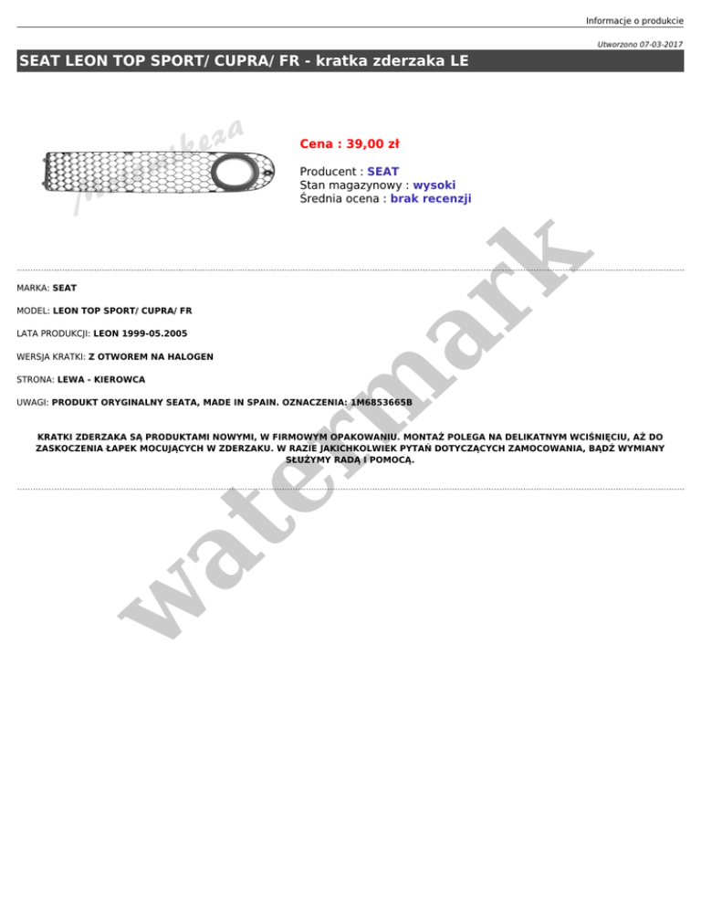 Informacje o produkcie Utworzono 07-03-2017 SEAT LEON TOP SPORT/ CUPRA/ FR - kratka zderzaka LE Cena : 39,00 zł MARKA: SEAT MODEL: LEON TOP SPORT/ CUPRA/ FR LATA PRODUKCJI: LEON 1999-05.2005 er m ar k Producent : SEAT Stan magazynowy : wysoki Średnia ocena : brak recenzji WERSJA KRATKI: Z OTWOREM NA HALOGEN STRONA: LEWA - KIEROWCA UWAGI: PRODUKT ORYGINALNY SEATA, MADE IN SPAIN. OZNACZENIA: 1M6853665B w at KRATKI ZDERZAKA SĄ PRODUKTAMI NOWYMI, W FIRMOWYM OPAKOWANIU. MONTAŻ POLEGA NA DELIKATNYM WCIŚNIĘCIU, AŻ DO ZASKOCZENIA ŁAPEK MOCUJĄCYCH W ZDERZAKU. W RAZIE JAKICHKOLWIEK PYTAŃ DOTYCZĄCYCH ZAMOCOWANIA, BĄDŹ WYMIANY SŁUŻYMY RADĄ I POMOCĄ.