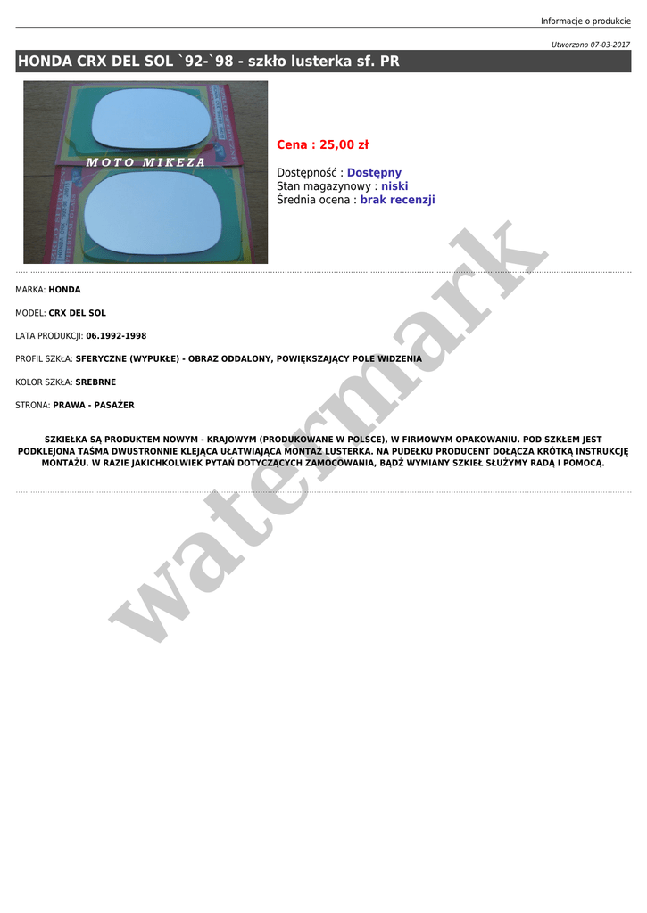 Informacje o produkcie Utworzono 07-03-2017 HONDA CRX DEL SOL `92-`98 - szkło lusterka sf. PR Cena : 25,00 zł MARKA: HONDA MODEL: CRX DEL SOL LATA PRODUKCJI: 06.1992-1998 er m ar k Dostępność : Dostępny Stan magazynowy : niski Średnia ocena : brak recenzji PROFIL SZKŁA: SFERYCZNE (WYPUKŁE) - OBRAZ ODDALONY, POWIĘKSZAJĄCY POLE WIDZENIA KOLOR SZKŁA: SREBRNE STRONA: PRAWA - PASAŻER w at SZKIEŁKA SĄ PRODUKTEM NOWYM - KRAJOWYM (PRODUKOWANE W POLSCE), W FIRMOWYM OPAKOWANIU. POD SZKŁEM JEST PODKLEJONA TAŚMA DWUSTRONNIE KLEJĄCA UŁATWIAJĄCA MONTAŻ LUSTERKA. NA PUDEŁKU PRODUCENT DOŁĄCZA KRÓTKĄ INSTRUKCJĘ MONTAŻU. W RAZIE JAKICHKOLWIEK PYTAŃ DOTYCZĄCYCH ZAMOCOWANIA, BĄDŻ WYMIANY SZKIEŁ SŁUŻYMY RADĄ I POMOCĄ.