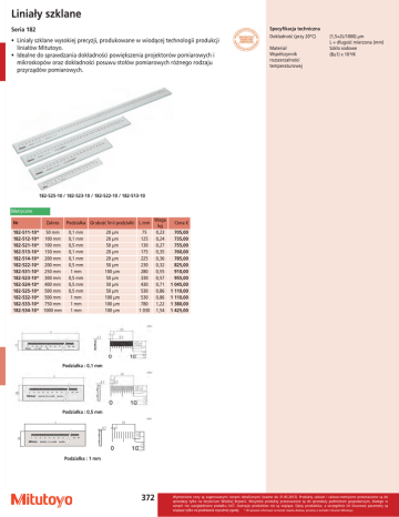 Liniały szklane Specyfikacja techniczna Seria 182 • Liniały szklane wysokiej precyzji, produkowane w wiodącej technologii produkcji liniałów Mitutoyo. • Idealne do sprawdzania dokładności powiększenia projektorów pomiarowych i mikroskopów oraz dokładności posuwu stołów pomiarowych różnego rodzaju przyrządów pomiarowych. Dokładność (przy 20°C) Materiał Współczynnik rozszerzalności temperaturowej (1,5+2L/1000) µm L = długość mierzona (mm) Szkło sodowe (8±1) x 10-6/K 182-525-10 / 182-523-10 / 182-522-10 / 182-513-10 Metryczne Nr Zakres 182-511-10* 50 mm 182-512-10* 100 mm 182-521-10* 100 mm 182-513-10* 150 mm 182-514-10* 200 mm 182-522-10* 200 mm 182-531-10* 250 mm 182-523-10* 300 mm 182-524-10* 400 mm 182-525-10* 500 mm 182-532-10* 500 mm 182-533-10* 750 mm 182-534-10* 1000 mm Waga kg 75 0,23 125 0,24 130 0,27 175 0,35 225 0,36 230 0,32 280 0,55 330 0,57 430 0,71 530 0,86 530 0,86 780 1,22 1 030 1,54 Podziałka Grubość linii podziałki L mm 0,1 mm 0,1 mm 0,5 mm 0,1 mm 0,1 mm 0,5 mm 1 mm 0,5 mm 0,5 mm 0,5 mm 1 mm 1 mm 1 mm 20 µm 20 µm 50 µm 20 µm 20 µm 50 µm 100 µm 50 µm 50 µm 50 µm 100 µm 100 µm 100 µm Cena € 705,00 735,00 755,00 760,00 785,00 825,00 910,00 955,00 1 045,00 1 110,00 1 110,00 1 380,00 1 425,00 Podziałka : 0,1 mm Podziałka : 0,5 mm mm L 10 1 2 2 36 3.5 5 4.7 Podziałka : 1 mm 372 Wymienione ceny są sugerowanymi cenami detalicznymi (ważne do 31.05.2013). Produkty calowe i calowo-metryczne przeznaczone są do sprzedaży tylko na terytorium Wielkiej Brytanii. Wszystkie produkty przeznaczone są do sprzedaży podmiotom gospodarczym, dlatego w cenach nie uwzględniono podatku VAT. Ilustracje produktów nie są wiążące. Opisy produktów, a szczególnie ich kluczowe parametry są wiążące tylko na podstawie wyraźnej zgody. * W sprawie informacji na temat czasów dostaw, prosimy o kontakt z biurem Mitutoyo. Liniały szklane o niskiej rozszerzalności Specyfikacja techniczna Dokładność (przy 20°C) Materiał Współczynnik rozszerzalności temperaturowej Podziałka Grubość linii podziałki Seria 182 (0,5+L/1000) µm L = długość mierzona (mm) Szkło o niskim współczynniku rozszerzalności (0,00±0,02) x 10-6/K • Liniały szklane wysokiej precyzji, o niskim współczynniku rozszerzalności temperaturowej, produkowane w wiodącej technologii produkcji liniałów Mitutoyo. • Gwarantowana wysoka dokładność umożliwiająca wykorzystanie jako wzorzec do kalibracji innych liniałów. 1 mm 4 µm 182-502-60 182-501-60 Metryczne Nr Zakres 182-501-60* 250 mm 182-502-50* 500 mm 182-502-60* 500 mm L mm W mm T mm 280 530 530 20 30 30 10 20 20 Waga Cena € kg 0,75 3 850,00 1,8 7 335,00 1,8 7 335,00 182-502-60 : z certyfikatem JCSS w języku angielskim Wymienione ceny są sugerowanymi cenami detalicznymi (ważne do 31.05.2013). Produkty calowe i calowo-metryczne przeznaczone są do sprzedaży tylko na terytorium Wielkiej Brytanii. Wszystkie produkty przeznaczone są do sprzedaży podmiotom gospodarczym, dlatego w cenach nie uwzględniono podatku VAT. Ilustracje produktów nie są wiążące. Opisy produktów, a szczególnie ich kluczowe parametry są wiążące tylko na podstawie wyraźnej zgody. * W sprawie informacji na temat czasów dostaw, prosimy o kontakt z biurem Mitutoyo. 373