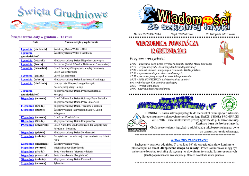 stajenka Święta i ważne daty w grudniu 2013 roku Data 1 grudnia (niedziela) 2 grudnia (poniedziałek) 3 grudnia (wtorek) 4 grudnia (Środa) 5 grudnia (czwartek) 6 grudnia (piątek) 7 grudnia (sobota) 8 grudnia (niedziela) 9 grudnia (poniedziałek) 10 grudnia (wtorek) 11 grudnia (Środa) 13 grudnia (piątek) 17 grudnia (wtorek) 18 grudnia (Środa) 19 grudnia (czwartek) 20 grudnia (piątek) 21 grudnia (sobota) 22 grudnia 24 grudnia 25 grudnia 26 grudnia 28 grudnia 31 grudnia (niedziela) (wtorek) (Środa) (czwartek) (sobota) (wtorek) Numer 2/2013/2014 Wyd. ZS Parkowo 28 listopada 2013 roku Nazwa święta / wydarzenia Światowy Dzień Walki z AIDS Światowy Dzień Walki z Uciskiem Międzynarodowy Dzień Niepełnosprawnych Barbórka (Dzień Górnika, Naftowca i Gazownika) Dzień Pomocy Cierpiącym, Międzynarodowy Dzień Wolontariusza Dzień św. Mikołaja Międzynarodowy Dzień Lotnictwa Cywilnego Uroczystość Niepokalanego Poczęcia Najświętszej Maryi Panny Międzynarodowy Dzień Przeciwdziałania Korupcji Dzień Odlewnika, Dzień Ochrony Praw Dziecka, Międzynarodowy Dzień Praw Człowieka Międzynarodowy Dzień Terenów Górskich Światowy Dzień Telewizji dla Dzieci, Dzień Księgarza Dzień bez Przekleństw Międzynarodowy Dzień Emigrantów Dzień Narodów Zjednoczonych dla Współpracy Południe - Południe Międzynarodowy Dzień Solidarności Początek astronomicznej zimy - najkrótszy dzień roku Światowy Dzień Wody Wigilia Bożego Narodzenia Boże Narodzenie (pierwszy dzień) Boże Narodzenie (drugi dzień) Międzynarodowy Dzień Pocałunku Sylwester Program uroczystości: 17.00 – powitanie gości przez Dyrektora Zespołu Szkół p. Marię Cisowską; 17.15 - wręczenie tytułu „Zasłużony dla Ziemi Rogozińskiej” 17.30 – montaż słowno - muzyczny o Powstaniu Wielkopolskim; 17.50 – wprowadzenie pocztów sztandarowych; 17.55 – prezentacja wybranych uczestników powstania; 18.25 – APEL POWSTAŃCZY i złożenie zniczy pamięci pod symbolicznym Krzyżem Powstańczym; 18.50 – wystąpienia gości; 19.00 - wyprowadzenie sztandarów; UCZNIOWIE- nasza szkoła przystąpiła do sieci szkół promujących zdrowie, dlatego szukamy ciekawych pomysłów na logo NASZEJ SZKOŁY PROMUJĄCEJ ZDROWIE. Prace konkursowe proszę zgłaszać do p. E. Baranowskiej. Konkurs trwa do końca stycznia. Obok prezentujemy logo, które zdobi każdą szkołę promującą zdrowie do czasu stworzenia własnego. ************************************************************** KONKURS PLASTYCZNY Zachęcamy uczniów oddziału „0” oraz klas I-VI do wzięcia udziału w konkursie plastycznym na temat „Bezpieczna droga do szkoły”. Prace konkursowe mogą być wykonane dowolną techniką plastyczną i w dowolnym formacie. Zainteresowanych proszę o przekazanie swoich prac p. Monice Nowak do końca grudnia. **************************************************************