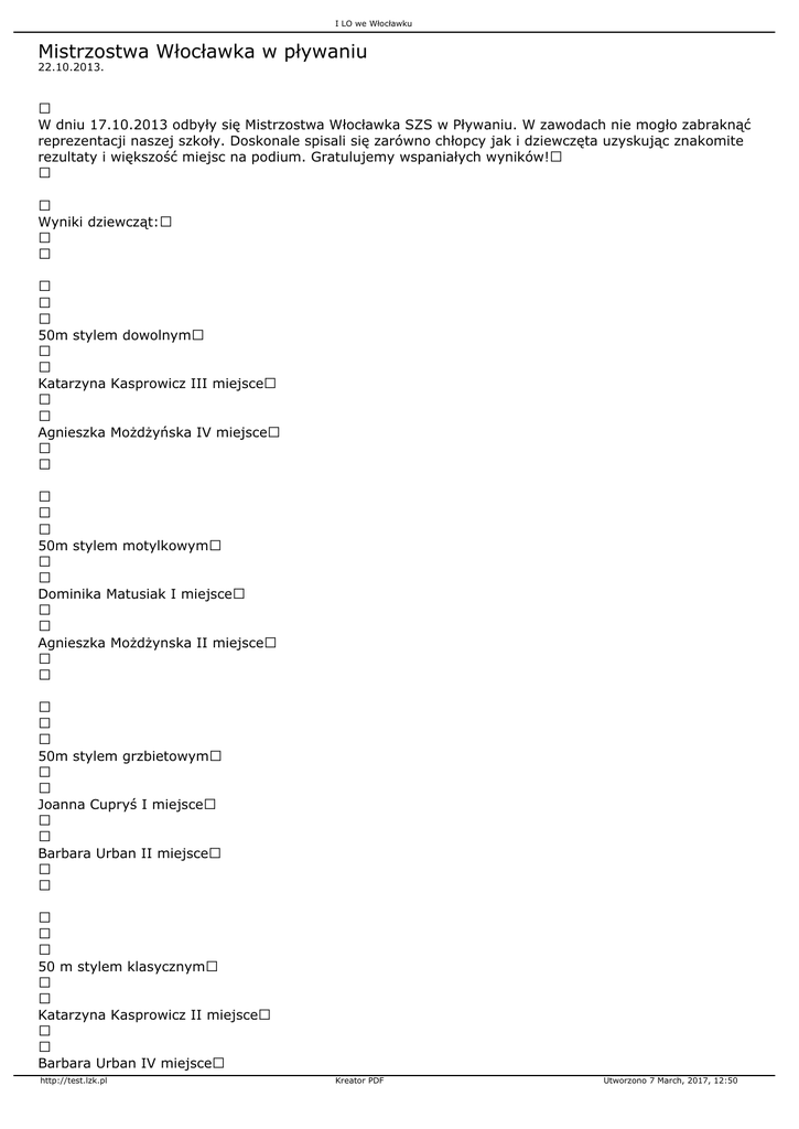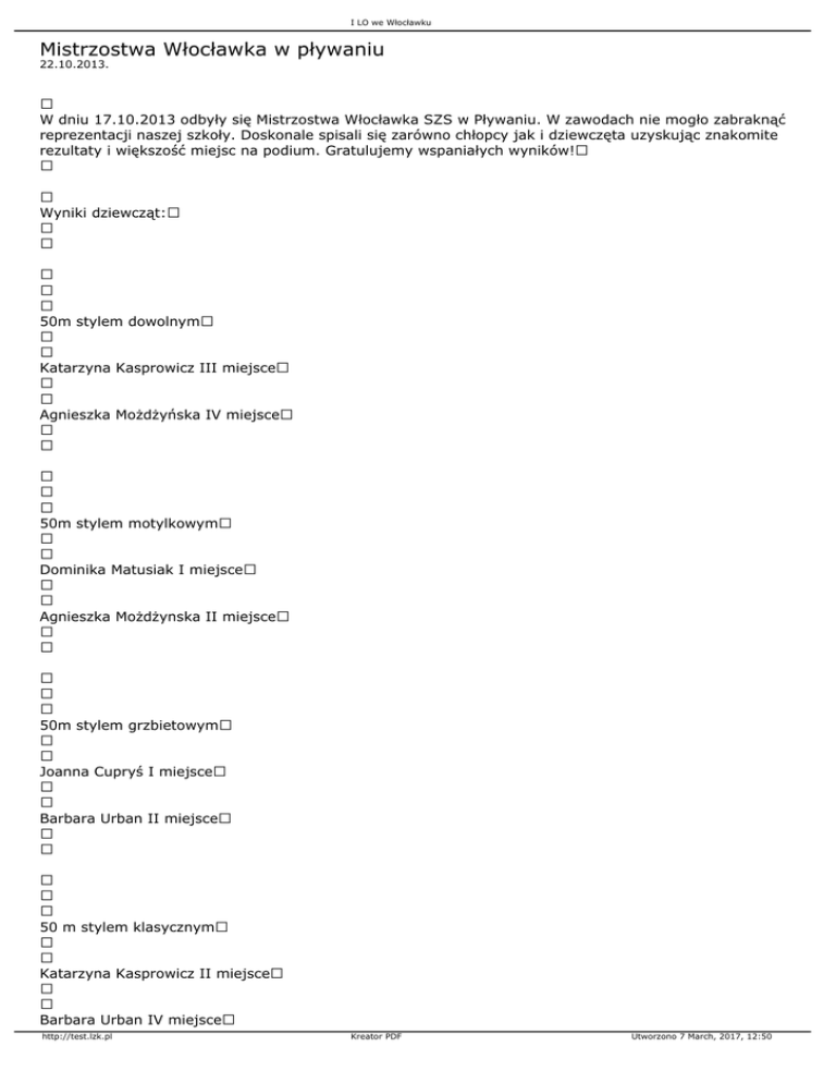 I LO we Włocławku Mistrzostwa Włocławka w pływaniu 22.10.2013. W dniu 17.10.2013 odbyły się Mistrzostwa Włocławka SZS w Pływaniu. W zawodach nie mogło zabraknąć reprezentacji naszej szkoły. Doskonale spisali się zarówno chłopcy jak i dziewczęta uzyskując znakomite rezultaty i większość miejsc na podium. Gratulujemy wspaniałych wyników! Wyniki dziewcząt: 50m stylem dowolnym Katarzyna Kasprowicz III miejsce Agnieszka Możdżyńska IV miejsce 50m stylem motylkowym Dominika Matusiak I miejsce Agnieszka Możdżynska II miejsce 50m stylem grzbietowym Joanna Cupryś I miejsce Barbara Urban II miejsce 50 m stylem klasycznym Katarzyna Kasprowicz II miejsce Barbara Urban IV miejsce http://test.lzk.pl Kreator PDF Utworzono 7 March, 2017, 12:50 I LO we Włocławku 100m stylem zmiennym Dominika Matusiak I miejsce Joanna Cupryś II miejsce Sztafeta 4x50 m stylem dowolnym I miejsce Joanna Cupryś Dominika Matusiak Katarzyna Kasprowicz Barbara Urban Wyniki chłopców: 50m stylem dowolnym Witold Smok I miejsce Paweł Wypijewsk iV miejsce 50m stylem motylkowym Konrad Ruciński I miejsce http://test.lzk.pl Kreator PDF Utworzono 7 March, 2017, 12:50 I LO we Włocławku Łukasz Popławski III miejsce 50m stylem grzbietowym Michał Misiak I miejsce Paweł Wypijewski III miejsce 50 m stylem klasycznym Witold Smok I miejsce Łukasz Popławski III miejsce 100m stylem zmiennym Michał Misiak I miejsce Konrad Rucińsk iII miejsce Sztafeta 4x50 m stylem dowolnym I miejsce Witold Smok Łukasz Popławski Konrad Ruciński Michał Misiak http://test.lzk.pl Kreator PDF Utworzono 7 March, 2017, 12:50 I LO we Włocławku http://test.lzk.pl Kreator PDF Utworzono 7 March, 2017, 12:50